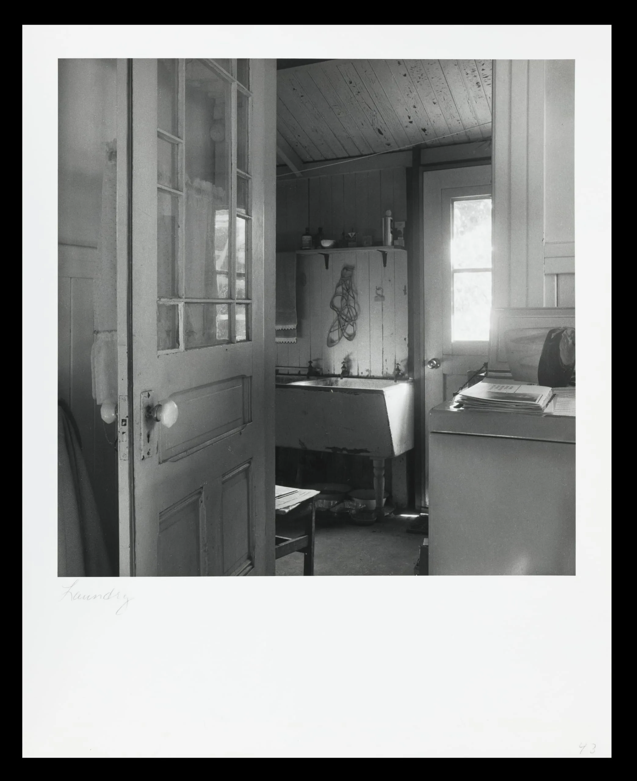 Black and white photograph of a modest interior room seen through an open paneled door, with a deep sink, white cabinet, and bright window beyond