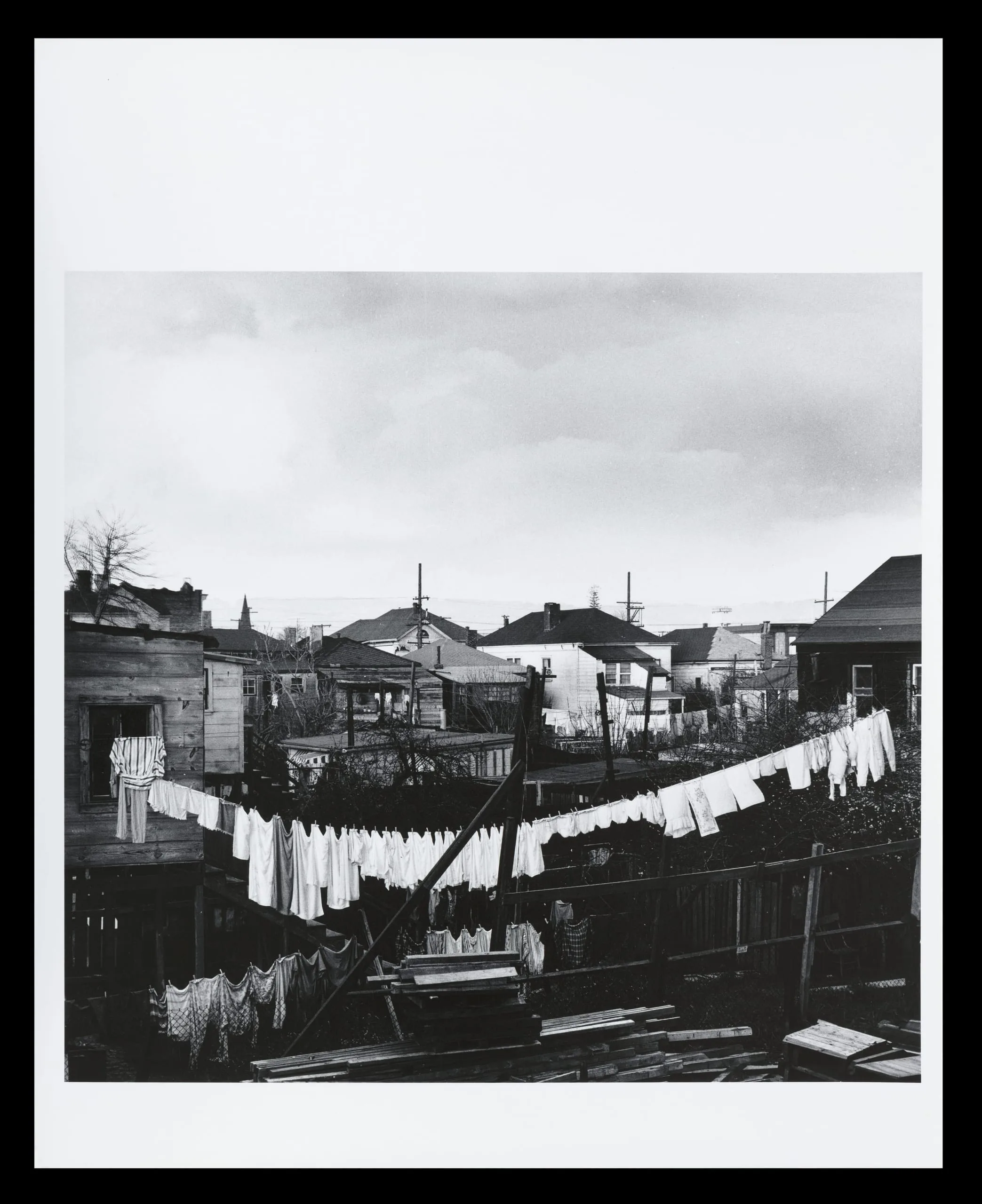 Black and white photograph of an urban backyard with two sagging clotheslines hung with dozens of white garments, wooden structures and neighborhood rooftops in the distance beneath an overcast sky