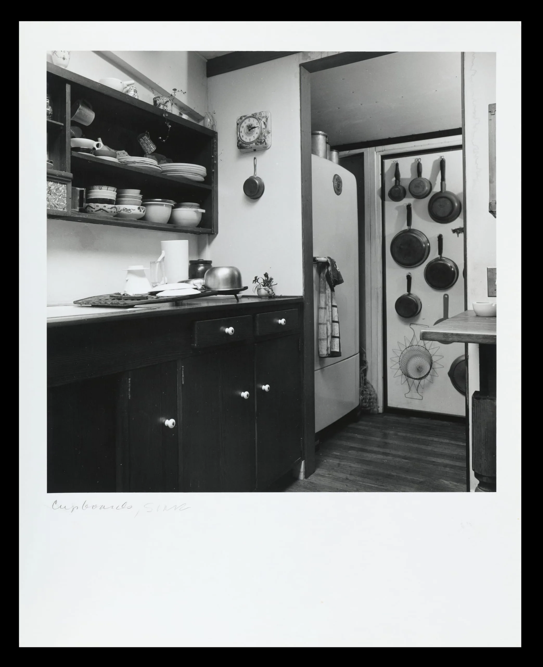 Black and white photograph of a kitchen interior with open shelving holding dishes, dark wood cabinets, and a doorway revealing pots and pans hung on a panel beside a refrigerator