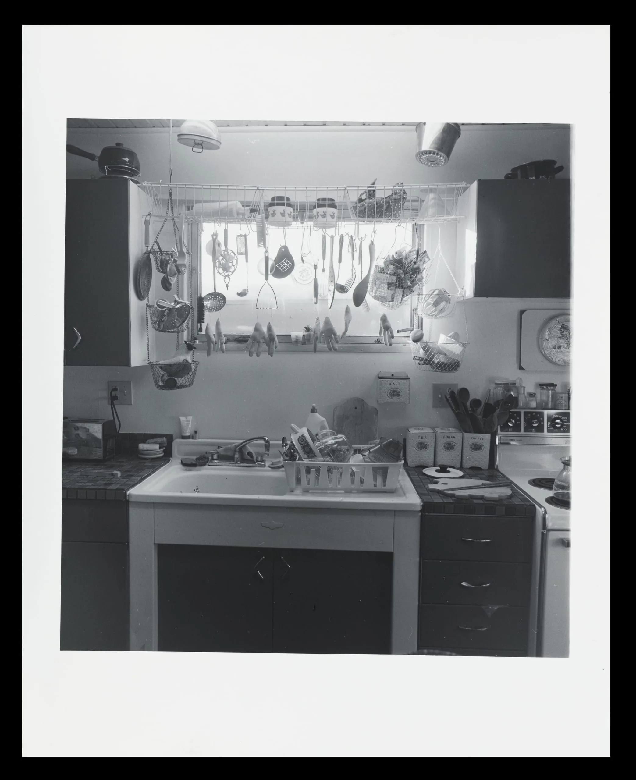 Black and white photograph of a residential kitchen interior, centered on a sink below a bright window hung with rows of kitchen utensils, with counters, cabinets, and a stove visible on either side