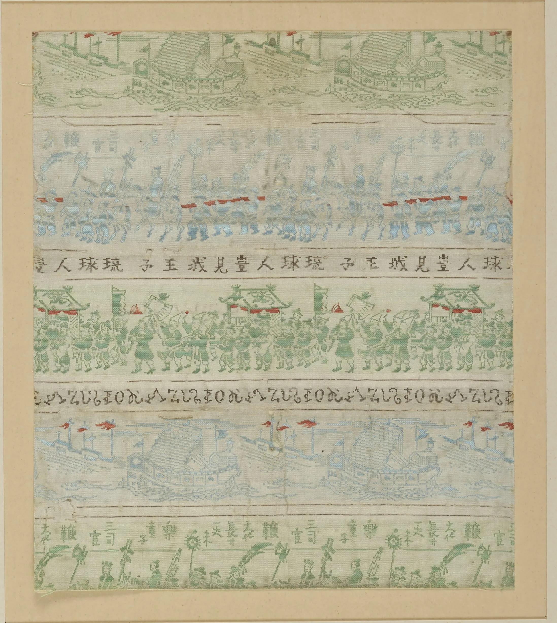 - Silk plain weave with silk and gilt-paper-strip supplementary-weft patterning bound in plain weave (lampas)