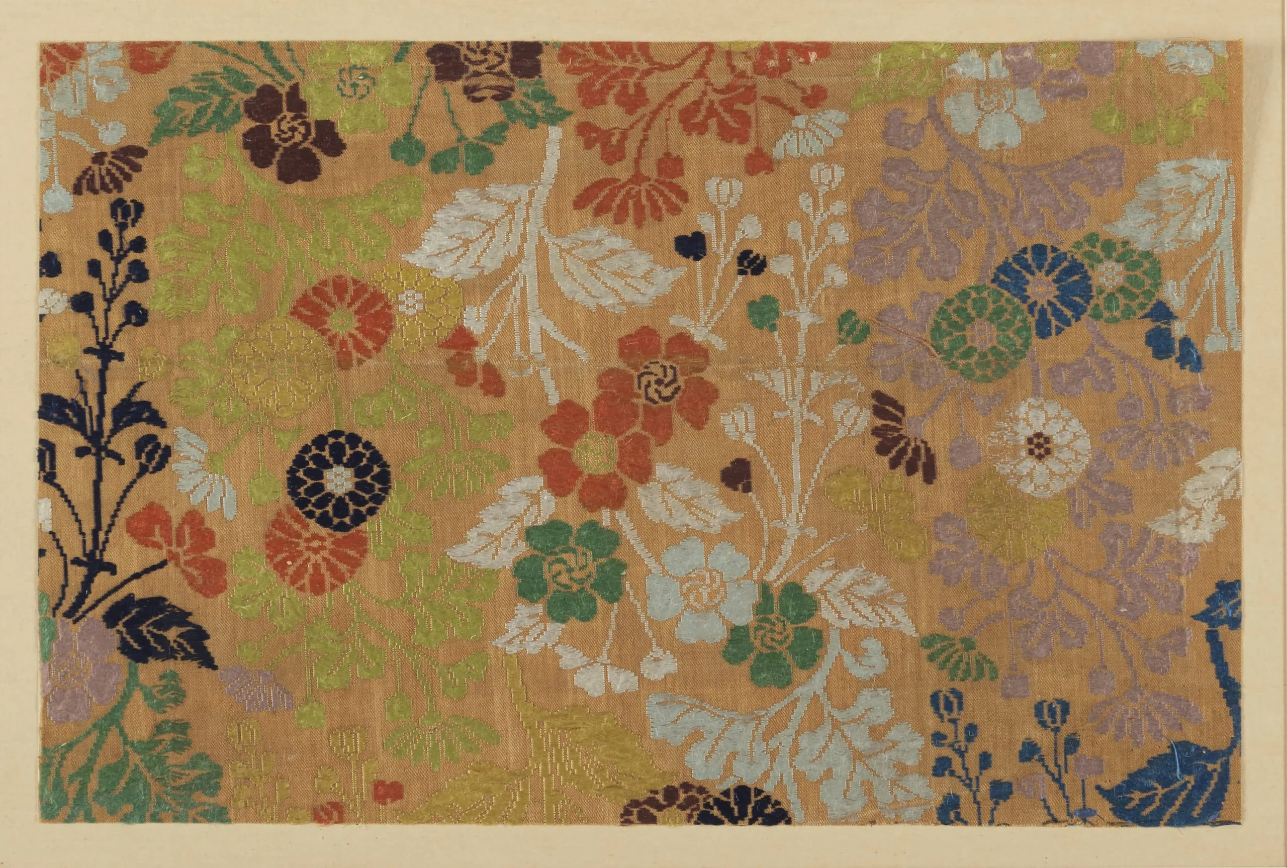 Silk brocade textile fragment with an allover floral pattern in terracotta, navy blue, white, green, and lavender on a warm amber-gold ground