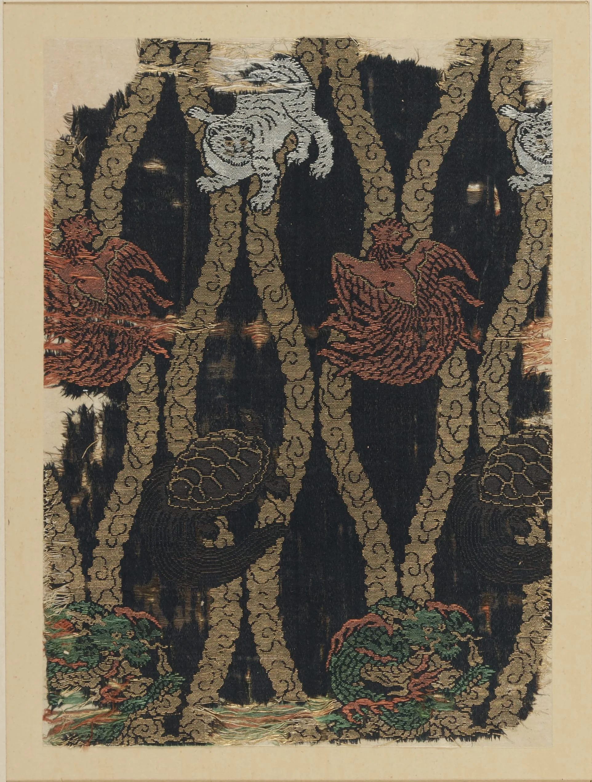 - Silk satin with silk and gilt-paper-strip supplementary-weft patterning bound in plain weave (lampas)