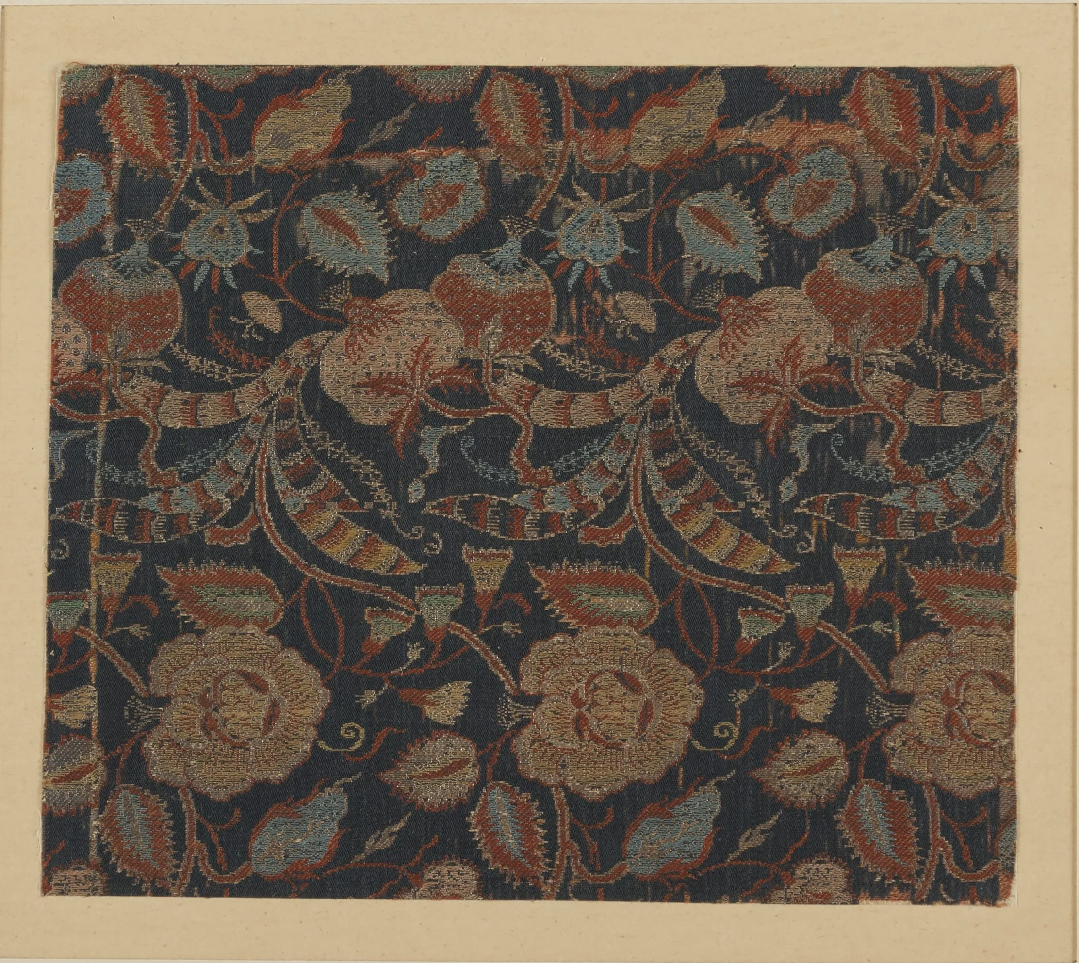 - Silk twill with silk and gilt-paper-strip supplementary-weft patterning bound in twill (lampas)