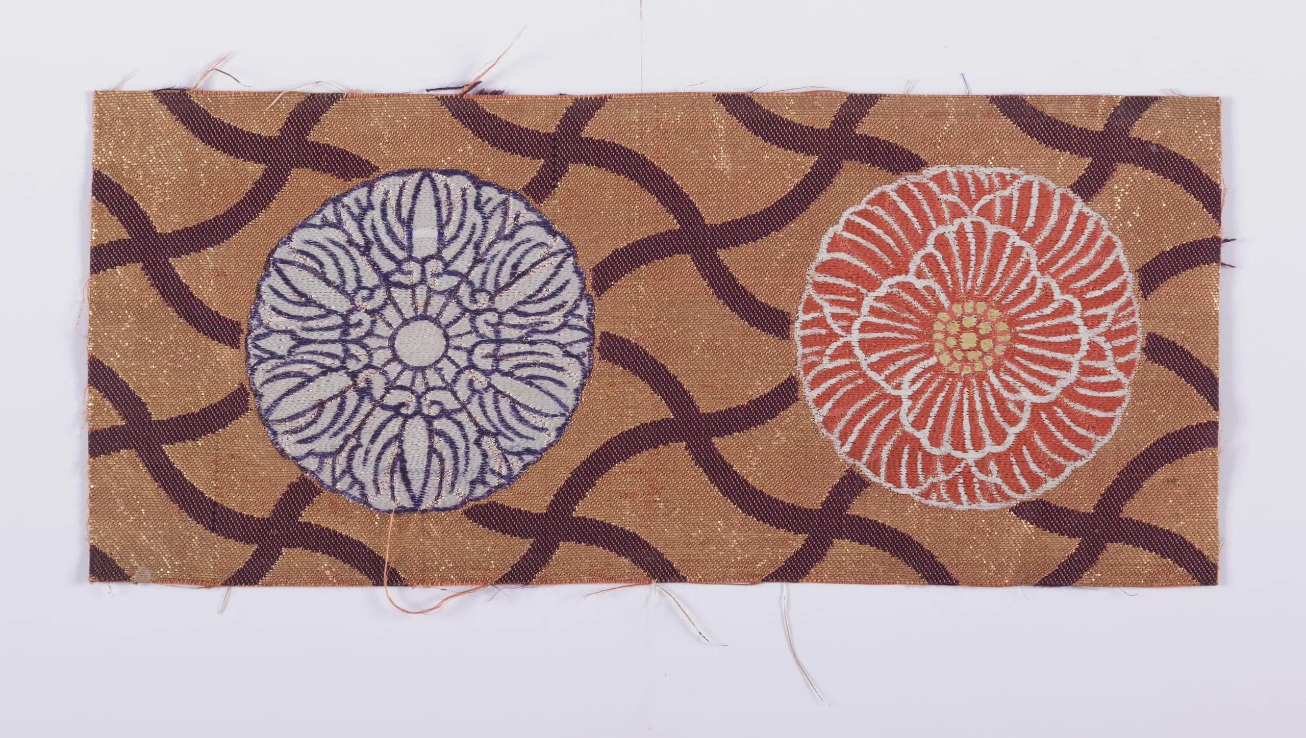 - Silk and metallic-thread plain weave with silk supplementary-weft patterning, stamped