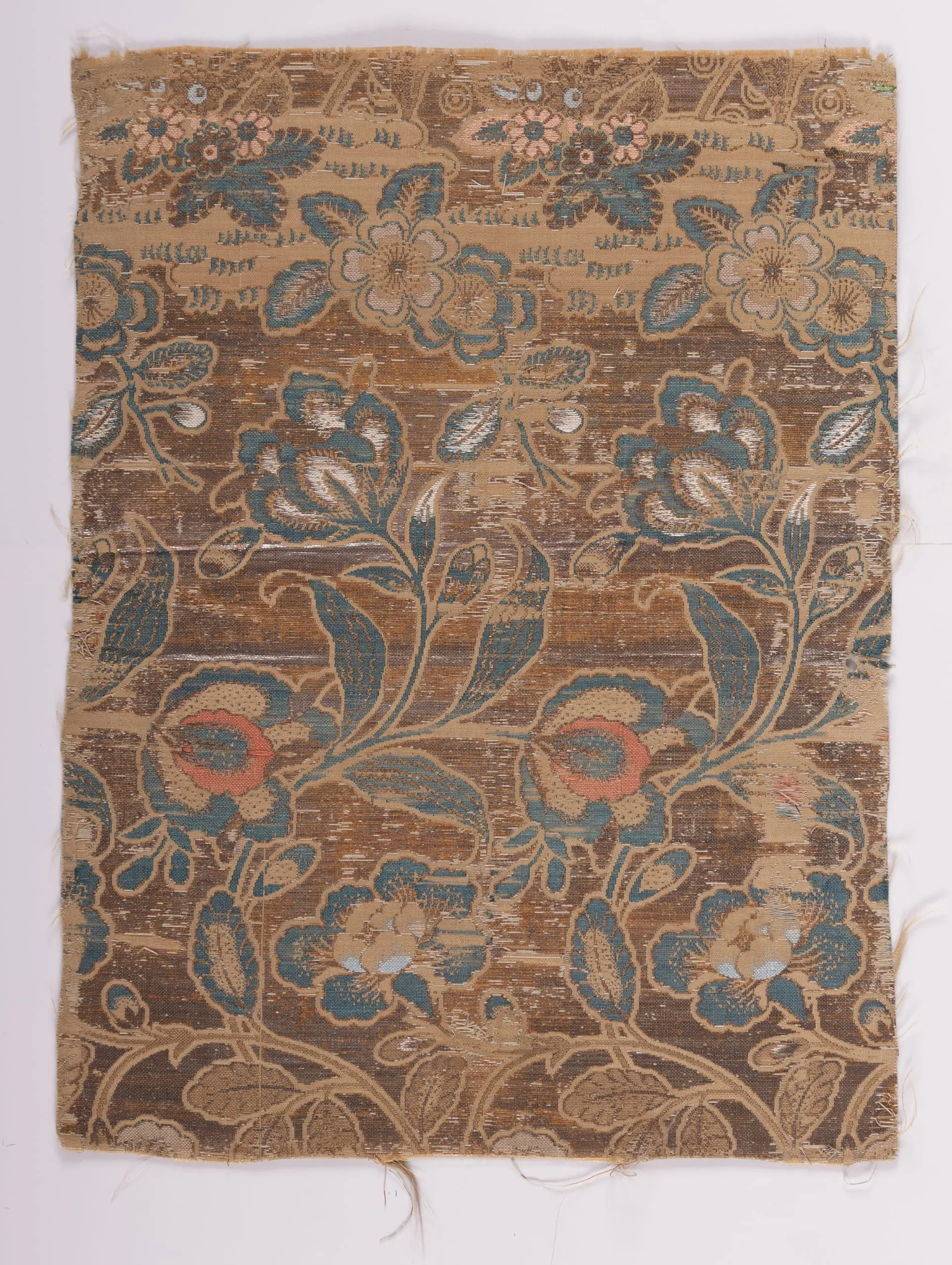 Textile fragment with brocaded floral pattern in teal, salmon, and ivory on a chestnut brown metallic ground, with unfinished edges and fringe