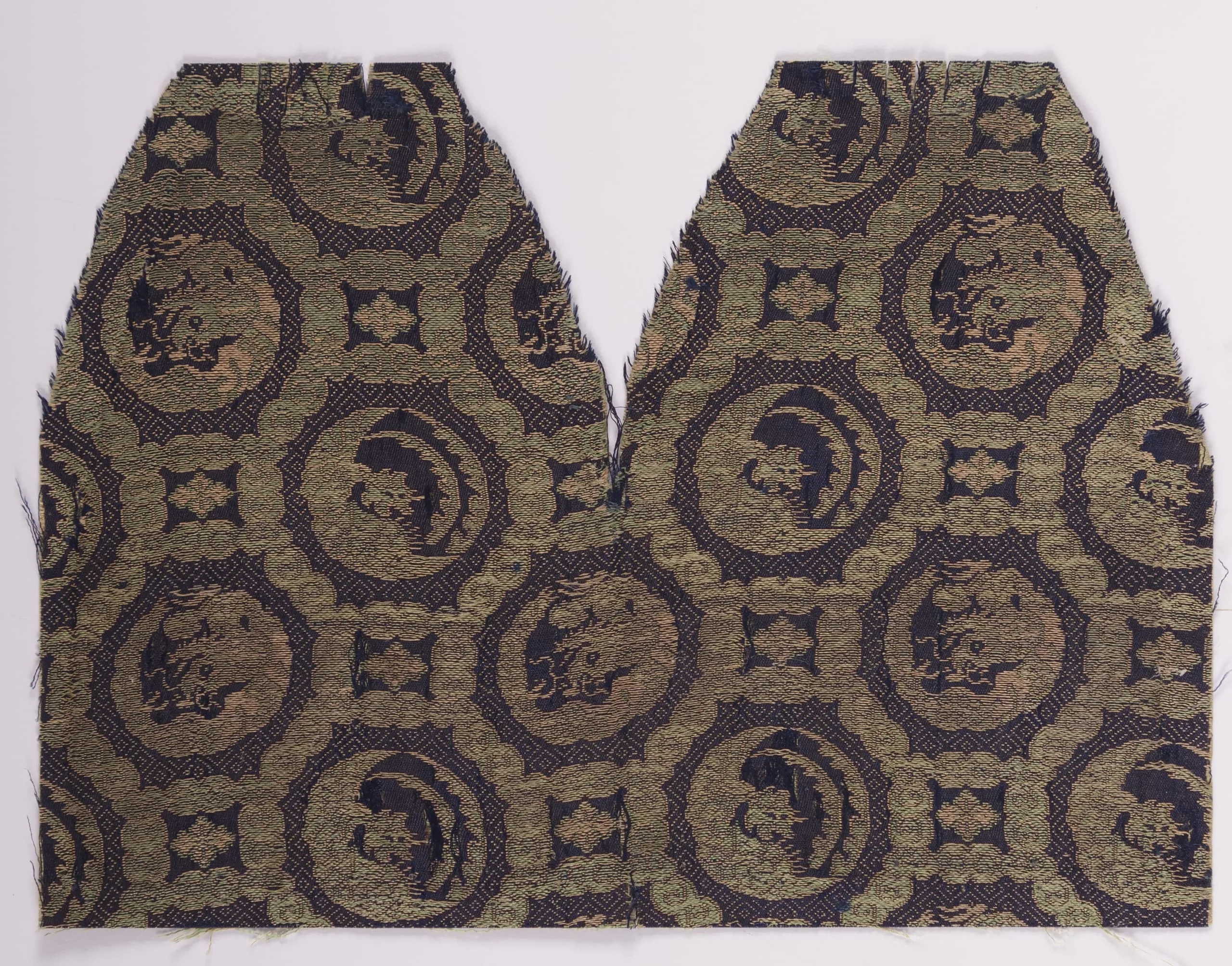 Silk brocade textile fragment in navy blue and gold, two trapezoidal panels with an allover pattern of circular dragon medallions connected by a geometric lattice