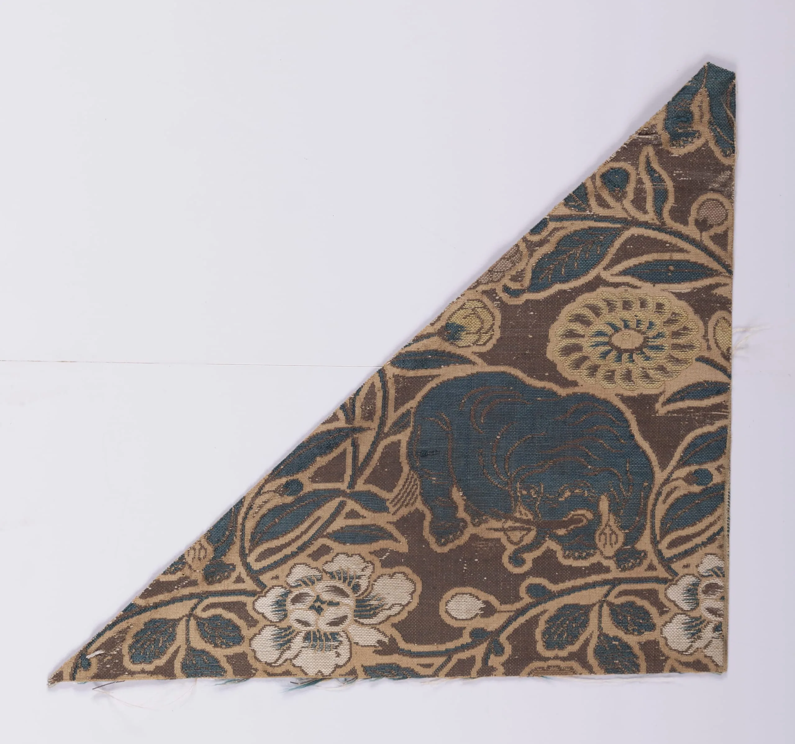 Triangular textile fragment with a walnut-brown ground, woven with slate blue leaves and a large animal figure, sandy tan chrysanthemums, and off-white open flowers