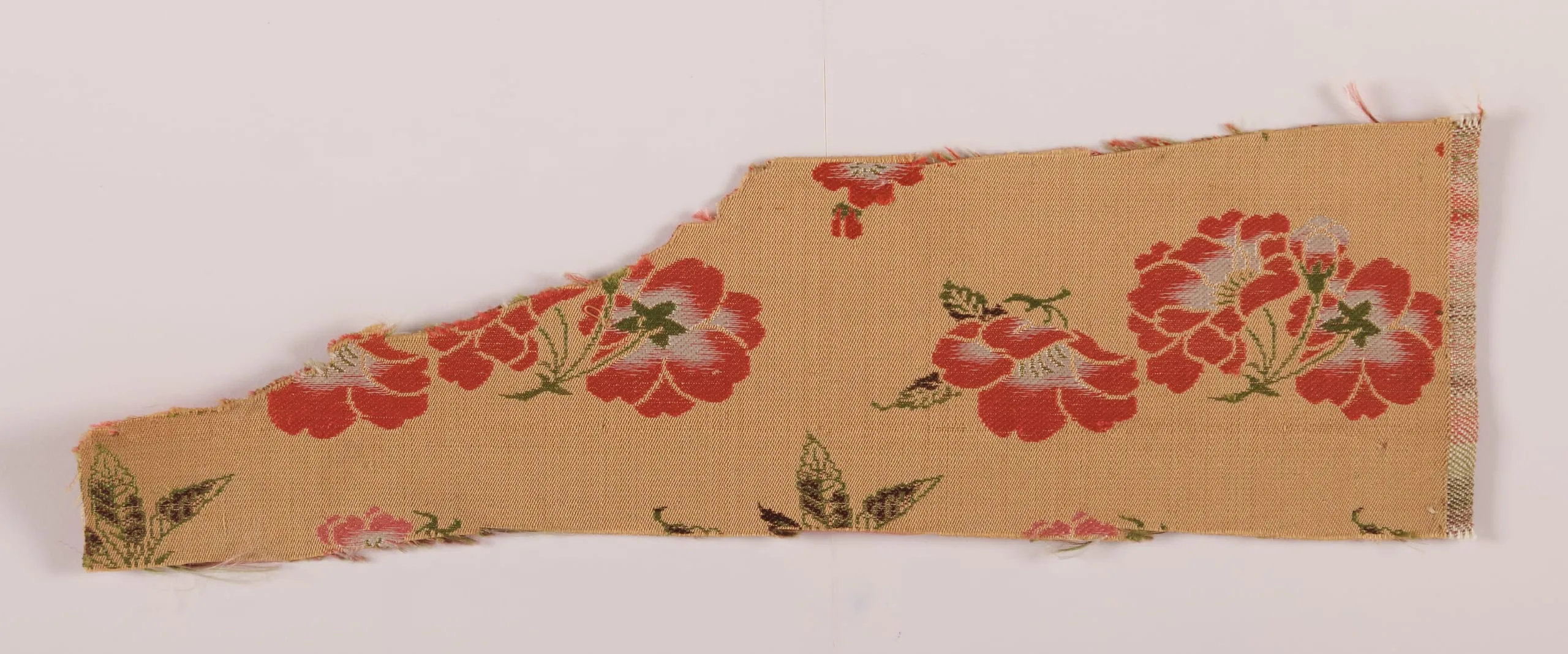 Irregular wedge-shaped textile fragment with a biscuit-tan ground woven with an allover floral pattern of large coral-red and cream blooms with olive green leaves