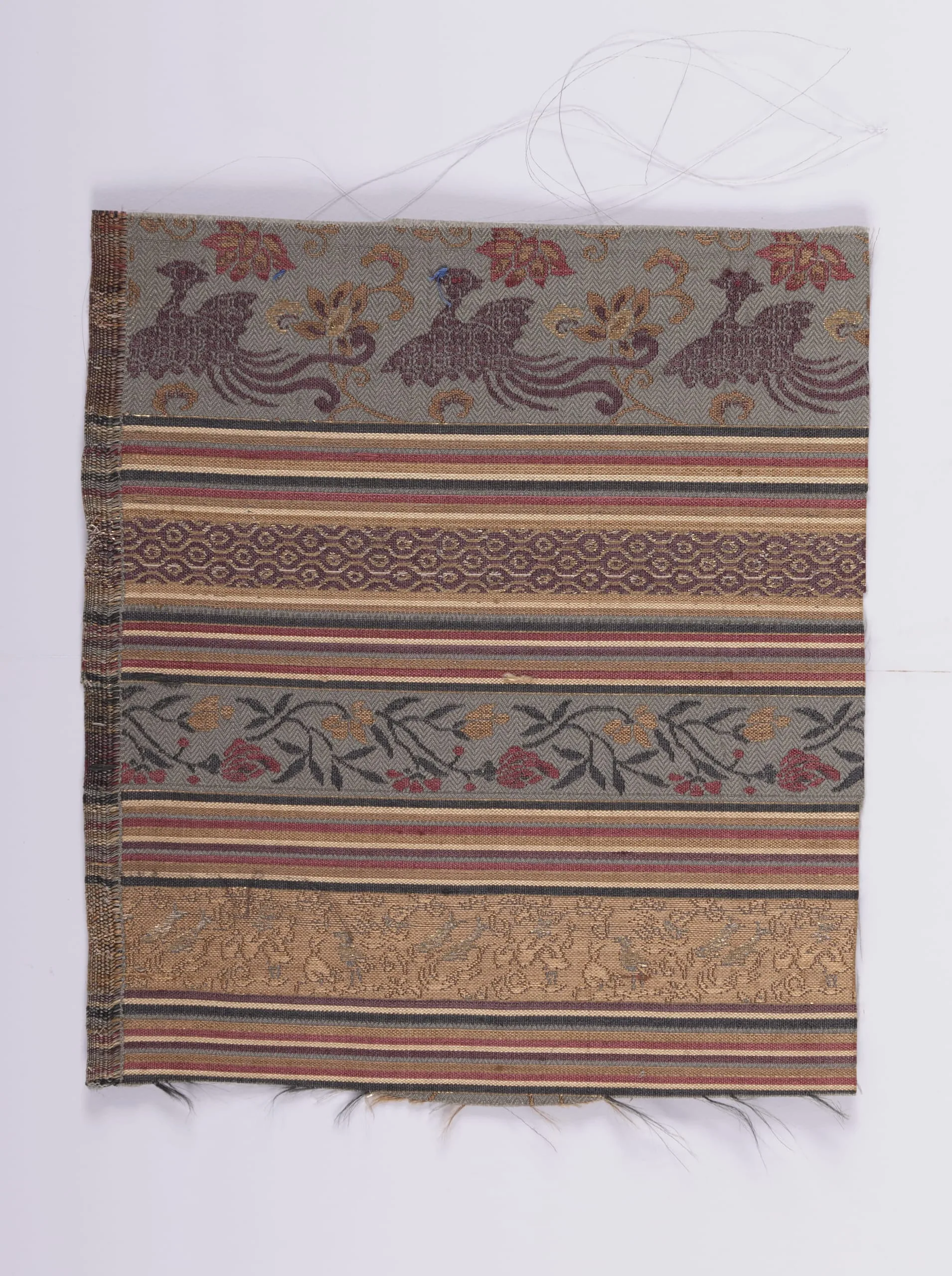 Woven textile fragment with horizontal bands including eggplant and gold bird figures on steel-blue ground, multicolored stripes, vine scroll, and gold brocade