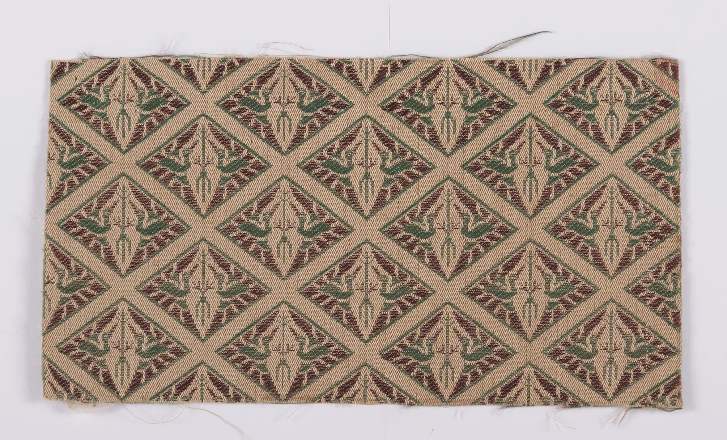 Woven textile sample with allover diamond grid pattern, each diamond containing a stylized botanical motif in cream, forest green, and dusty burgundy on a tan twill ground