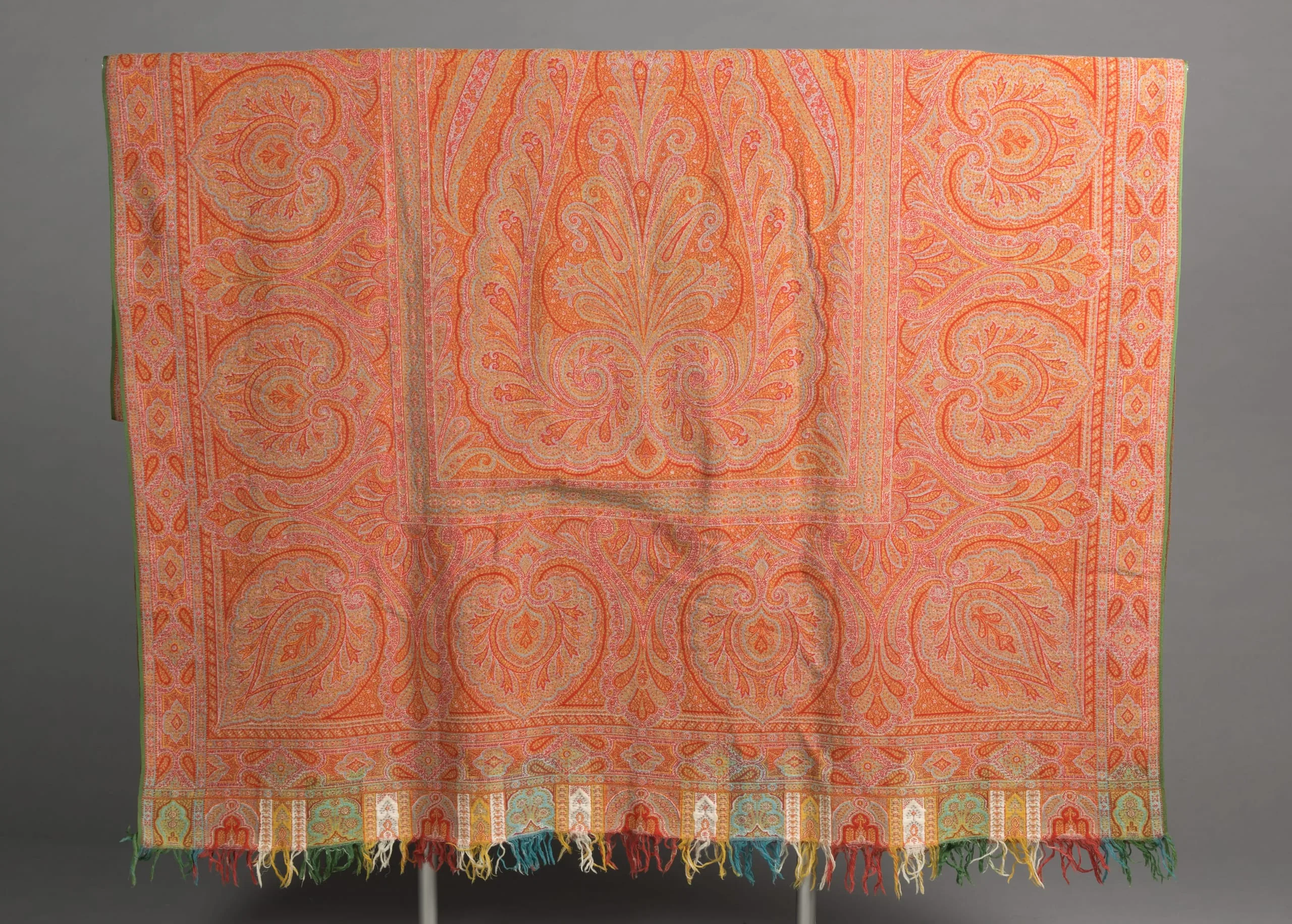 Woven textile shawl with salmon-orange ground densely patterned in paisley and floral motifs in orange, gold, and teal, with multicolored fringe along the bottom edge
