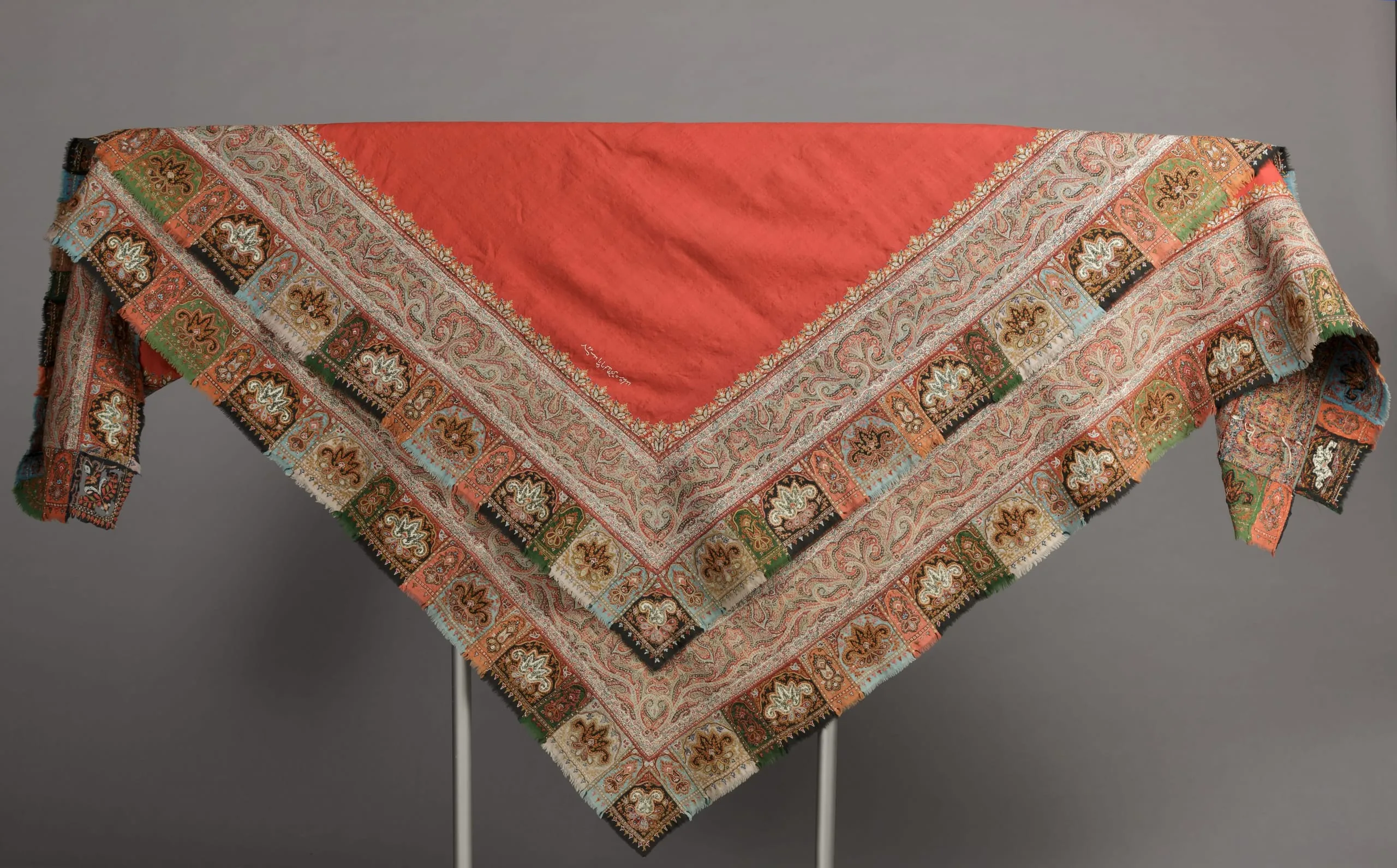 - Goat-fleece underdown (cashmere wool) twill tapestry weave, with silk embroidery