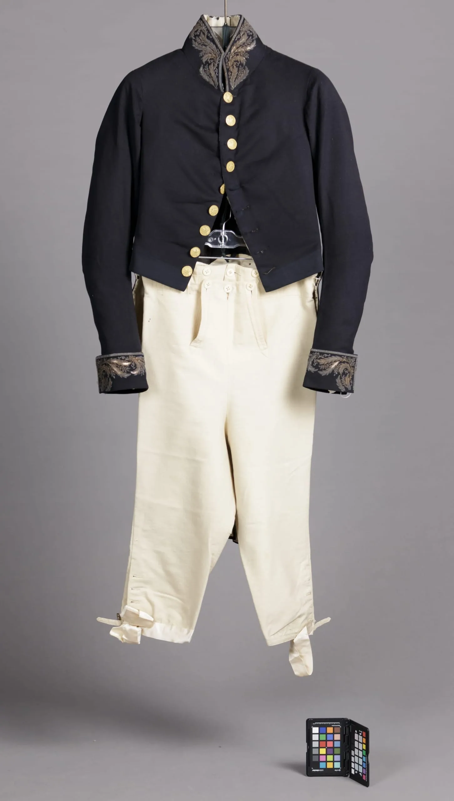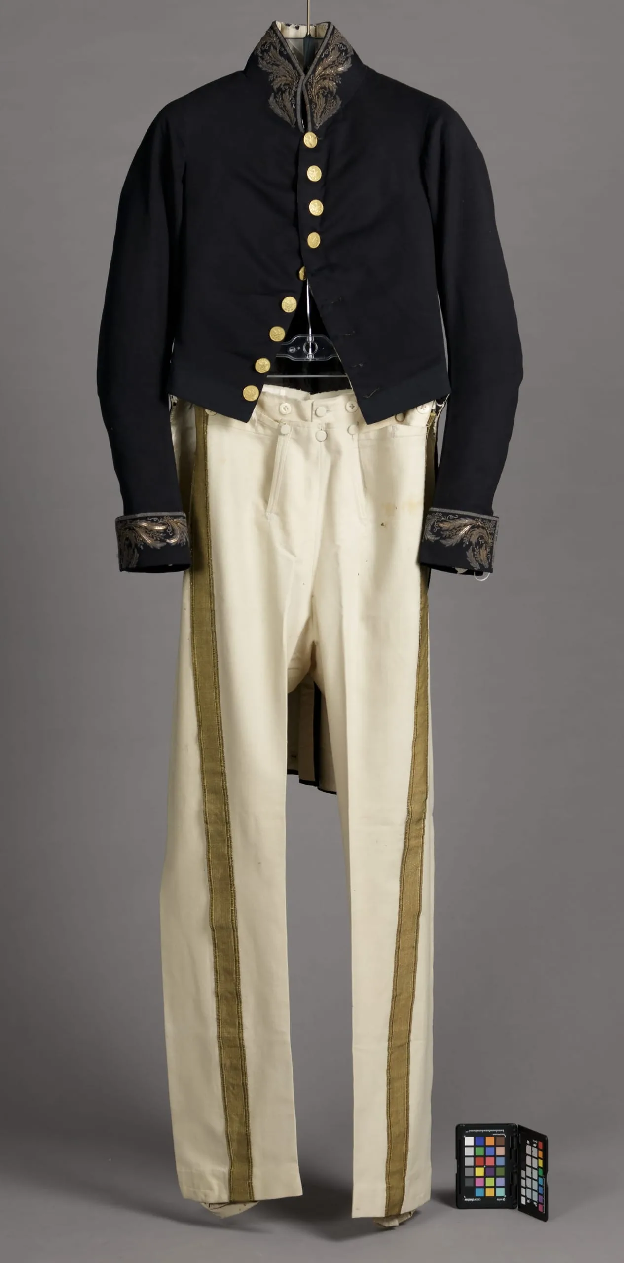 - Tail coat: wool plain weave, fulled (broadcloth), with metallic-thread embroidery, metal sequins, metal buttons; Trousers: wool twll, fulled (broadcloth) with metallic-thread ribbon trim; Breeches: wool twill, fulled (broadcloth), with bone buttons