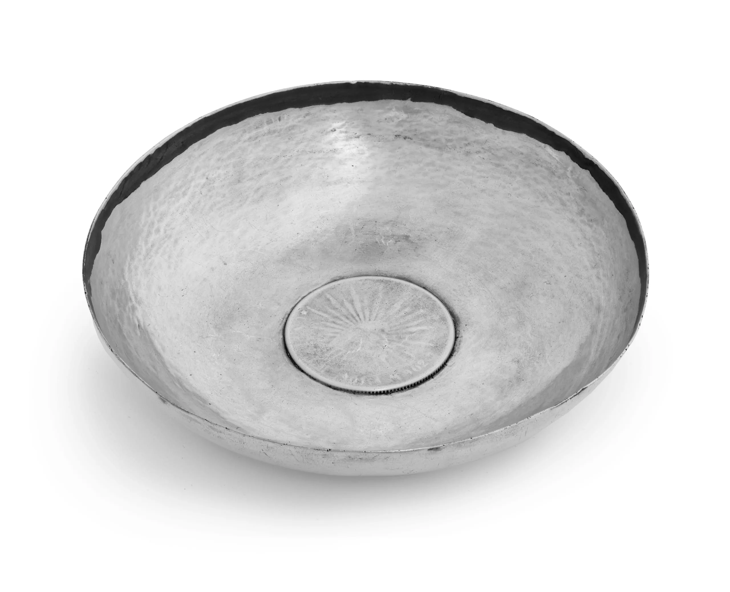 Shallow silver or silver-toned metal bowl with hammered interior surface, viewed from above at a three-quarter angle, with a raised sunburst medallion at center
