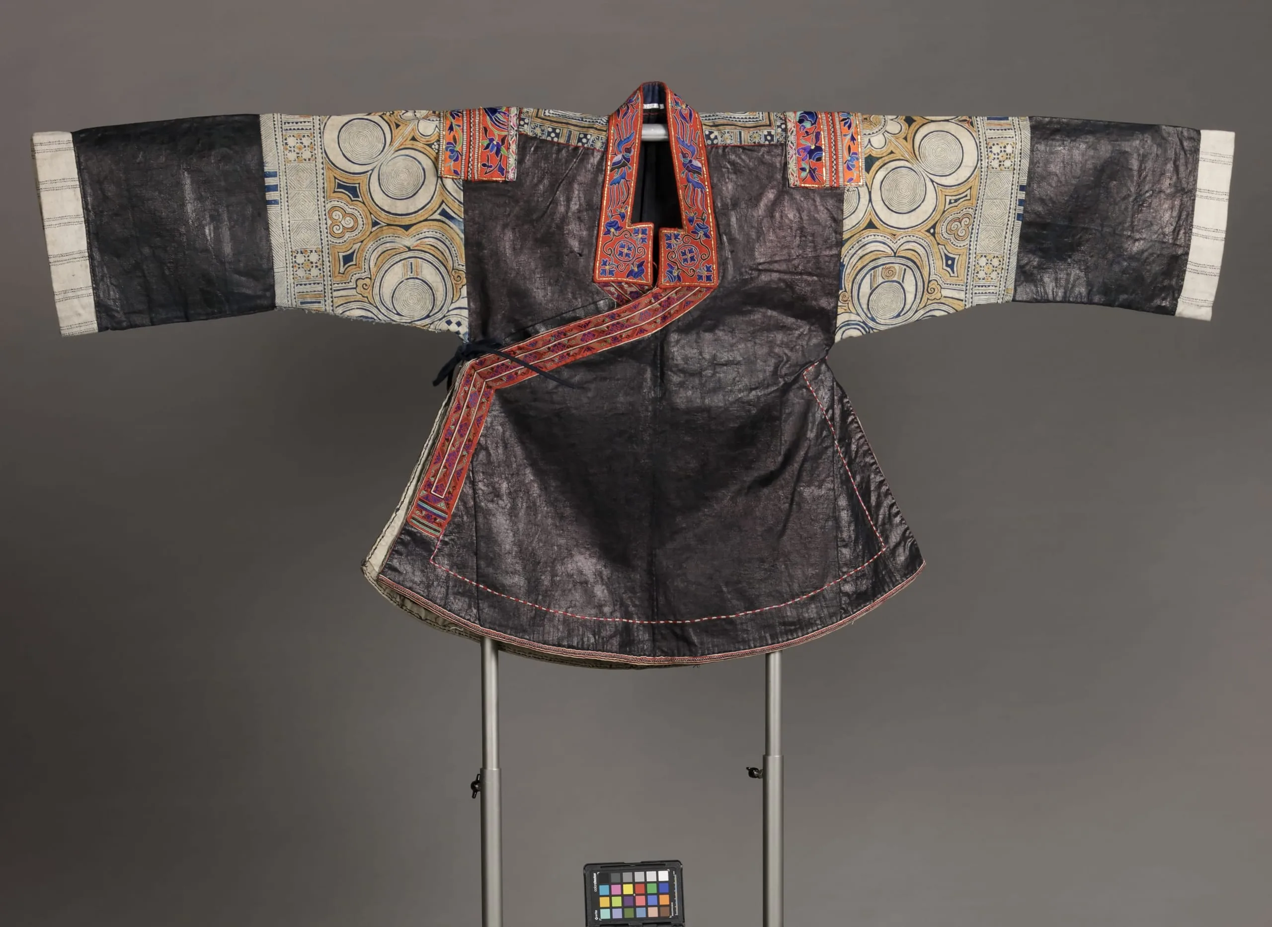 - Cotton plain weave, calendered, cotton plain weave, wax-resist dyed (batik), and wool plain weave with silk single-ply embroidery (poxian xiu or satin stitch)