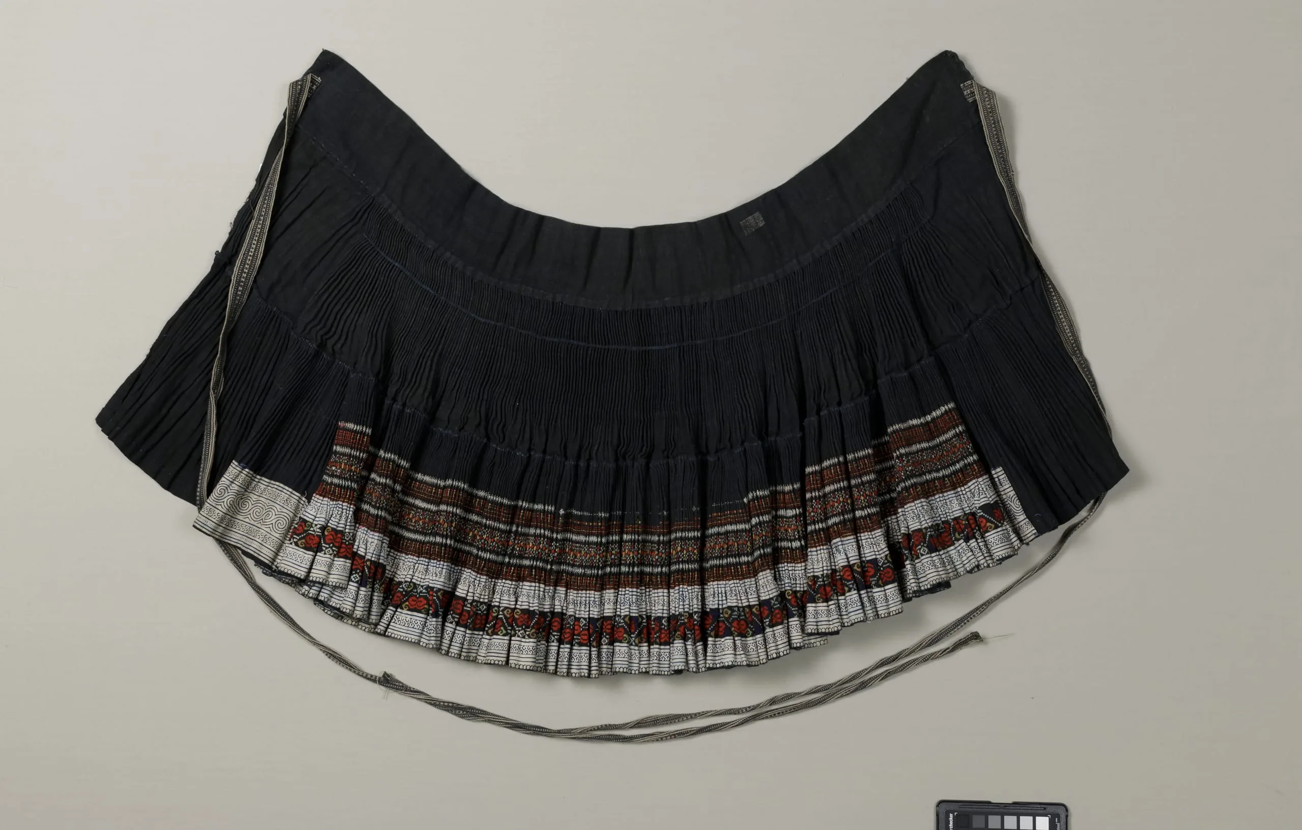 - Cotton plain weave, wax-resist dyed (batik) and pleated, with silk embroidery