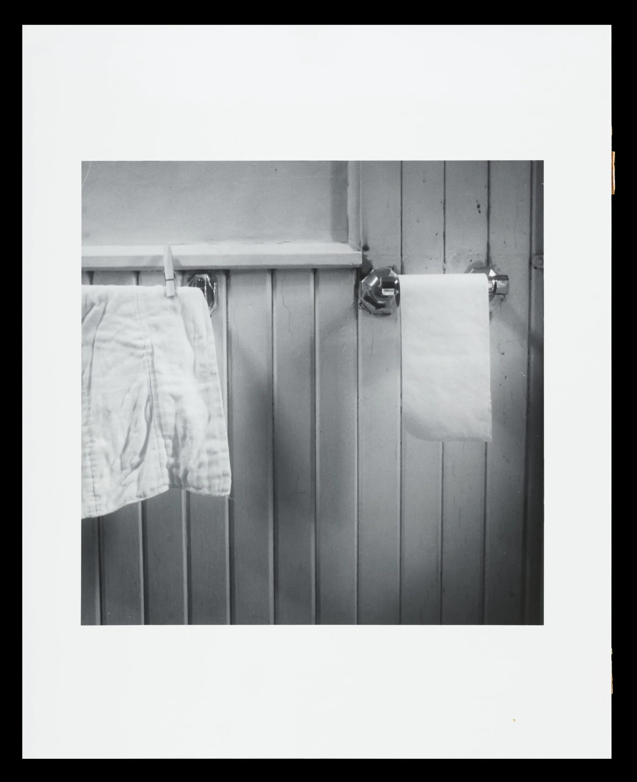 Black and white photograph of vertical wood-paneled wall with a pair of children's plaid shorts clipped to a chrome fixture and a toilet paper roll on a second fixture