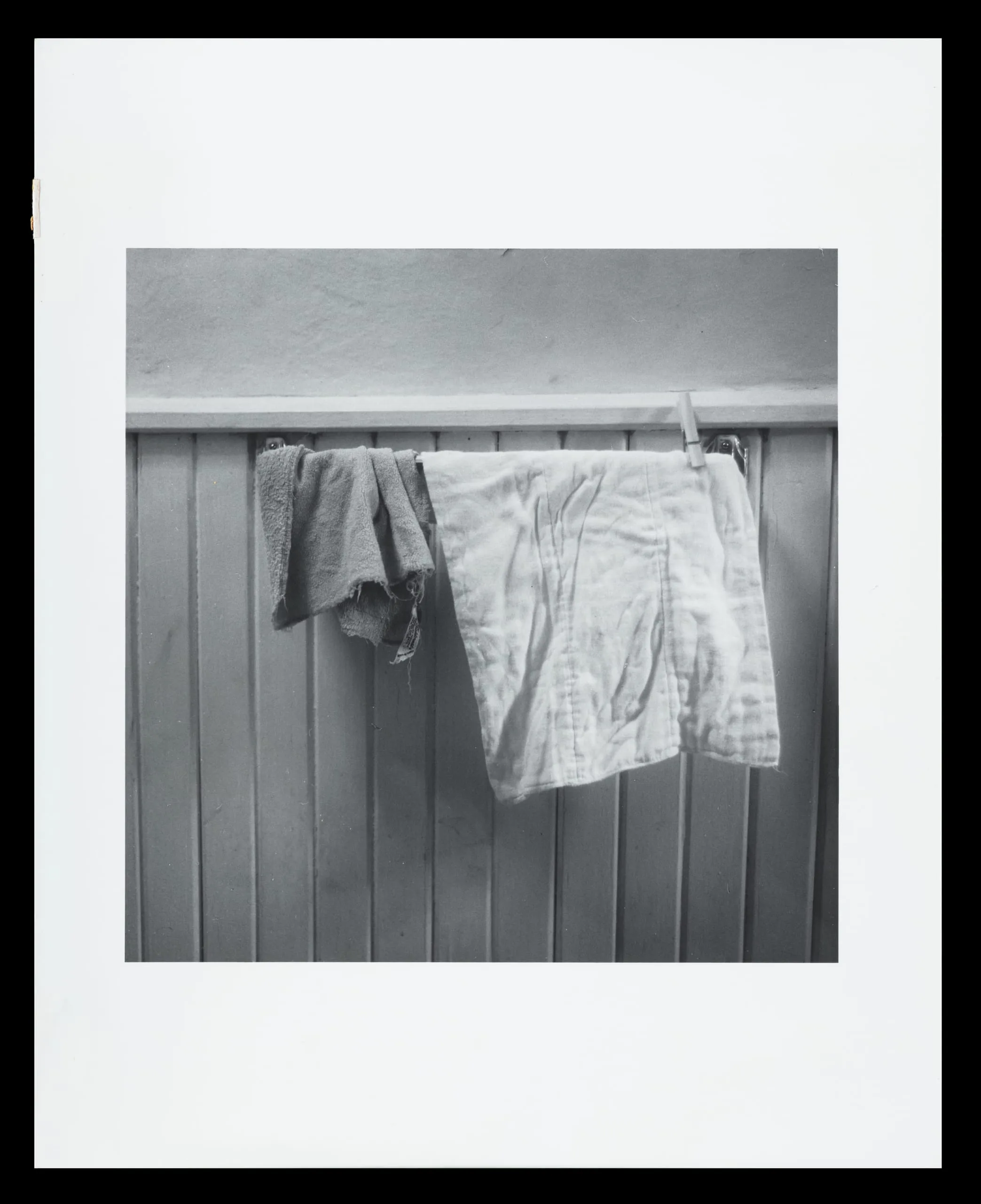 Black and white photograph of two pieces of laundry — a small crumpled cloth and a larger creased garment — hanging from a rod on a vertical wood-slatted panel