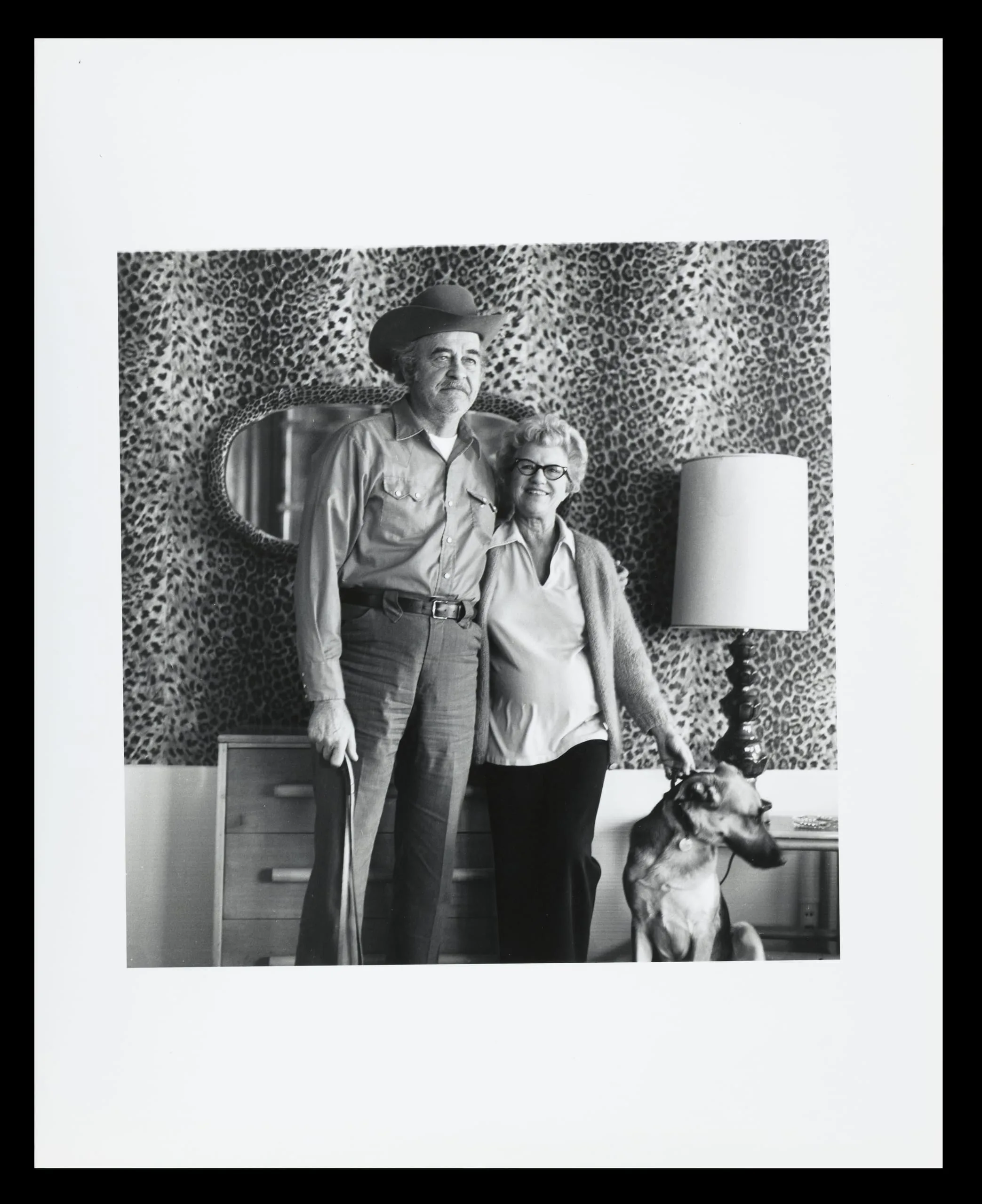 Black and white photograph of two older adults and a dog standing in a room with leopard-print wallpaper, soft diffused lighting