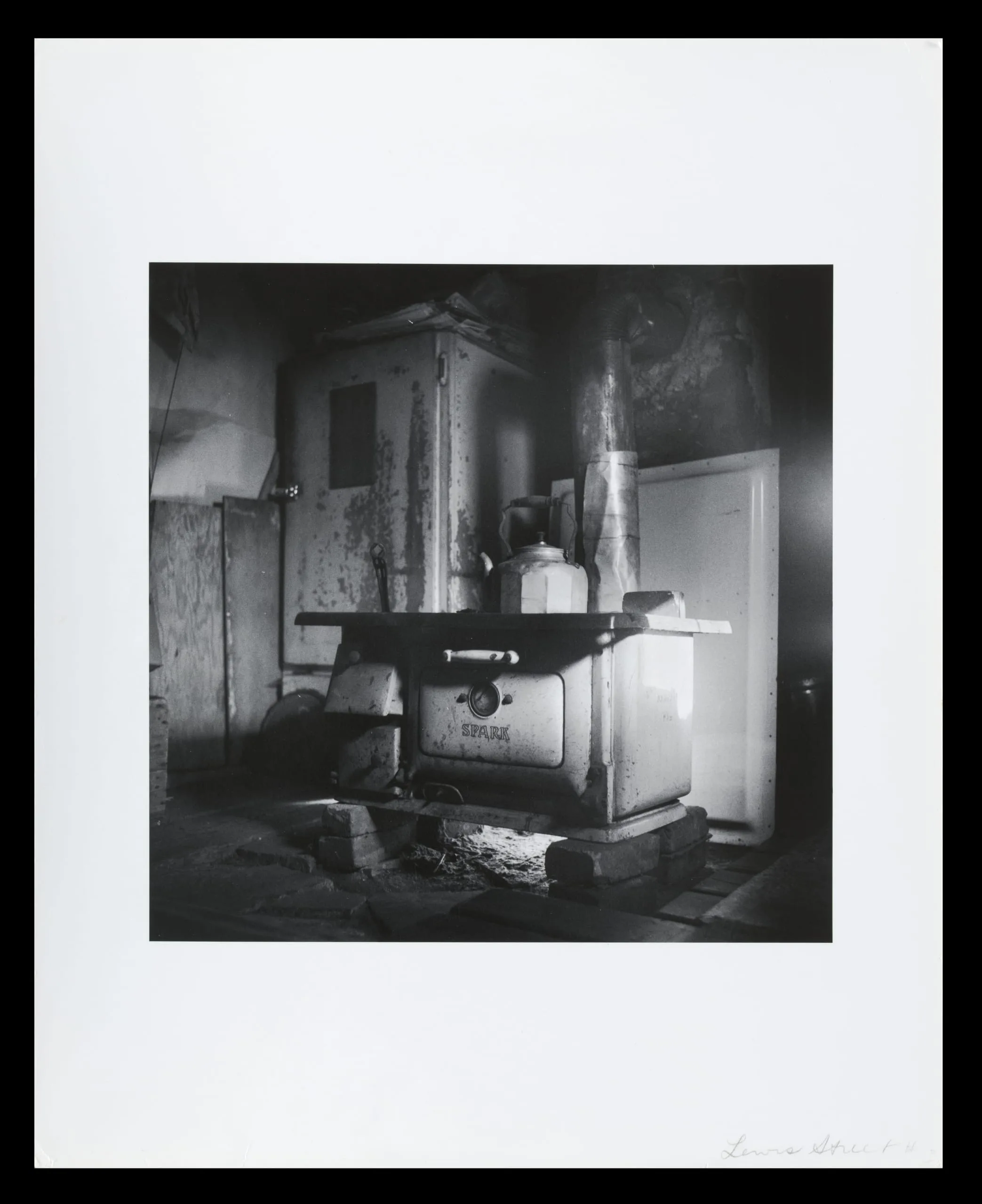 Black and white photograph of a worn 'Spark' brand kitchen stove in a deteriorated interior, with dramatic side lighting and debris-covered floor