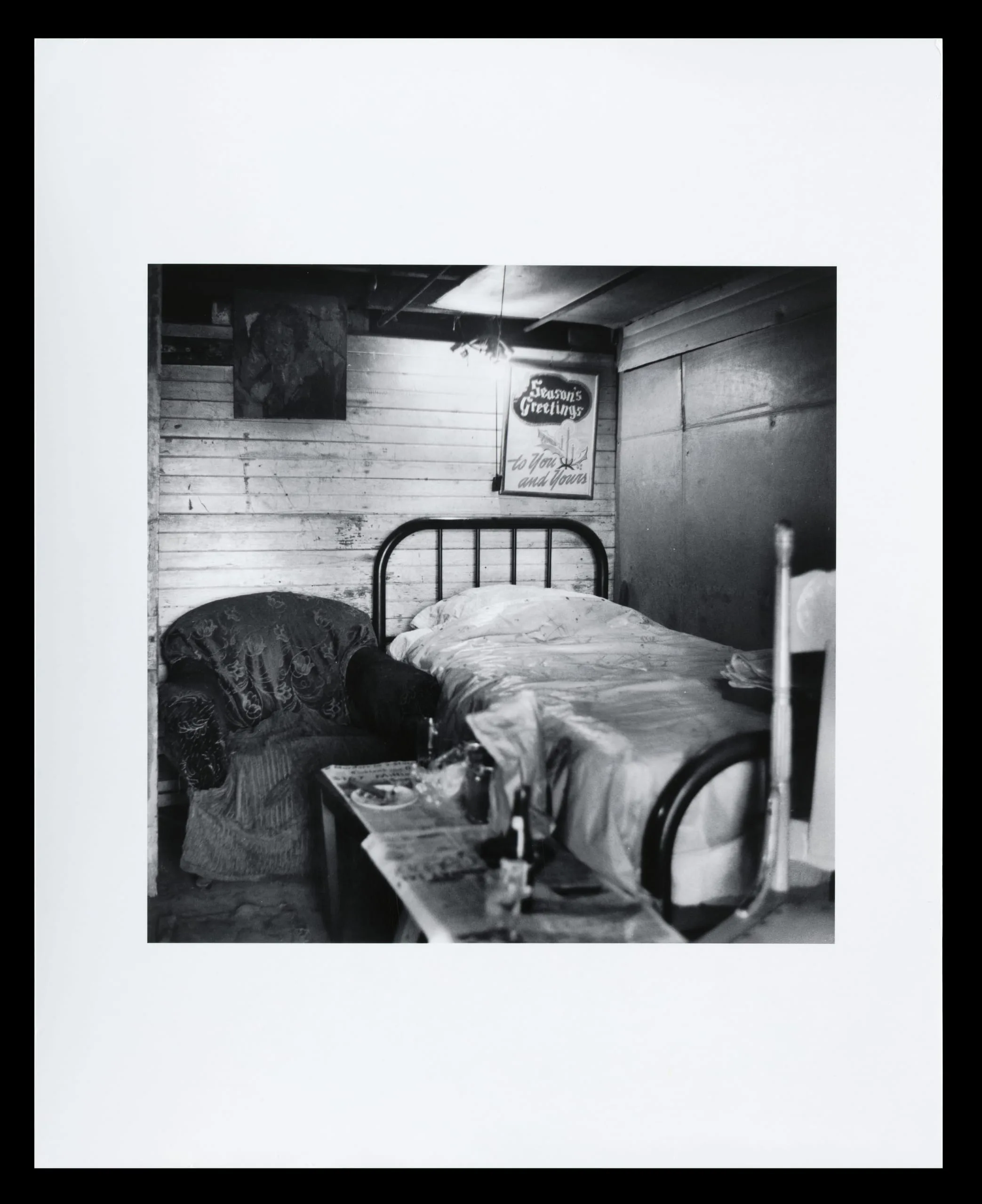 Black and white photograph of a spare interior room with an unmade metal-frame bed, worn armchair, cluttered side table, and a 'Season's Greetings' sign on a wooden plank wall