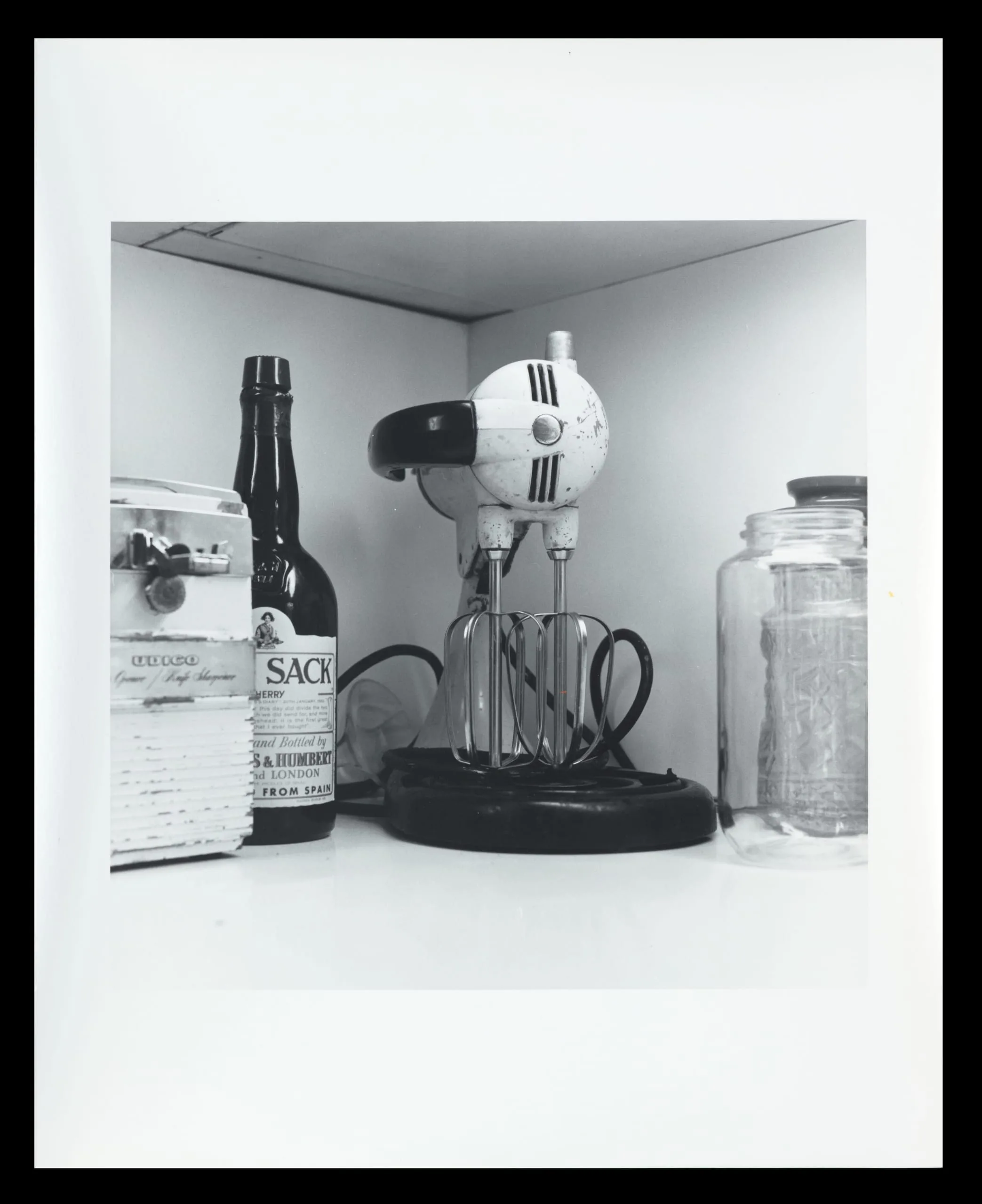 Black and white photograph of a kitchen shelf corner with a standing electric mixer, a dark bottle labeled 'SACK,' stacked papers, and a glass jar
