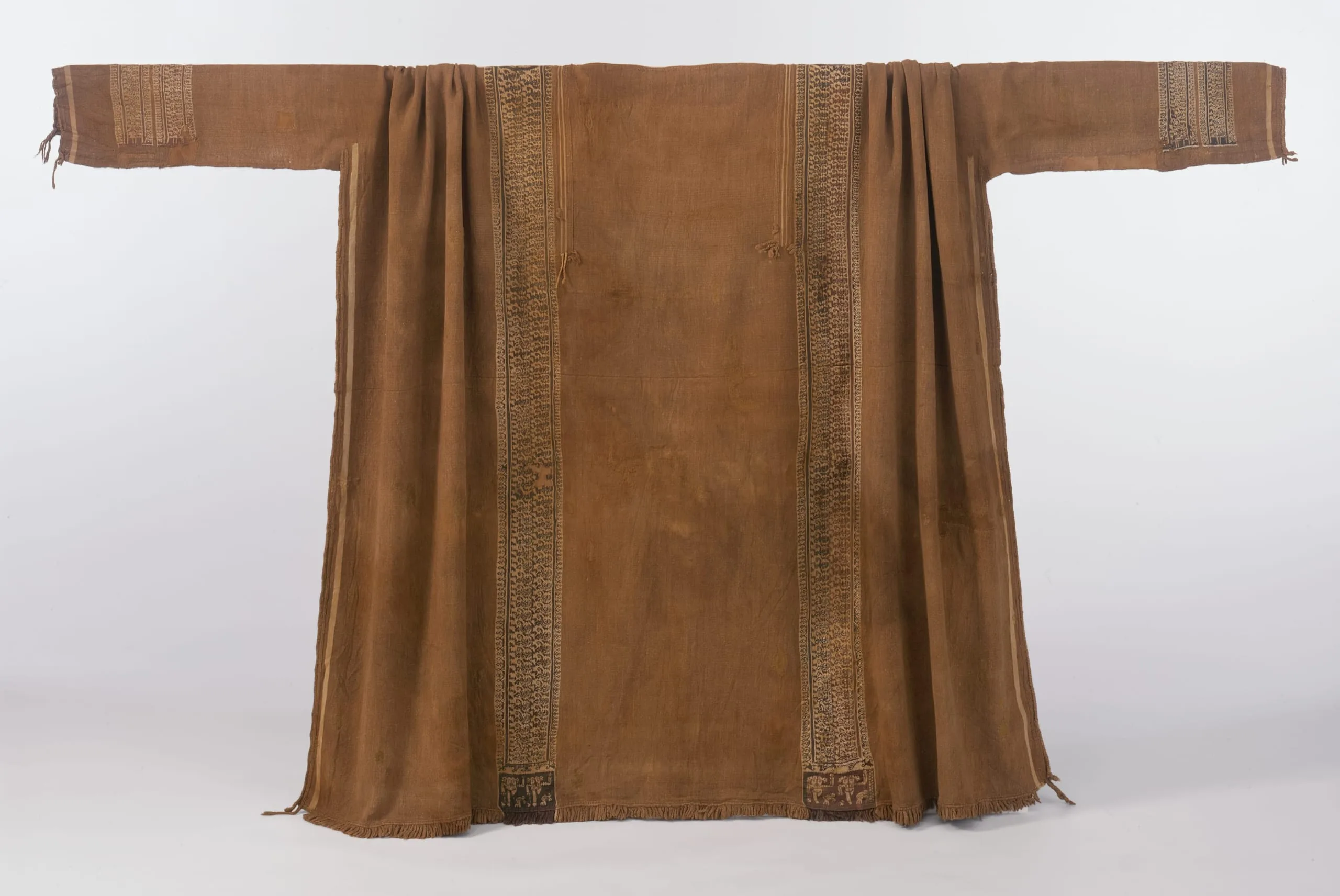 - Wool plain weave, wool tapestry weave with linen eccentric discontinuous-supplementary weft patterning, and wool weft-loop fringe