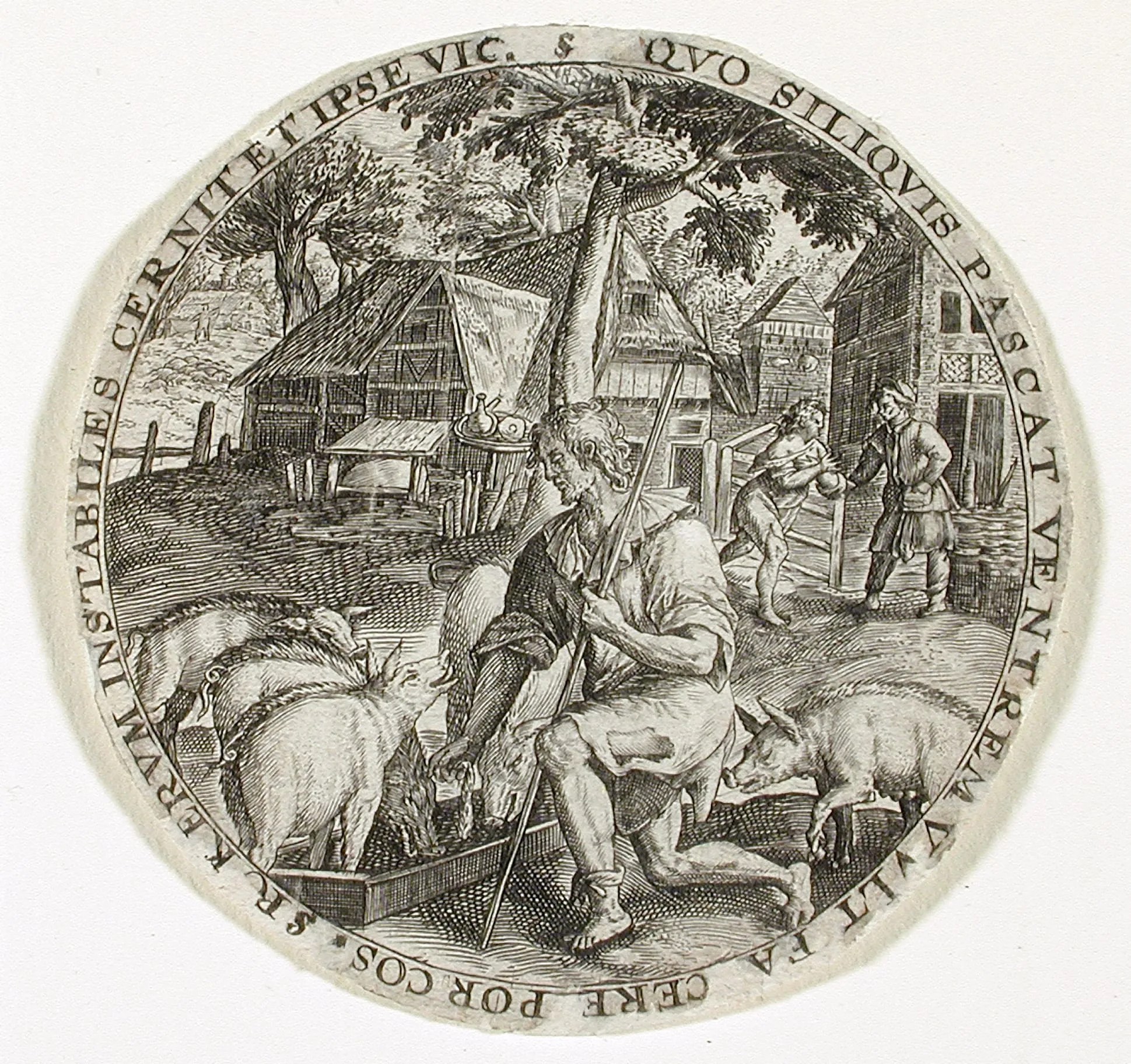 Circular engraving with Latin border inscription depicting an old man feeding pigs at a trough in a farmyard, with farm buildings and two background figures