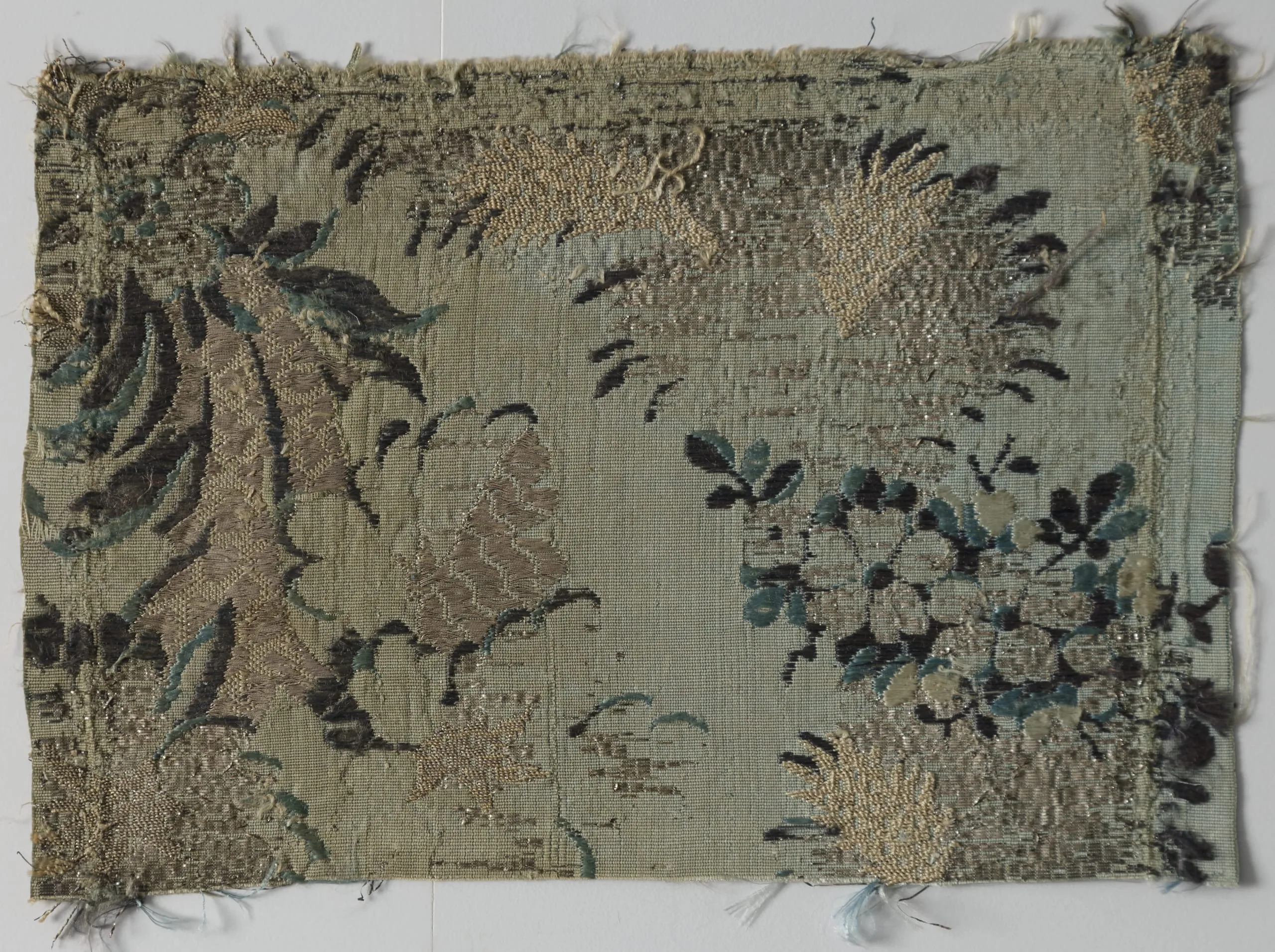 - Silk plain weave with silk supplementary-weft patterning and metallic-thread and metal-strip discontinuous supplementary-weft patterning (brocade)