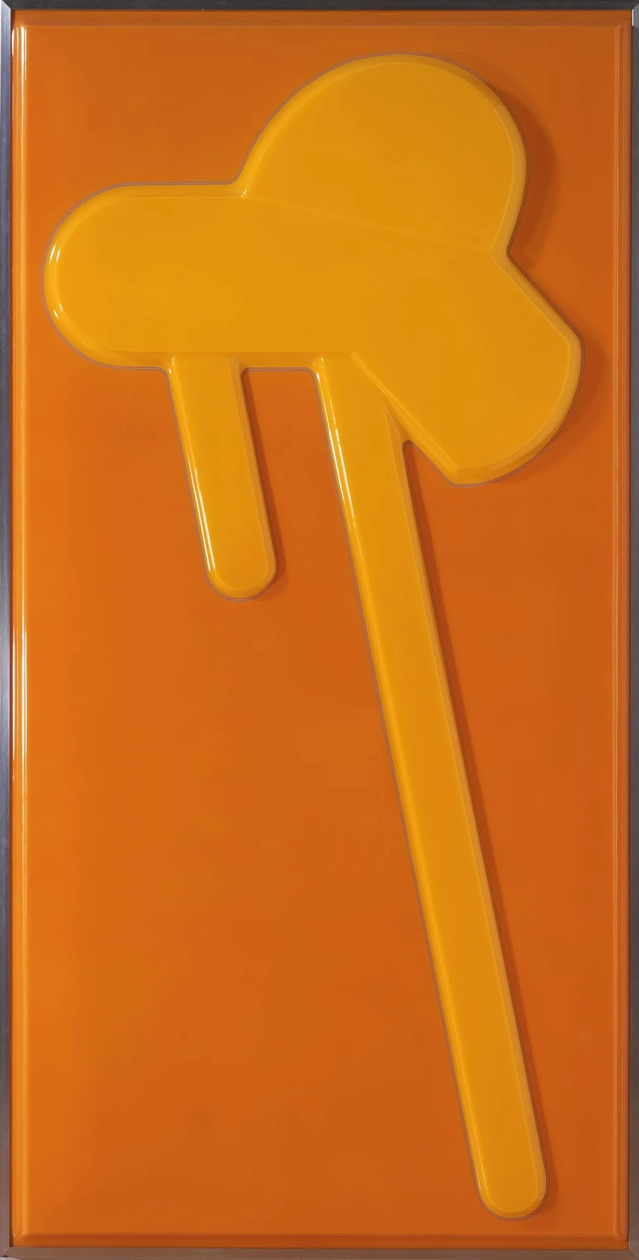 In the early 1960s, inspired by the plastic sculptures of modernist artists László Moholy-Nagy and Antoine Pevsner, Craig Kauffman began spray-painting sheet acrylic to achieve evenly covered surfaces; he then started vacuum-forming the plastic sheets into three-dimensional works such as Yellow Orange. Although these wall sculptures were produced commercially—by a company whose clients typically included gas stations and doughnut shops—Kauffman painted and finished them himself to achieve his desired level of visual perfection. The vibrant colors of these works were inspired by Jell-O and by soda he had seen bubbling in machines in a restaurant near his apartment..