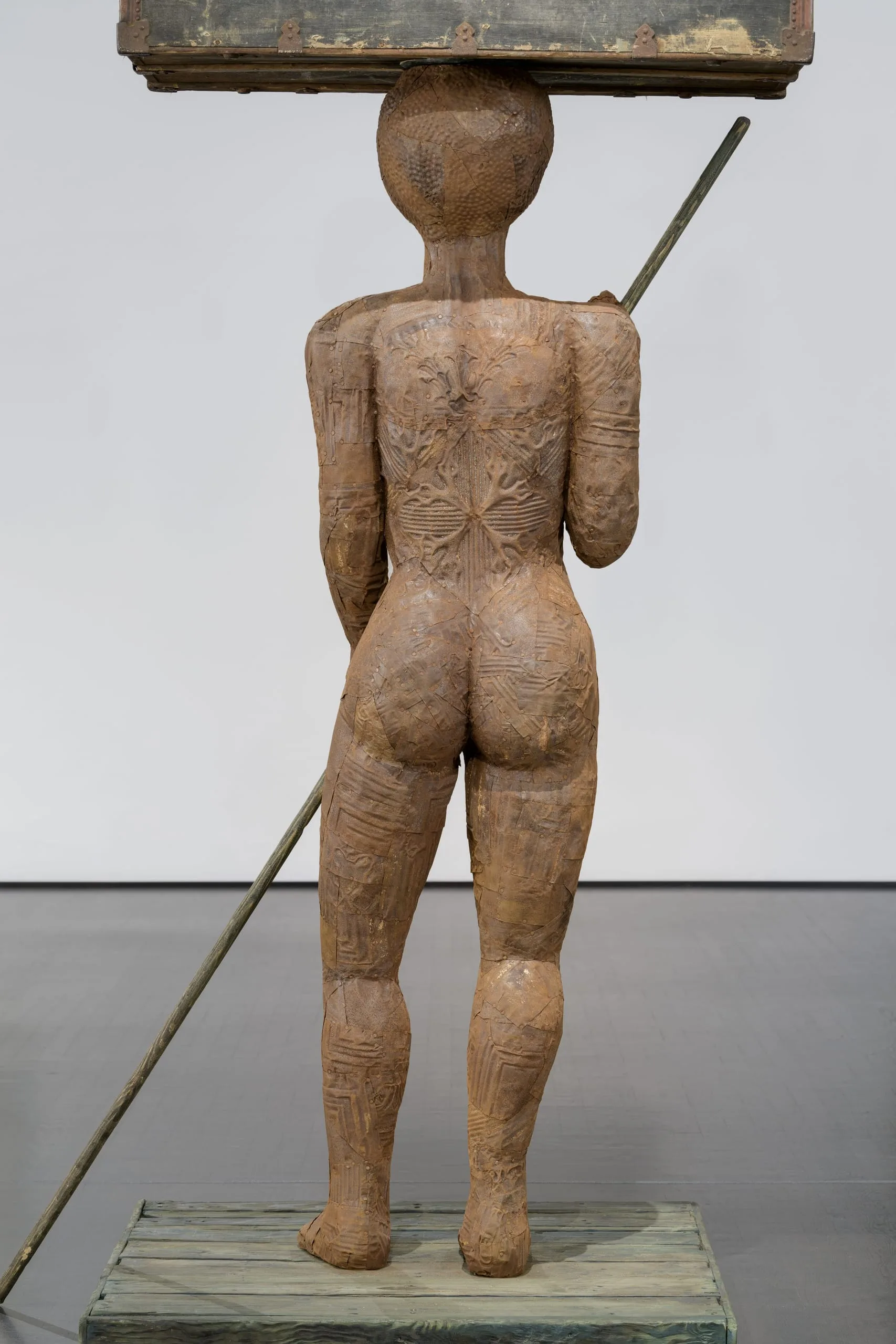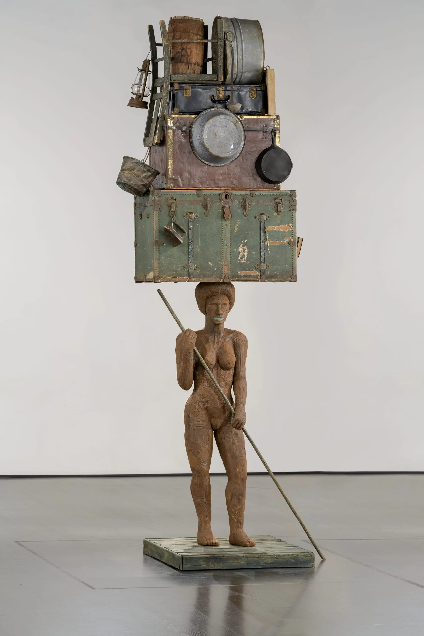 Saar’s protagonist has also been likened to Mark Twain’s Jim on the raft with Huck Finn, as well as to ancient Greek caryatids (figure-shaped pillars that literally bear the weight of temple entablatures). At the same time, Saar’s roughly carved wood figure evokes the intensity of early 20th-century German Expressionist sculpture, which in turn was heavily informed by contemporaneous and 19th-century African sculptures. Saar has spoken about the importance of German Expressionist carved wood figures to her own work.