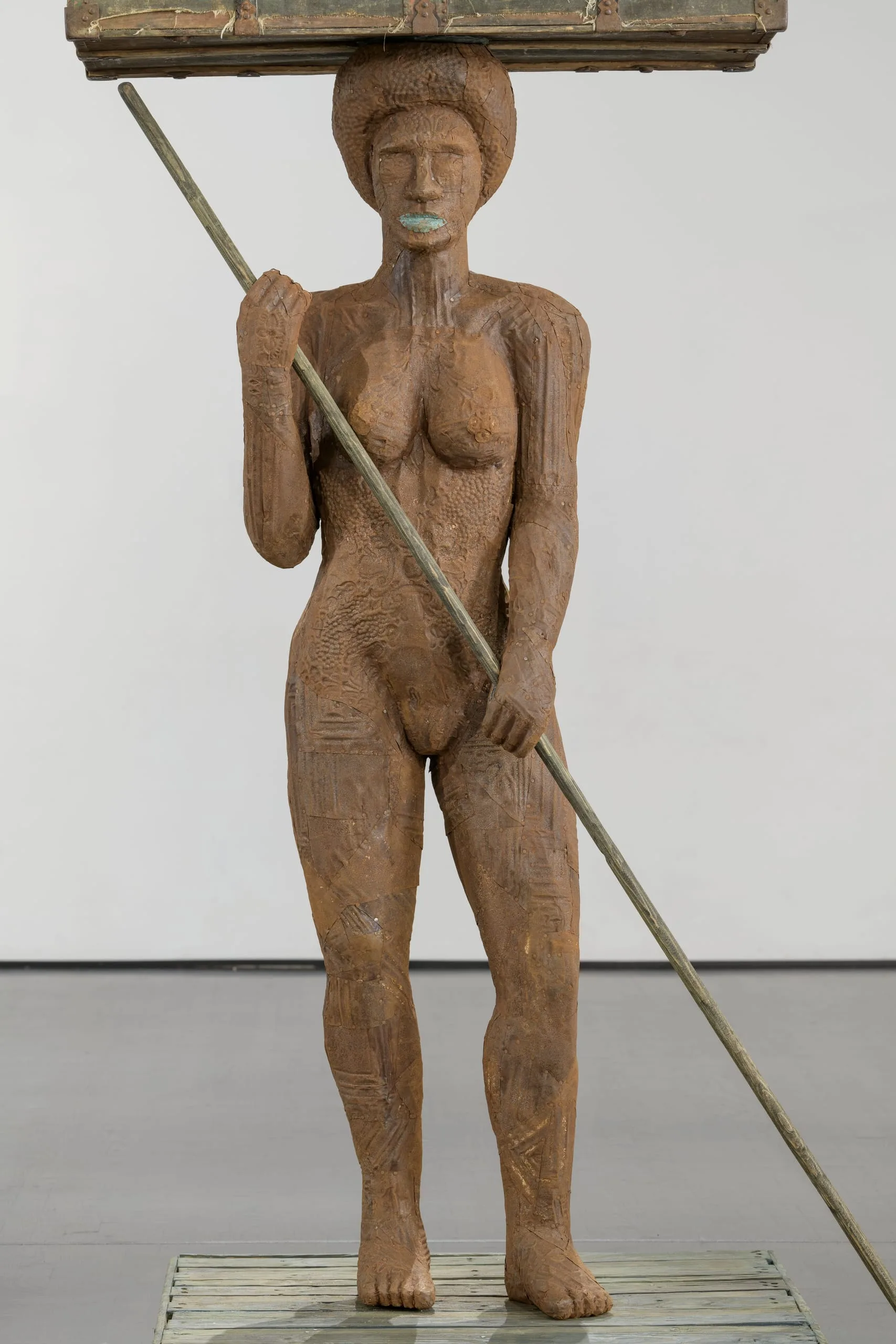 Breach is the signature piece from Alison Saar’s body of work informed by the Great Mississippi River Flood of 1927, an epic inundation that affected over 630,000 people, some one-third of whom were Blacks. Almost exactly ninety years before the devastation of Hurricane Katrina, the Great Mississippi River Flood similarly foregrounded socio-economic and other inequities between Blacks and whites. Breach has been described as “a virtual lexicon of Saar’s favored materials—wood, found objects, and...tin ceiling tiles, suggestive of ritual scarification. The life-size figure stands on a pallet-cum-raft with her punt pole at the ready....More than anything, [her] gravity-defying load speaks to the limits of human endurance. In this homage to strength, Saar intentionally makes connections between Atlas, Greek god of endurance, and the Senegalese women and children she encountered during a visit to Senegal in 2006. Essentially mobile agents of commerce, these African women and children routinely balance gravity-defying loads of calabashes and other market goods on their heads with the same grace and equanimity as the figure in Breach.” Because the figure’s pole in Breach reaches the “water”—in reality the floor where viewers stand—anyone standing on that same floor is implicated in the work’s narrative.