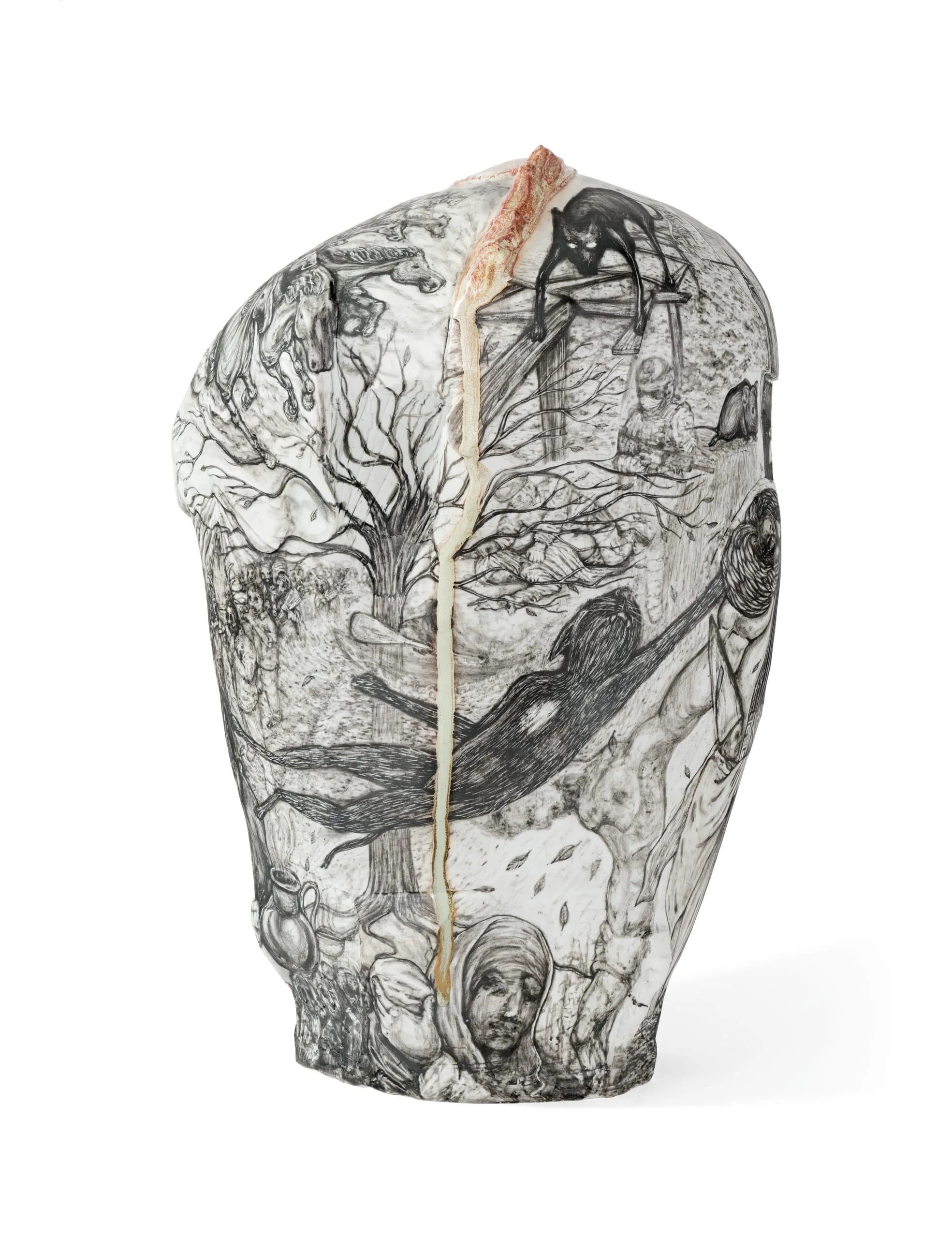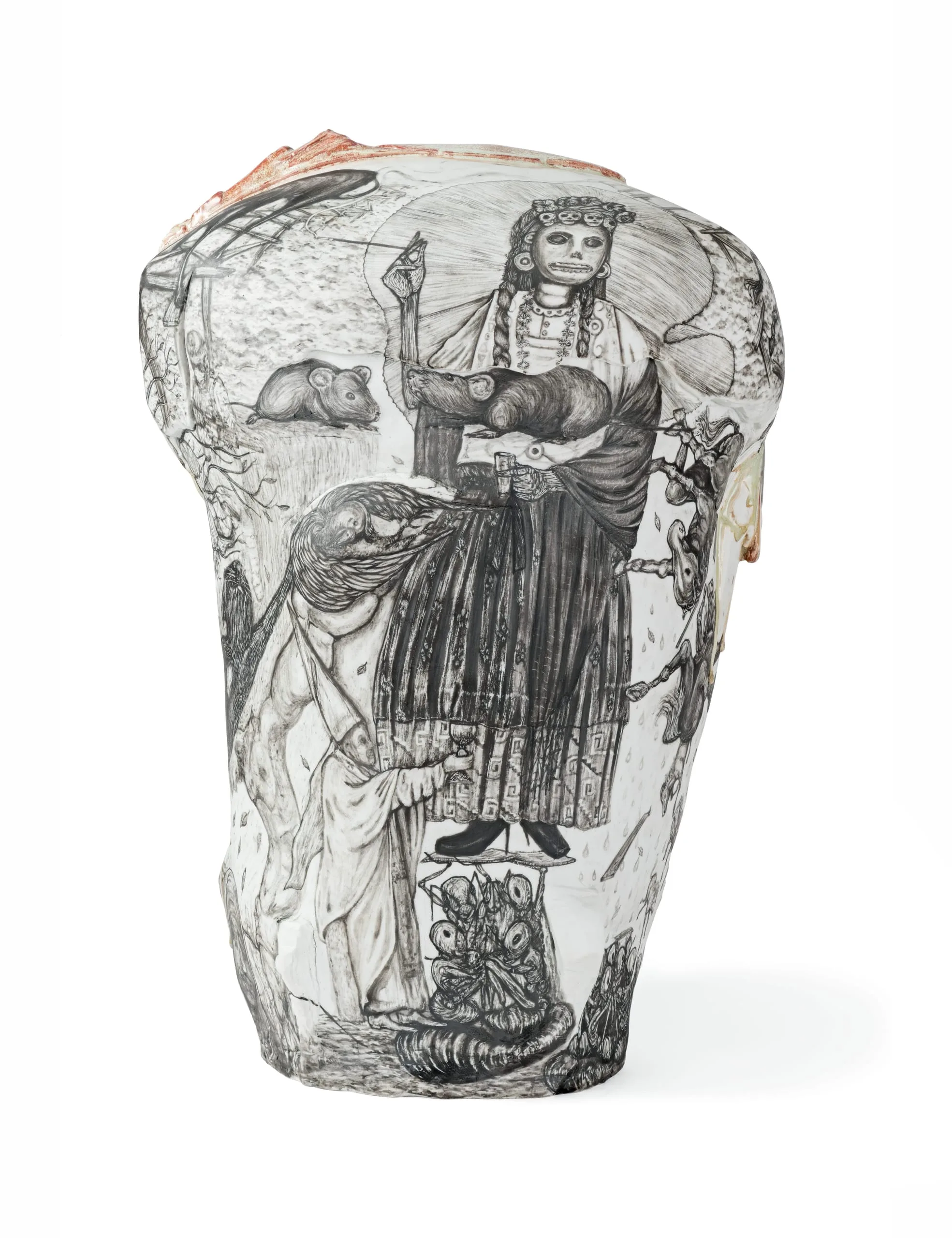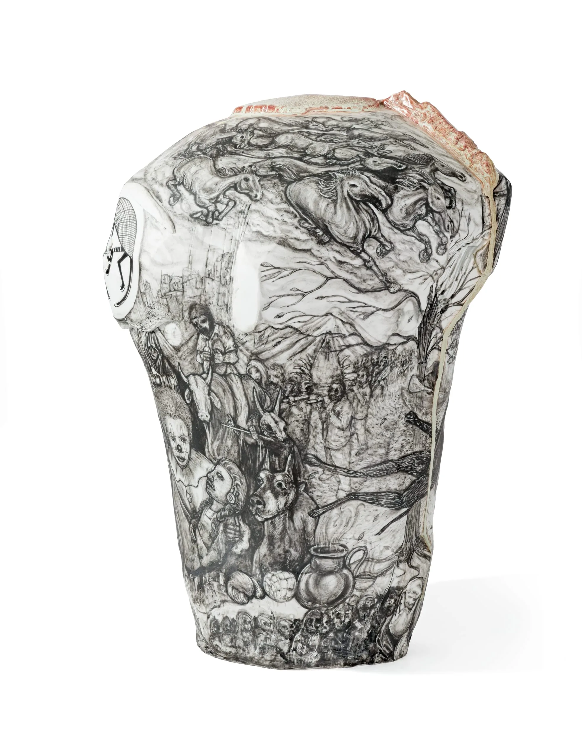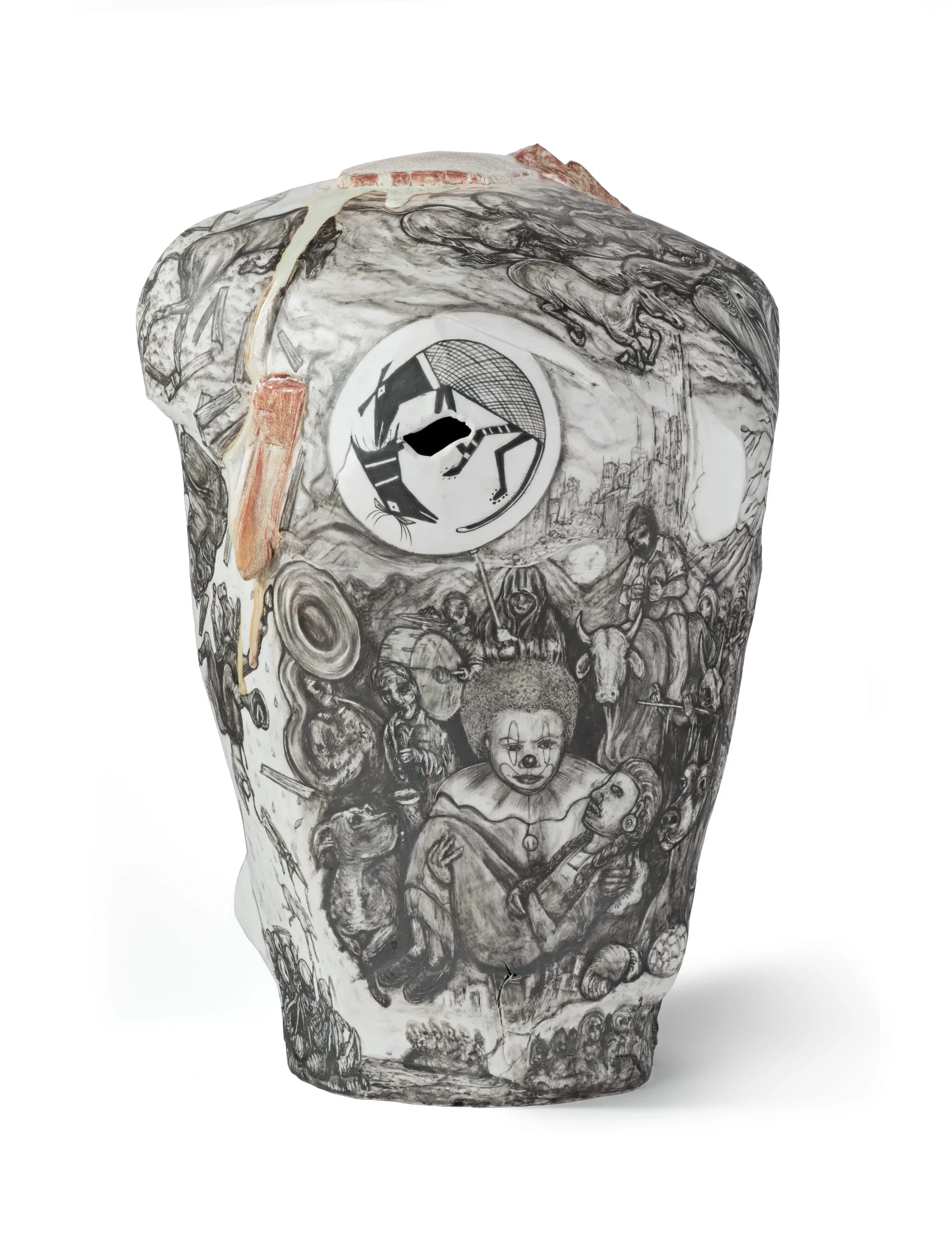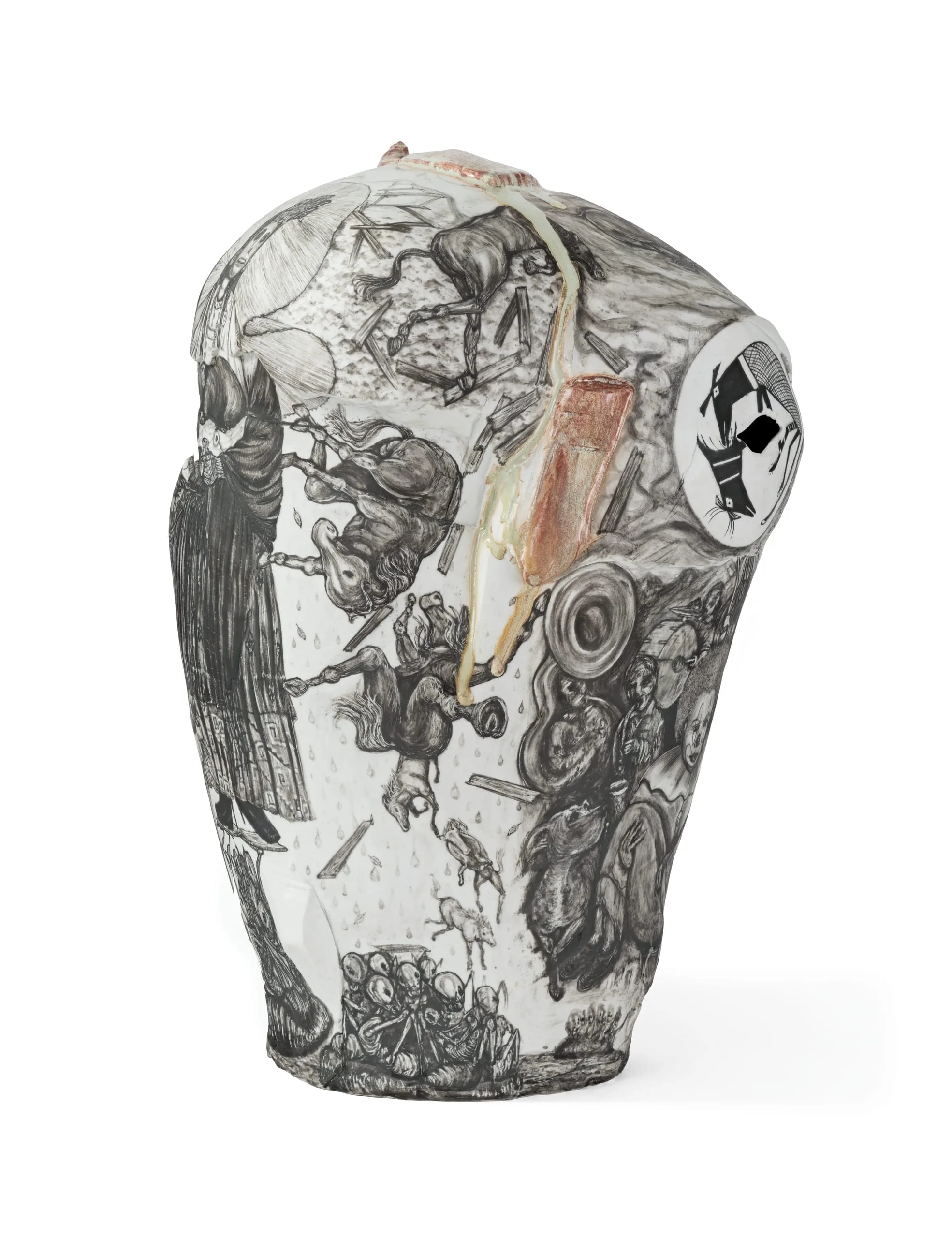 Oaxacan-born, Los Angeles-based ceramist Gerardo Monterubbio creates muscular porcelain and terracotta forms sheathed with intricate illustrations. Invoking the narrative sweep of Mexican murals as well as the aesthetics of graffiti and prison tattoos, Monterrubio explores issues of gender identity, ritual, street life, mortality, and the immigrant experience through overlapping images. Puño de Tierra is, in the artist’s words, "a meditation on certain belief systems and rituals related to death." The title, which means "fist full of dirt," is taken from a famous Mexican song. The piece’s interlocking images include references to ancient Mimbres, Zapotec, and Aztec customs and artifacts as well as traditional Oaxacan funerals and pilgrimages, the Syrian refugee crisis, and the artist’s childhood. An uncontrolled green-gray glaze drips down the sides of the vessel-like form, amplifying the piece’s themes of chance and fate.