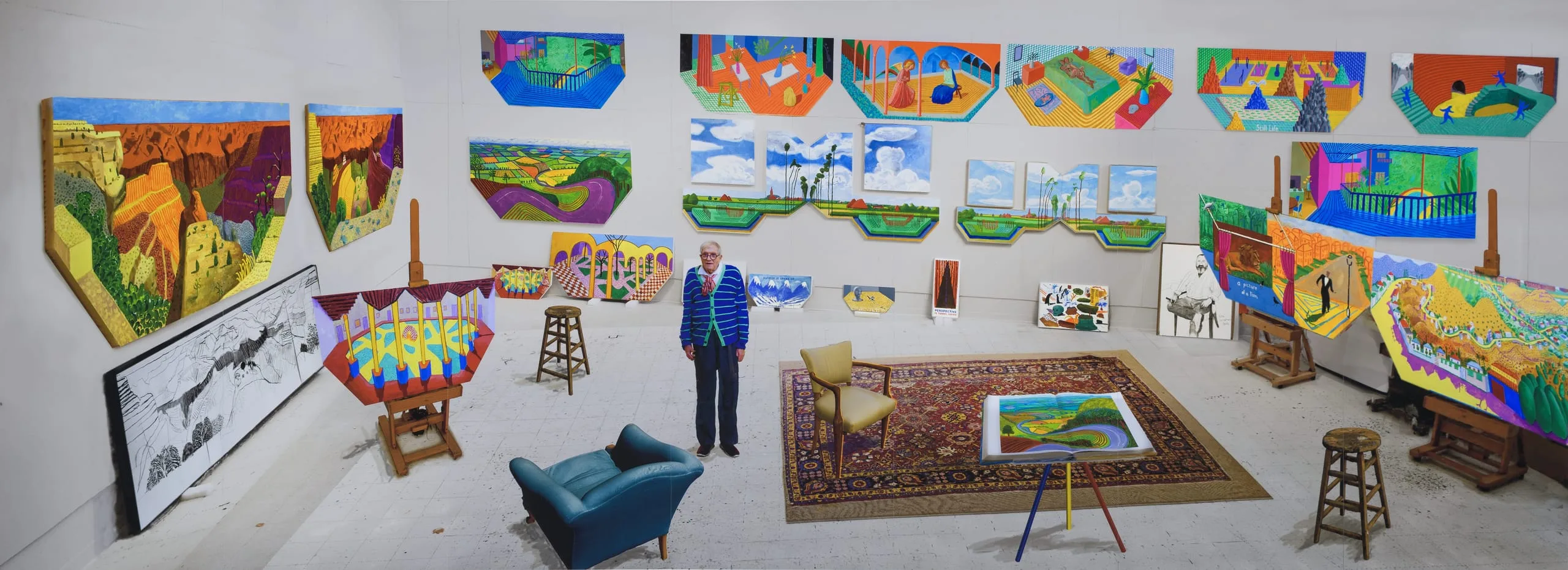 In this seven-part, mural-sized photographic work, David Hockney has positioned himself standing in the center of his Hollywood Hills studio filled with his newest paintings–vividly colorful, hexagonal canvases that explore the artist’s interest in reverse perspective, where traditional one point perspective is replaced by shifting viewpoints and sweeping vistas.