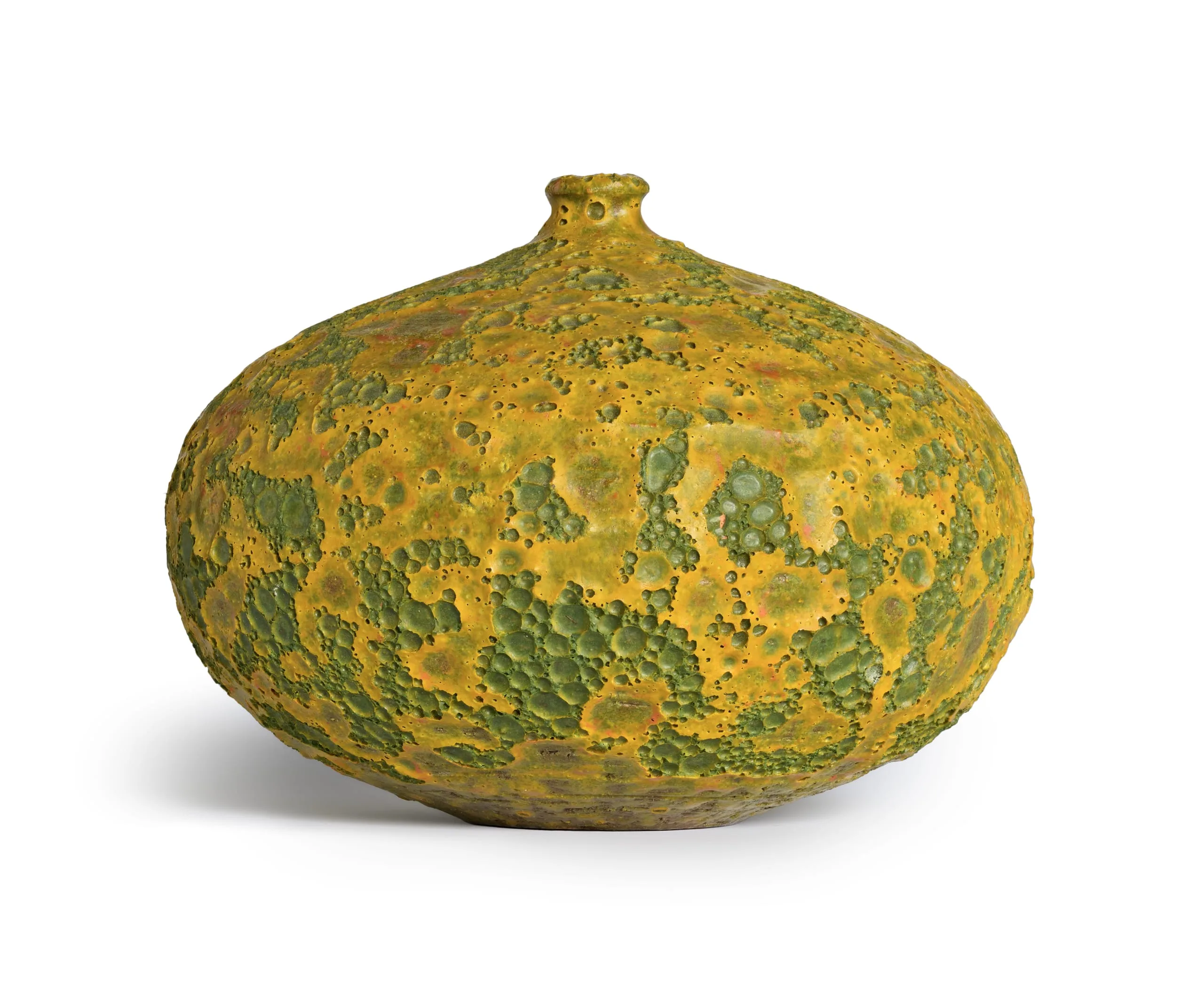 Ceramic vessel with wide, flattened spherical form and tiny neck, covered in heavily textured bubbled glaze in marigold yellow and moss green