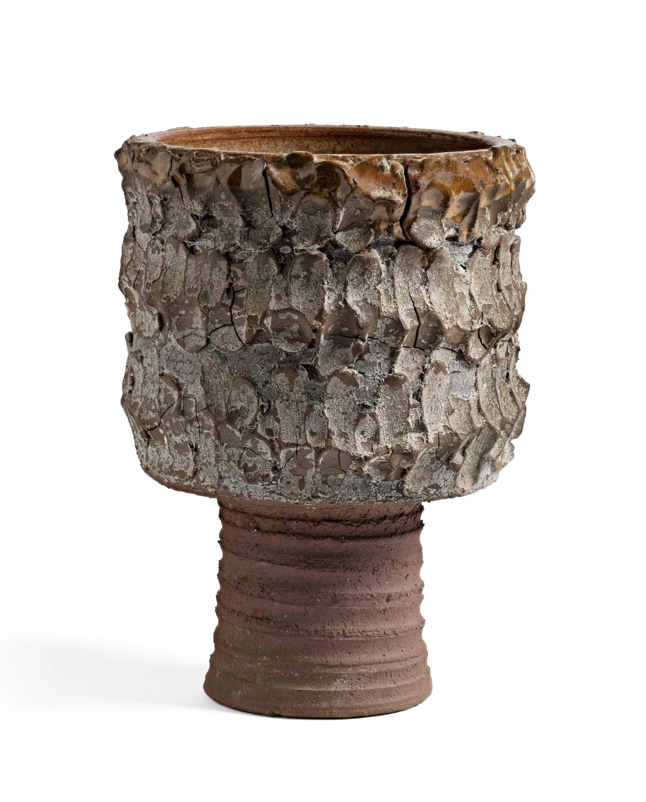 Ceramic vessel with a ribbed cylindrical pedestal foot in unglazed reddish-brown clay, topped by a wide bowl covered in rough, bark-like applied clay chunks glazed in matte gray and silver-green