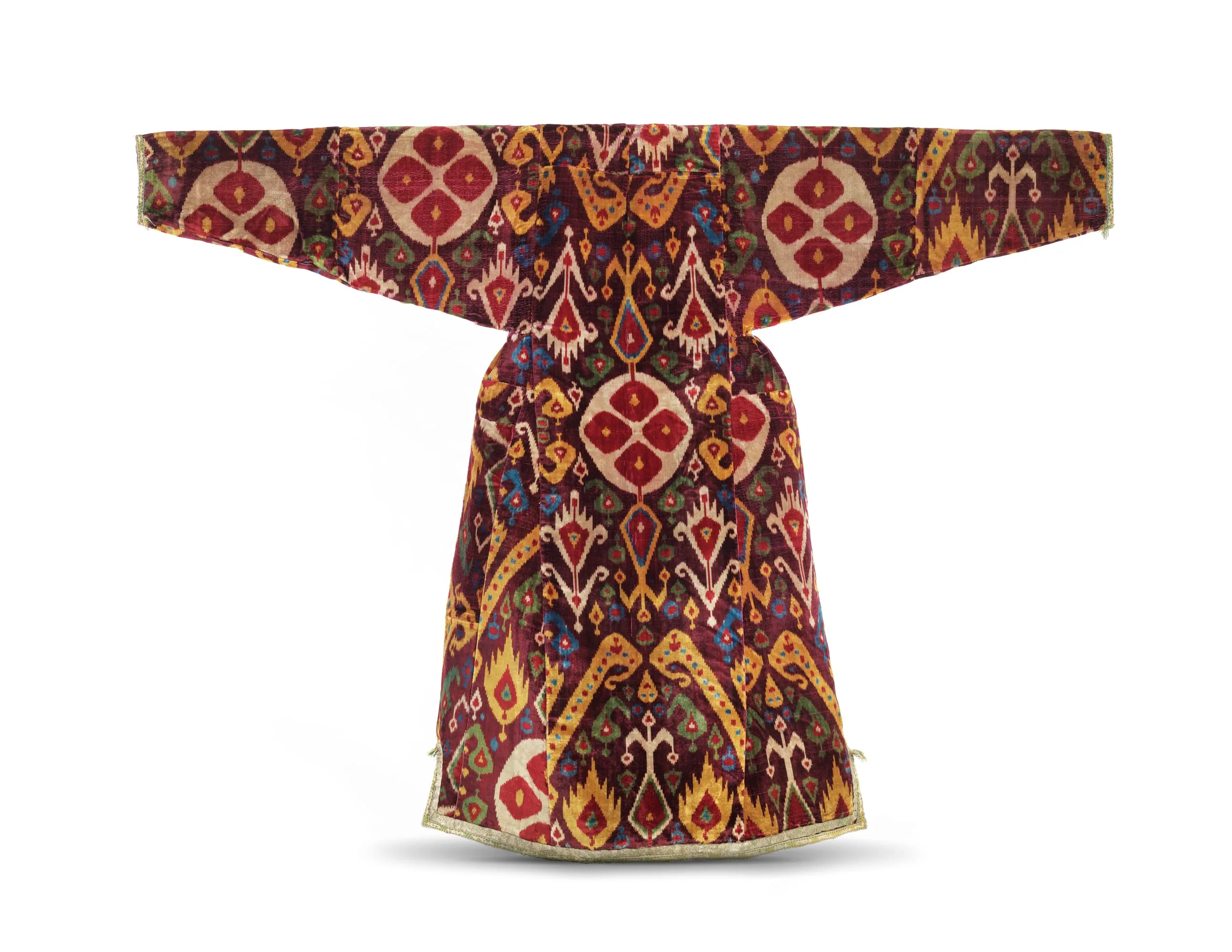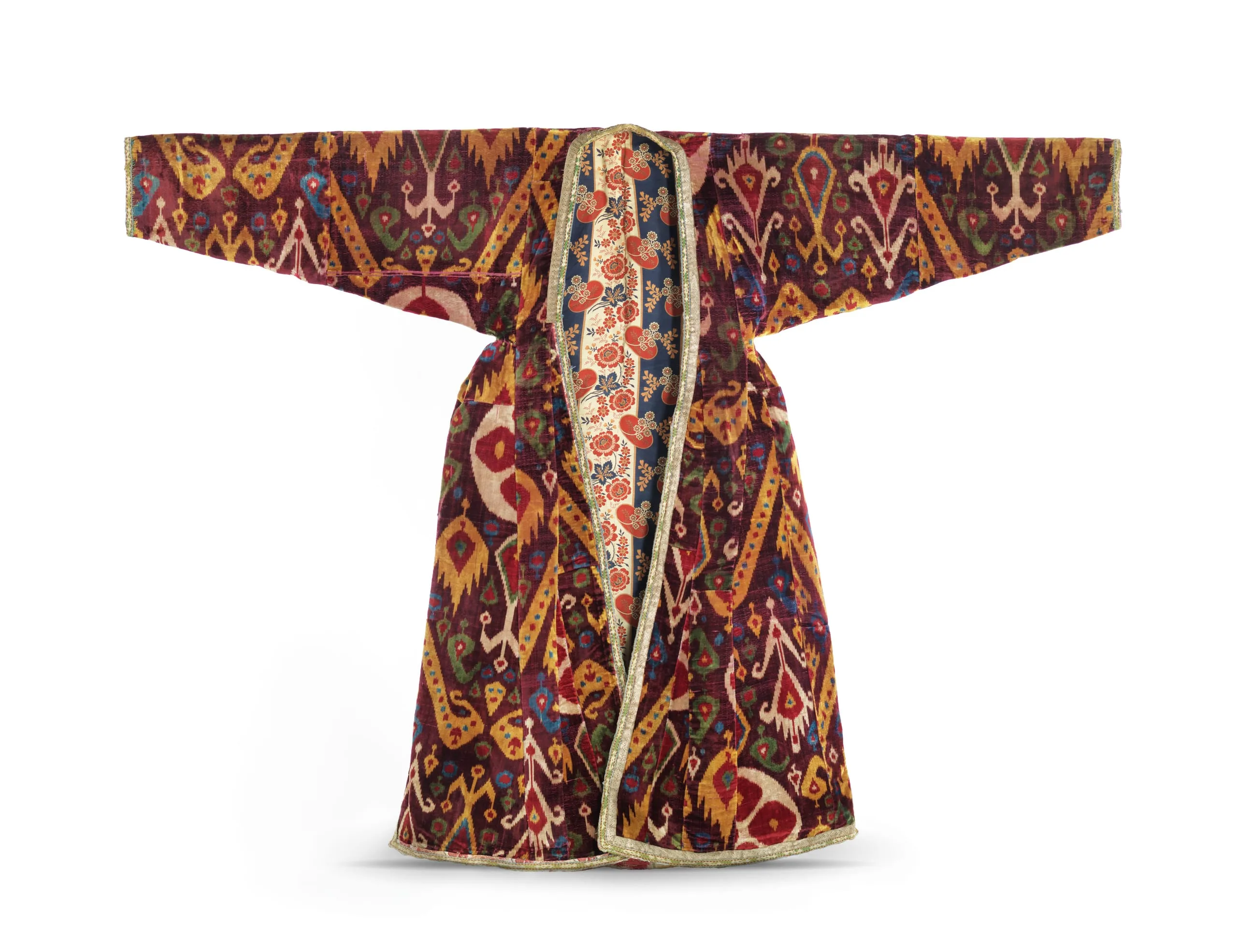 - Silk velvet with supplementary tie-resist-dyed warp (ikat) (baghmal), cotton warp-twined loop manipulation, and silk- and metallic-thread woven trim; Lining: cotton plain weave, printed, and silk and cotton plain weave with tie resist dyed warp (ikat) (adras)