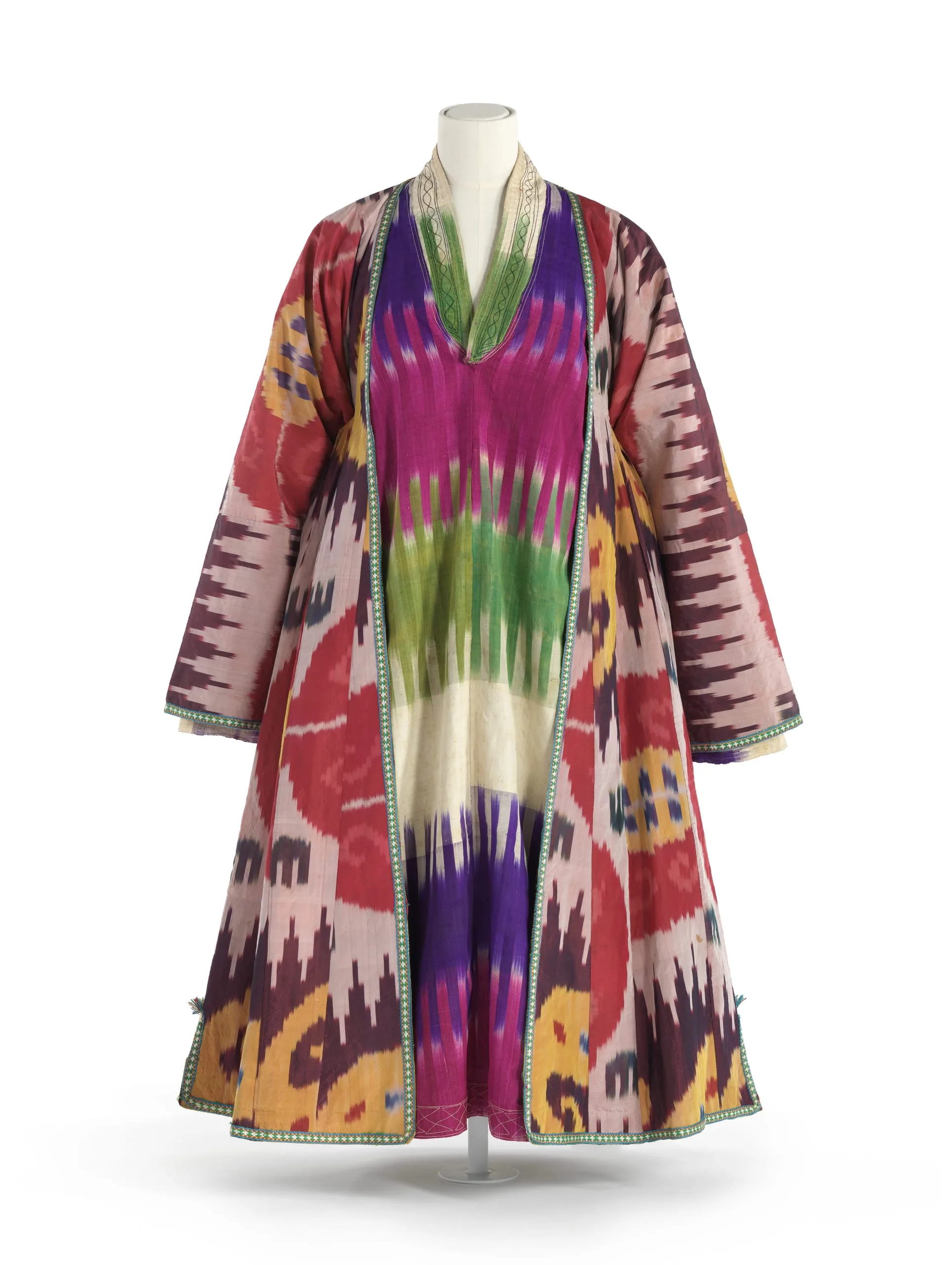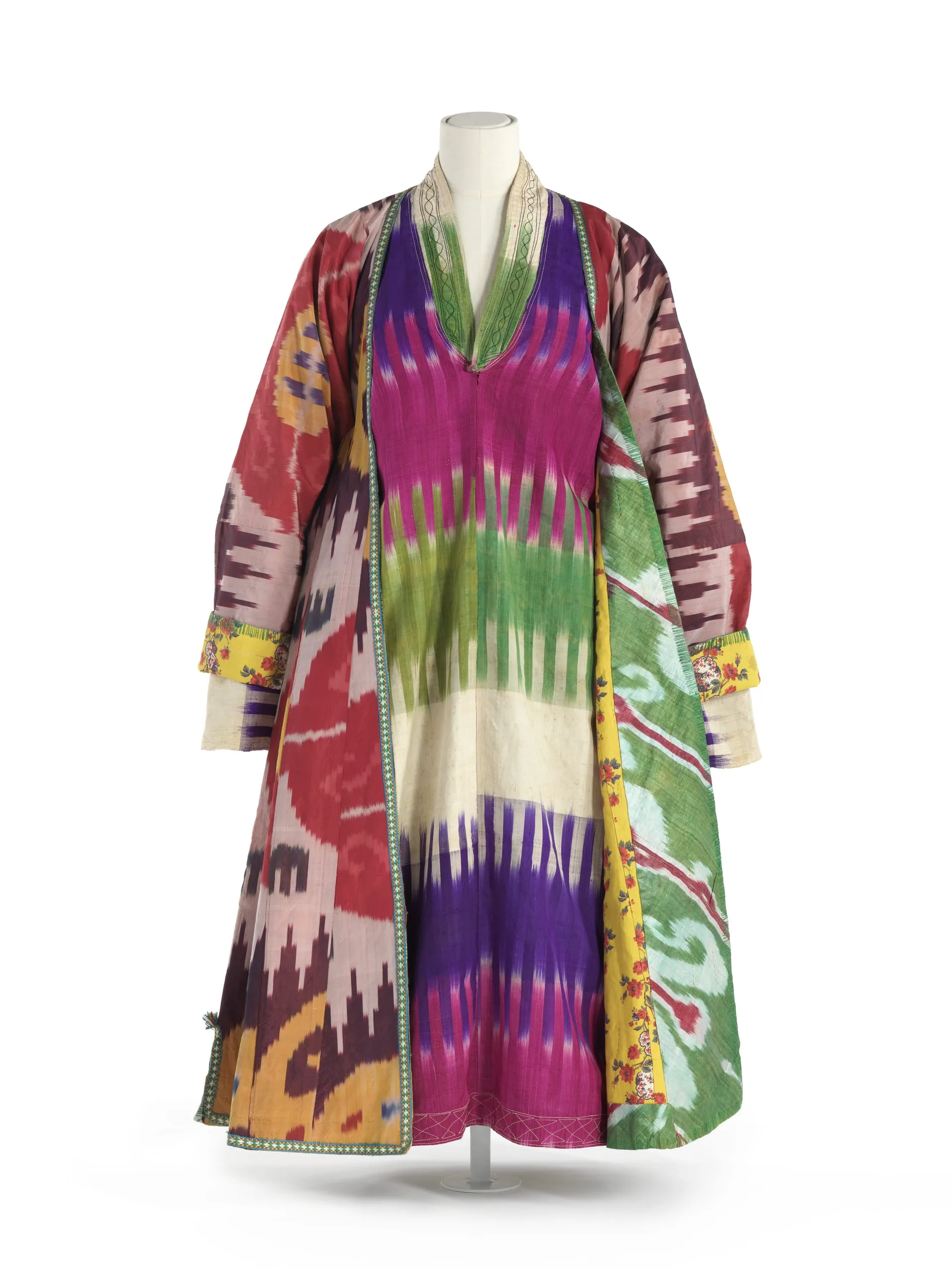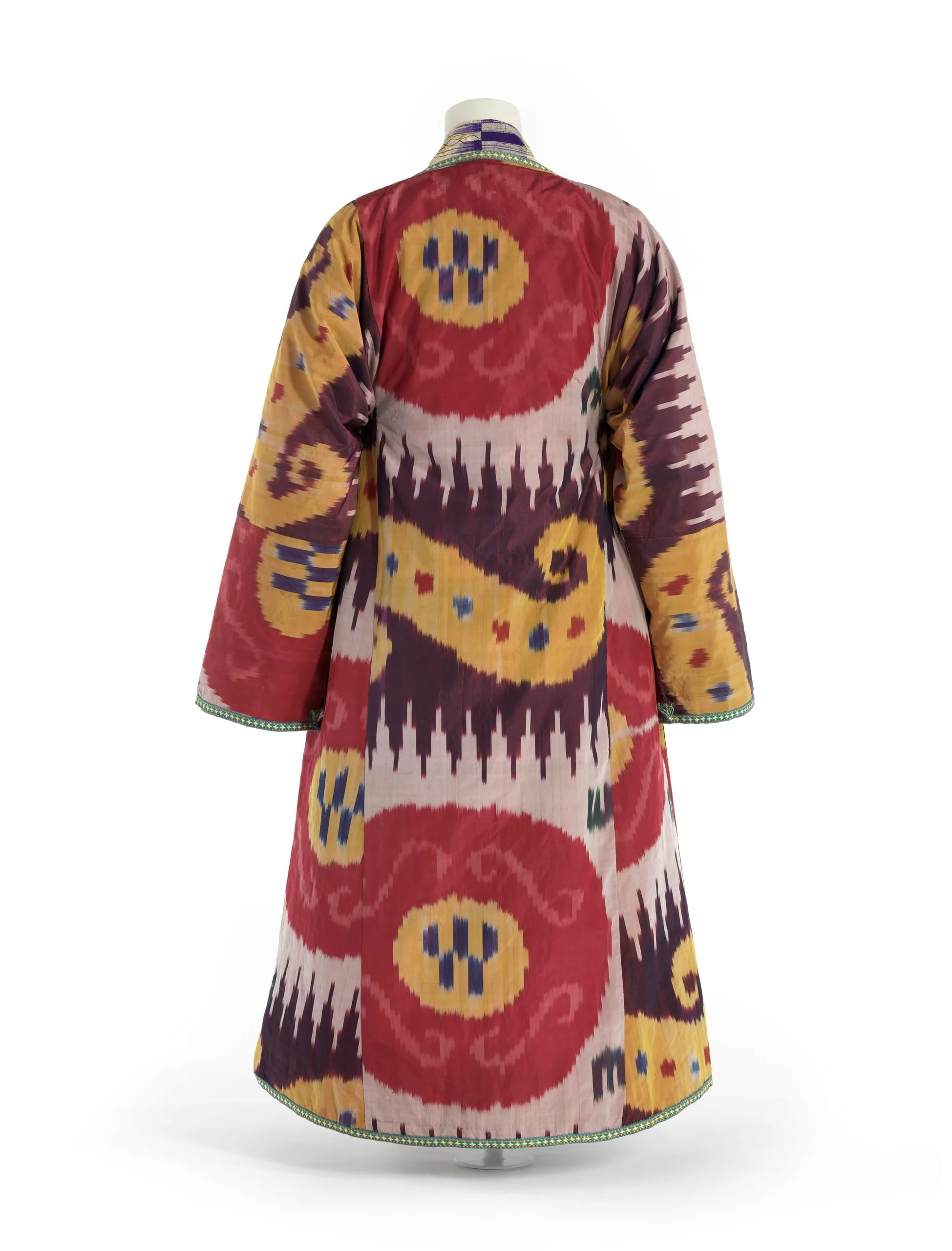 - Silk plain weave with tie-resist-dyed warp (ikat) (shahi) and silk warp-twined loop manipulation; Lining: cotton plain weave, printed, and silk and cotton plain weave with tie resist dyed warp (ikat) (adras)