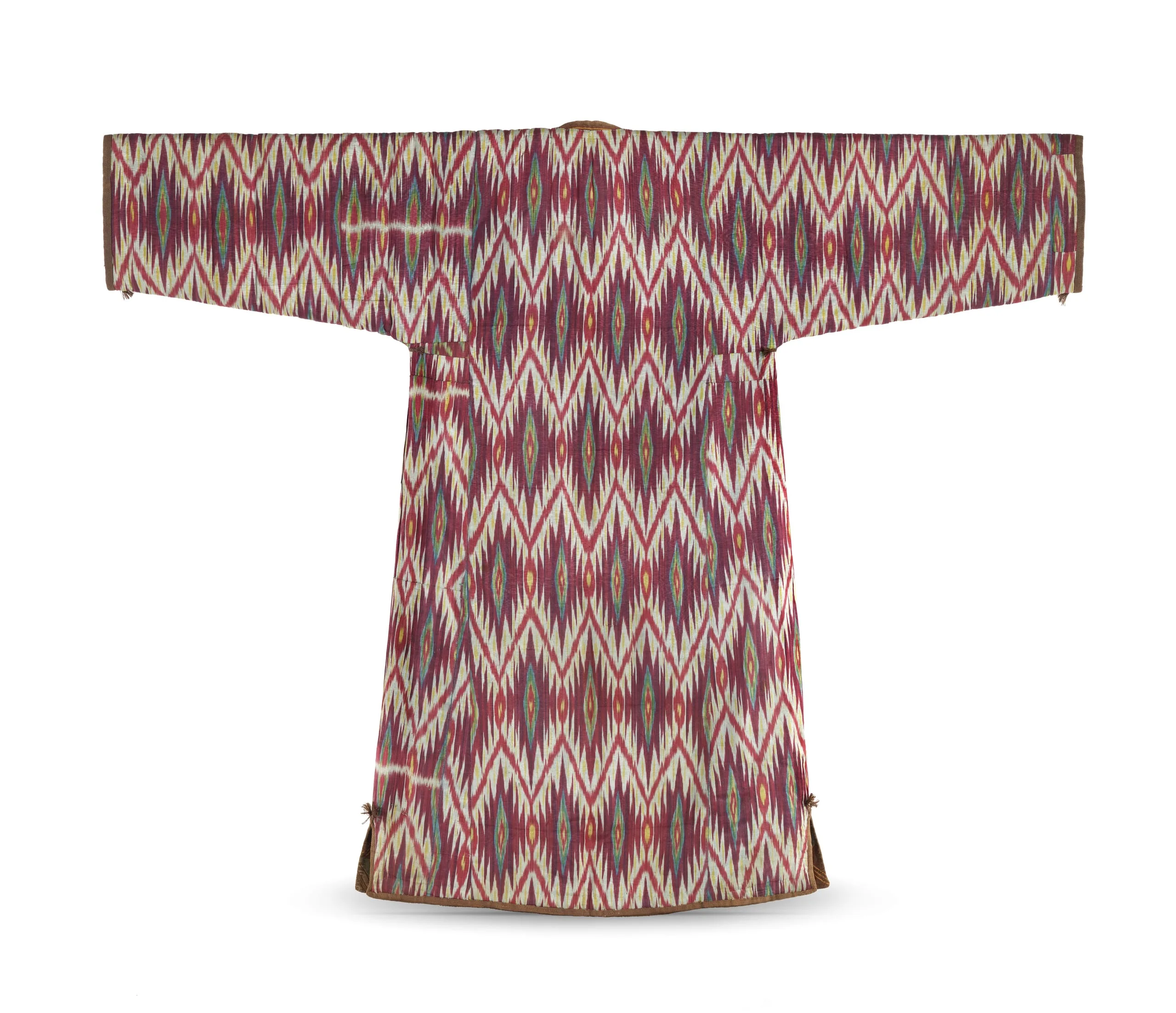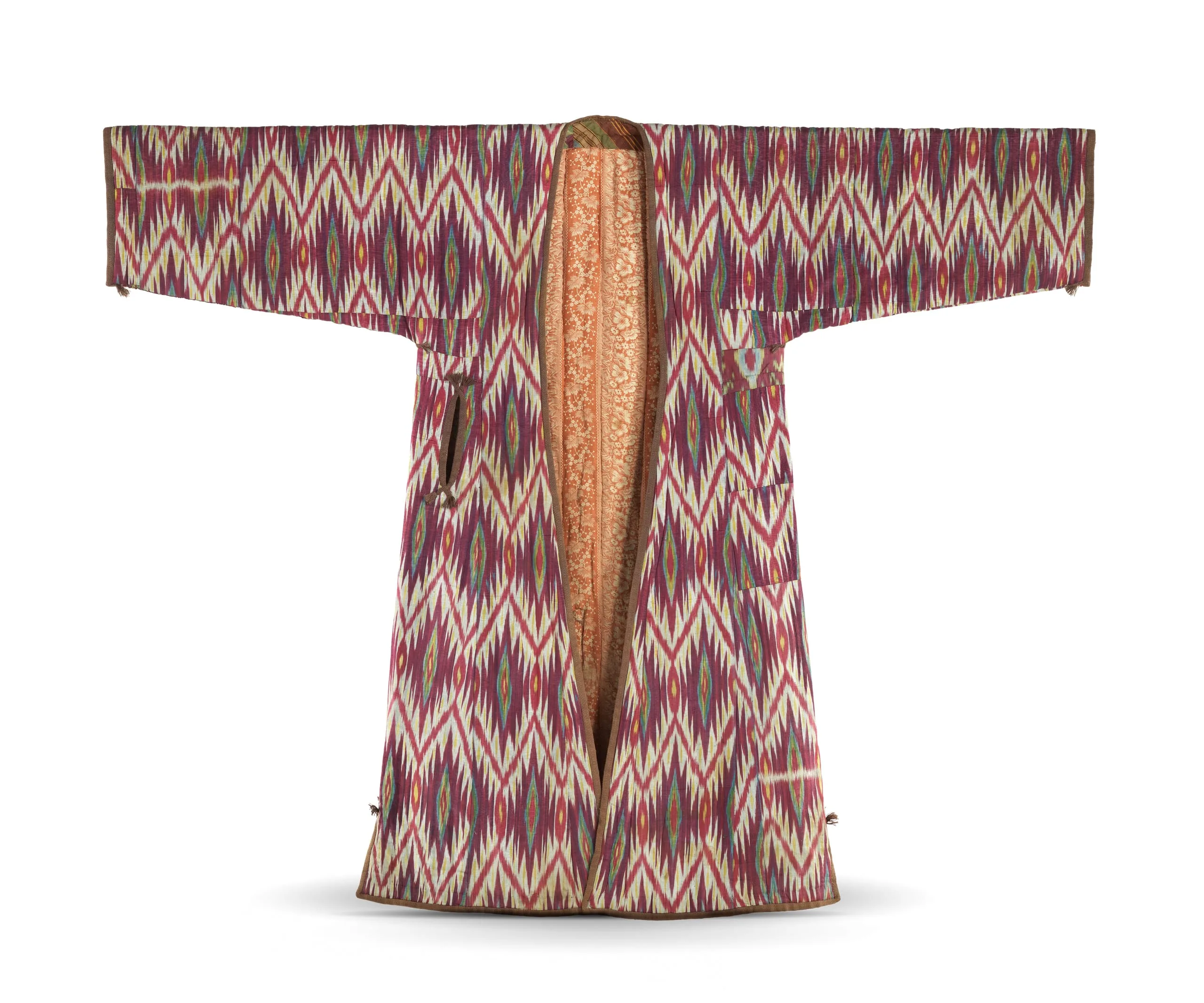 - Silk and cotton plain weave with tie-resist-dyed warp (ikat) (adras), moiré finish, quilted, and silk warp-twined loop manipulation; Lining: cotton plain weave, printed, and silk and cotton plain weave with tie-resist-dyed warp (ikat) (adras)