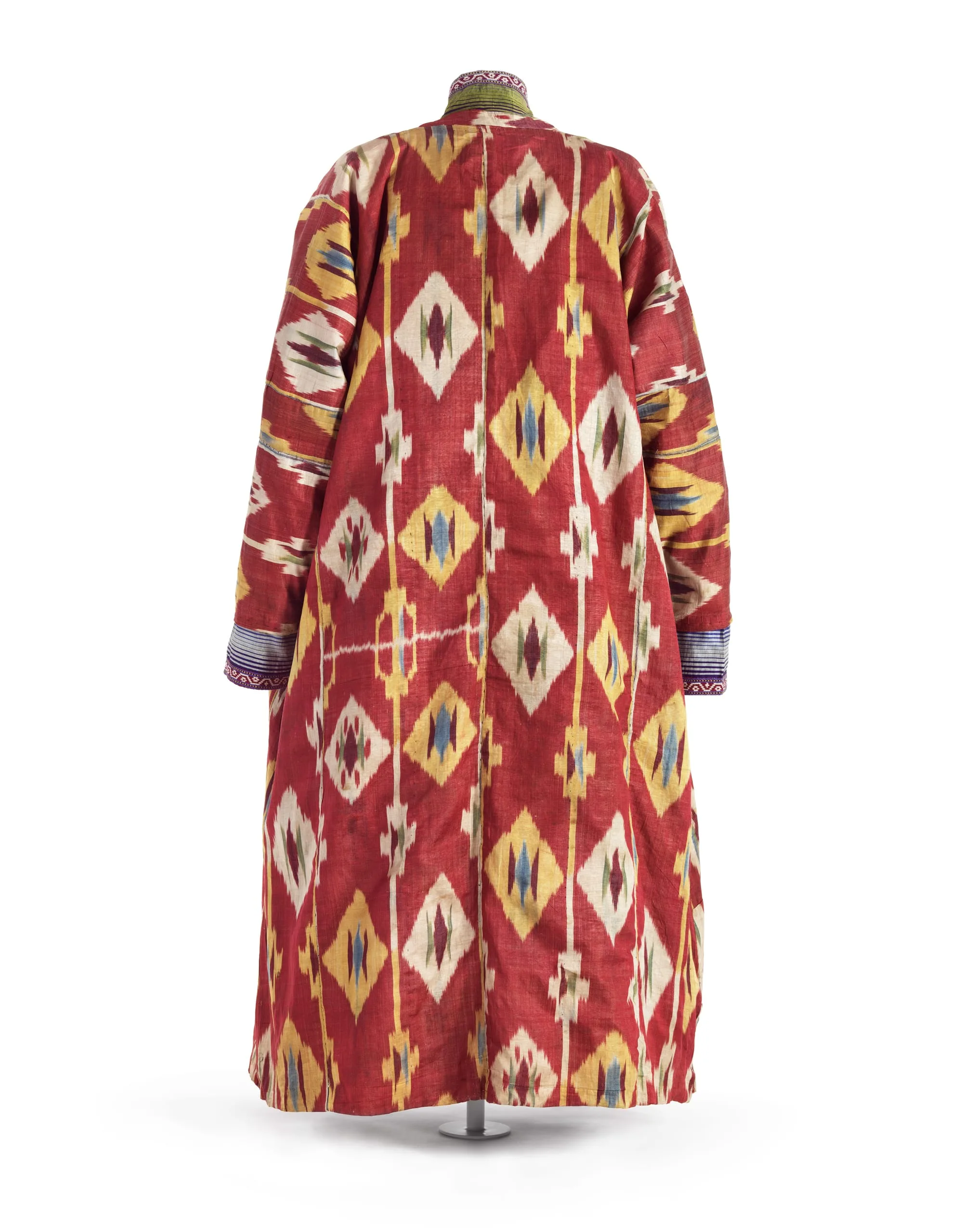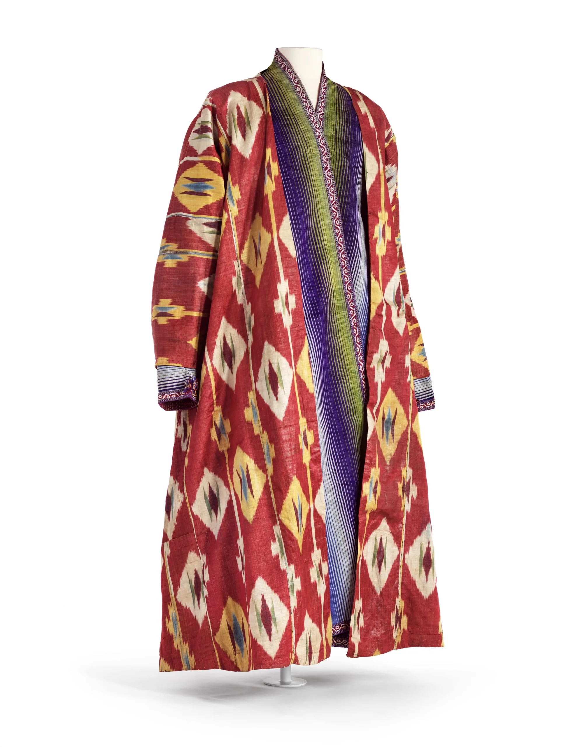 - Silk and cotton plain weave with tie-resist-dyed warp (ikat) (adras), moiré and glazed finish; Lining: cotton plain weave, printed