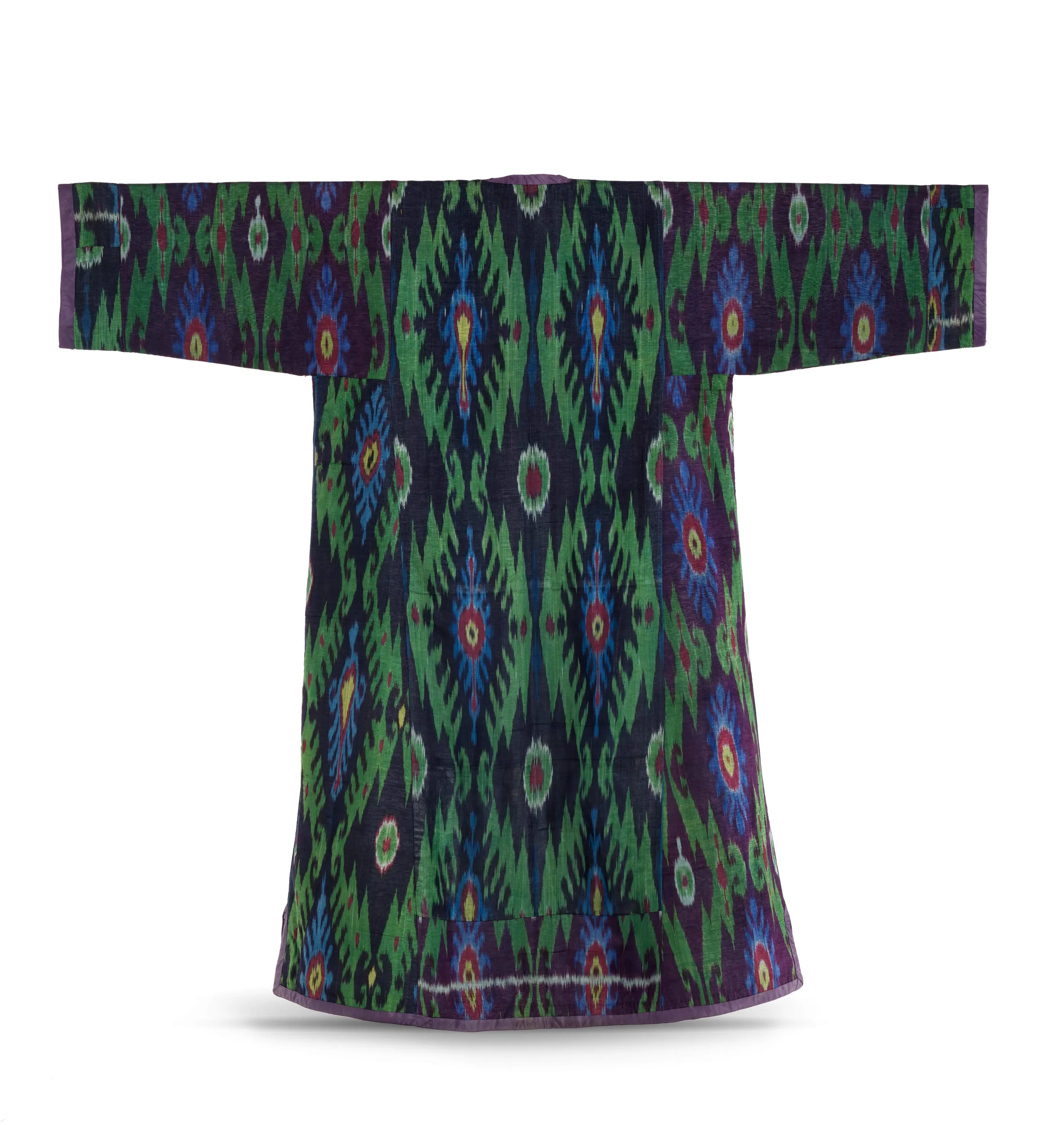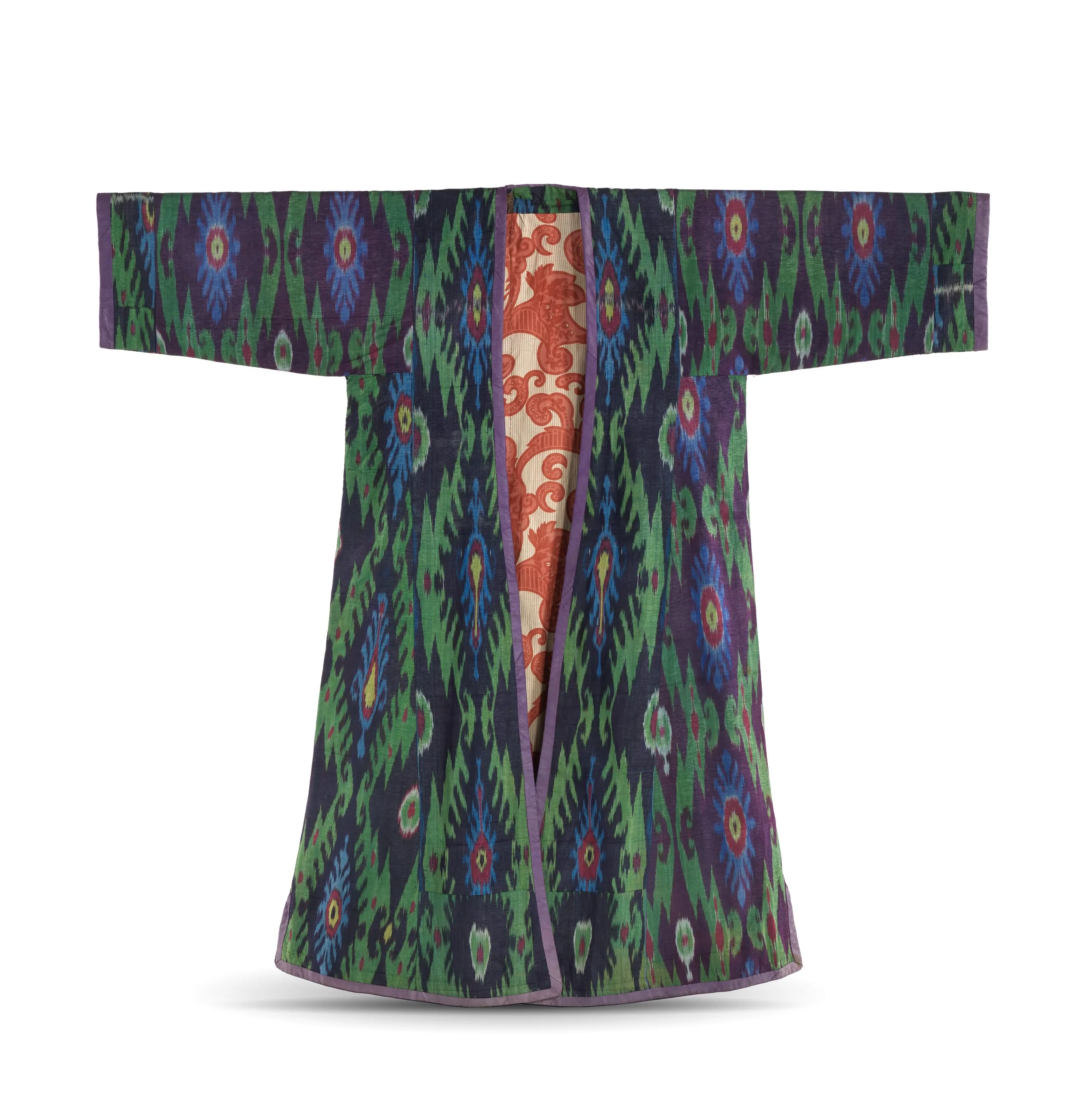 - Silk and cotton plain weave with tie-resist-dyed warp (ikat) (adras), moiré finish, and cotton twill trim; Lining: cotton plain weave, printed, and silk and cotton plain weave with tie-resist-dyed warp (ikat) (adras)