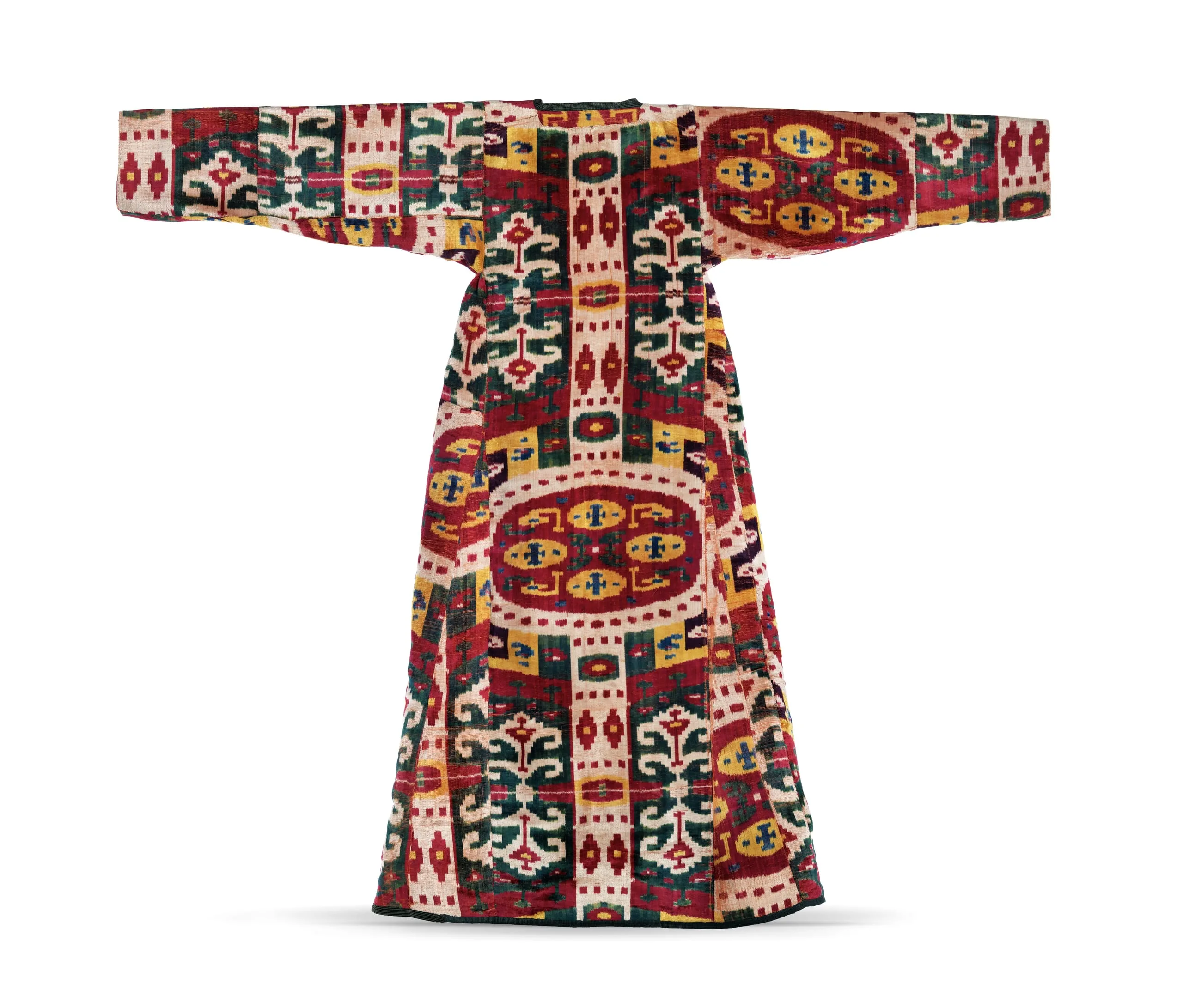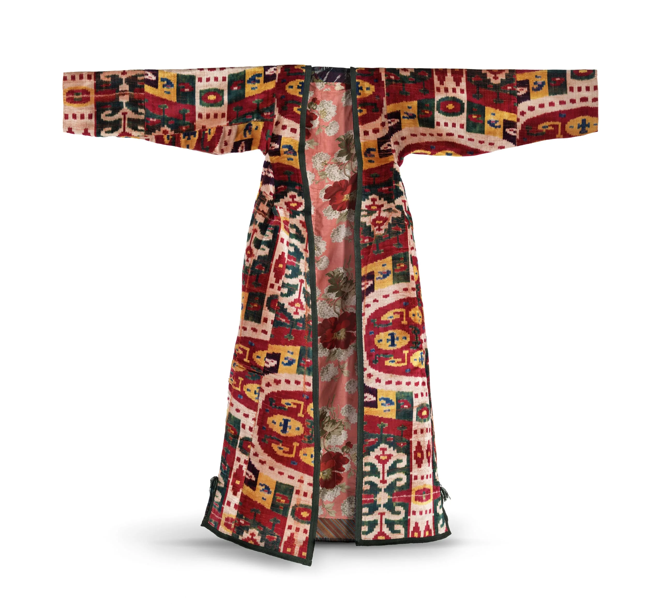 - Silk velvet with supplementary tie-resist-dyed warp (ikat) (baghmal), and silk warp-twined loop manipulation; Lining: cotton plain weave, printed, with silk and cotton plain weave with tie resist dyed warp (ikat) (adras), and cotton twill
