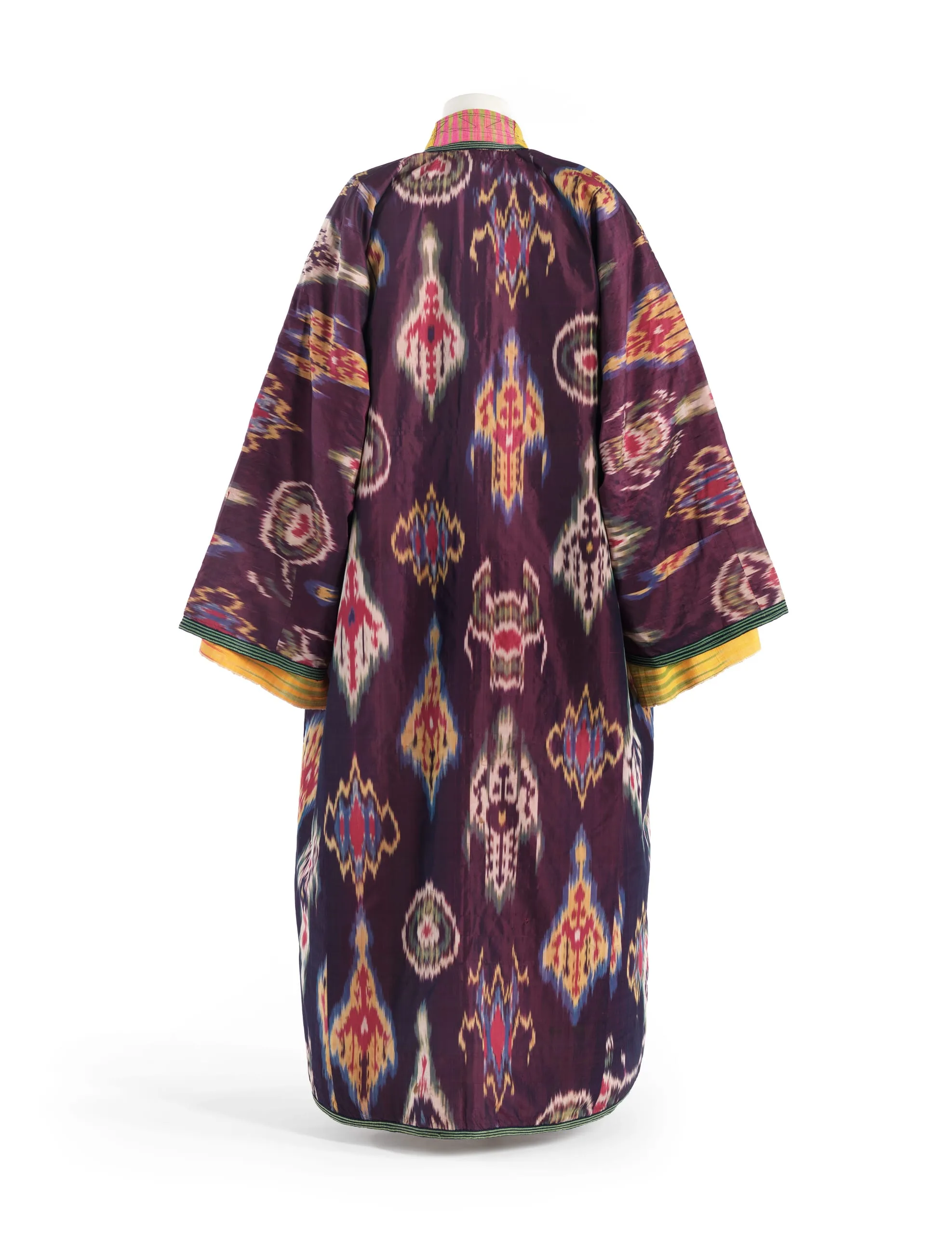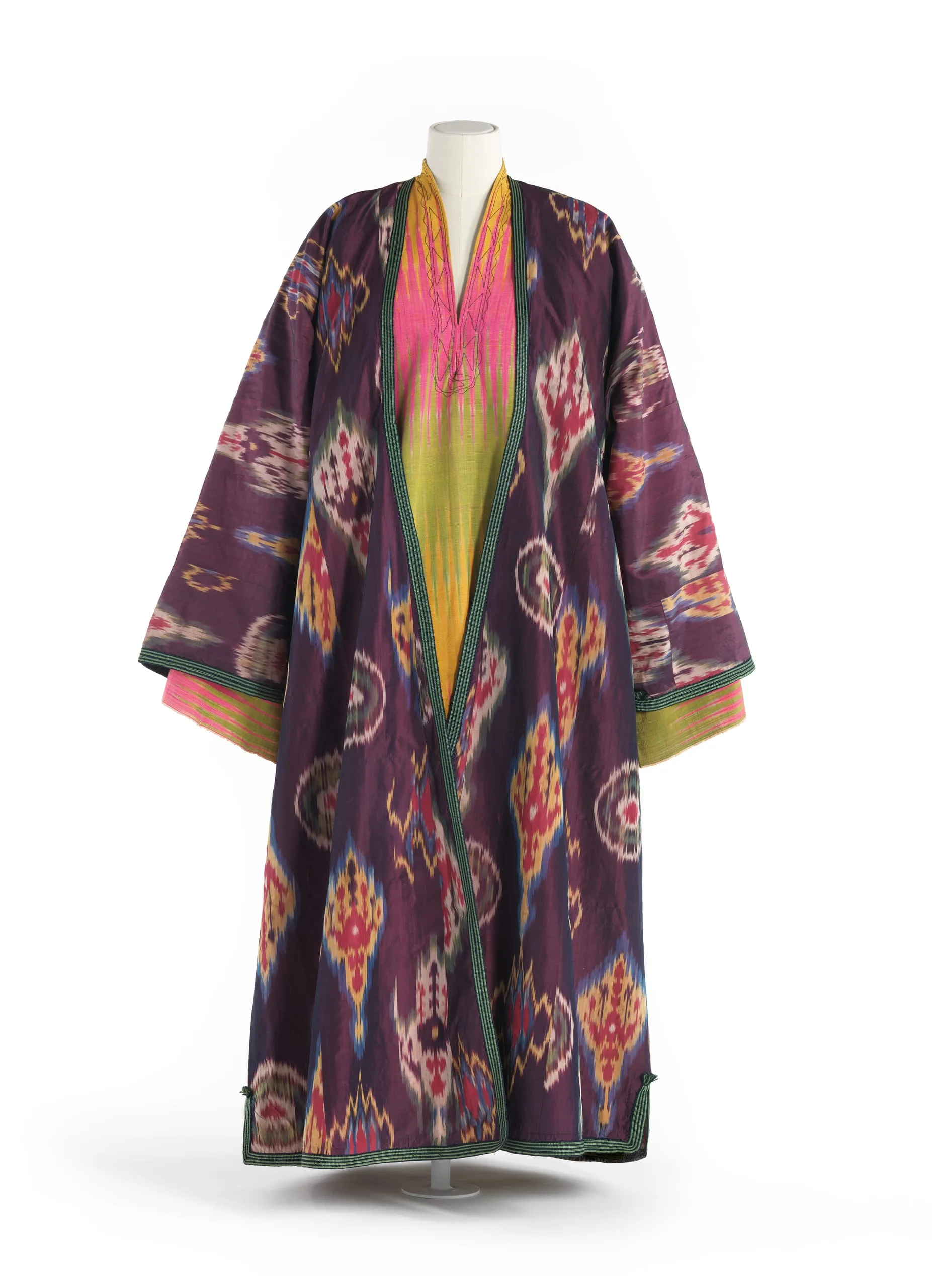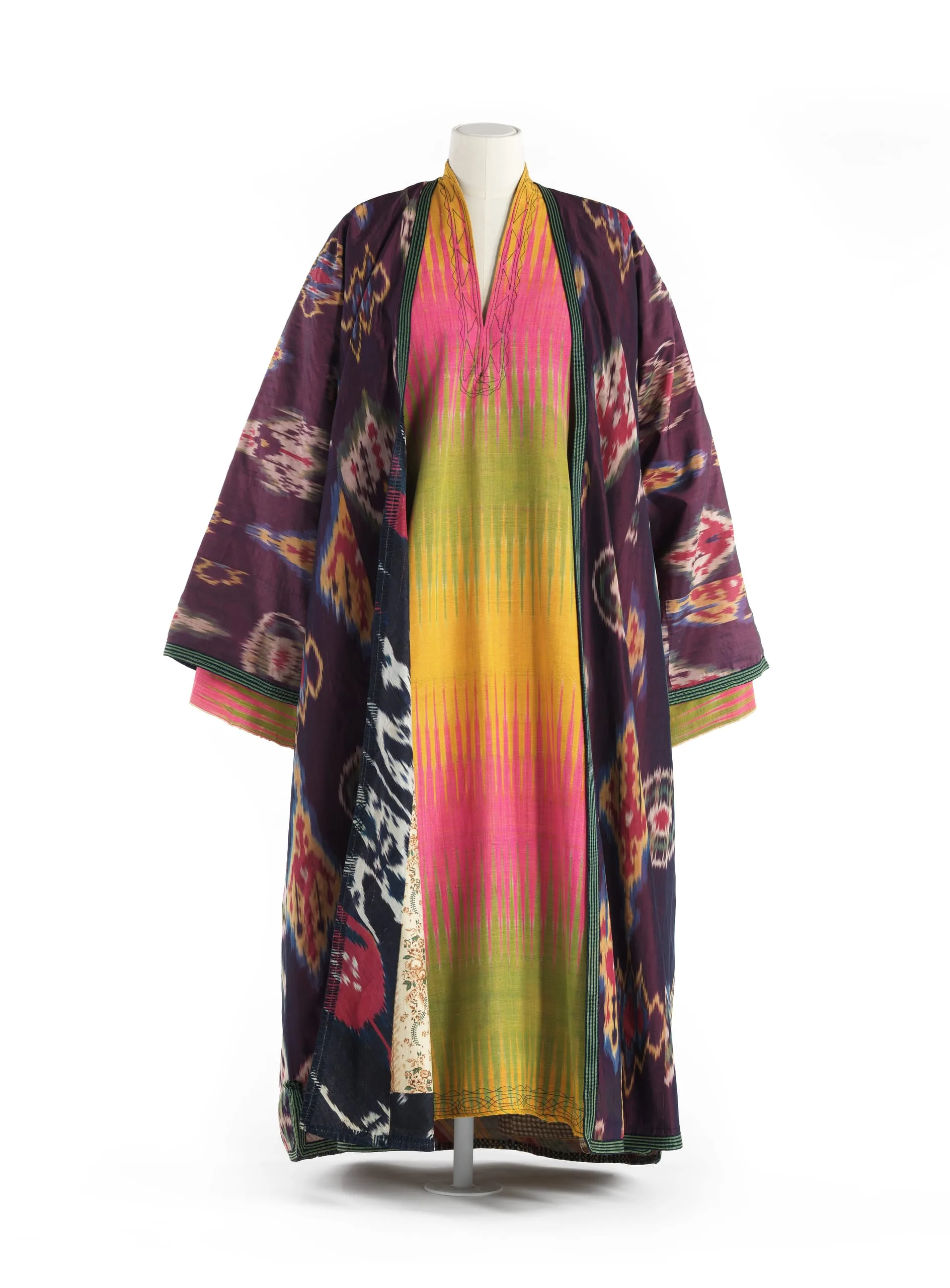 - Silk plain weave with tie-resist-dyed warp (ikat) (shahi) and silk warp-twined loop manipulation; Lining: cotton plain weave, printed, silk and cotton plain weave with tie resist dyed warp (ikat) (adras), and cotton plain weave