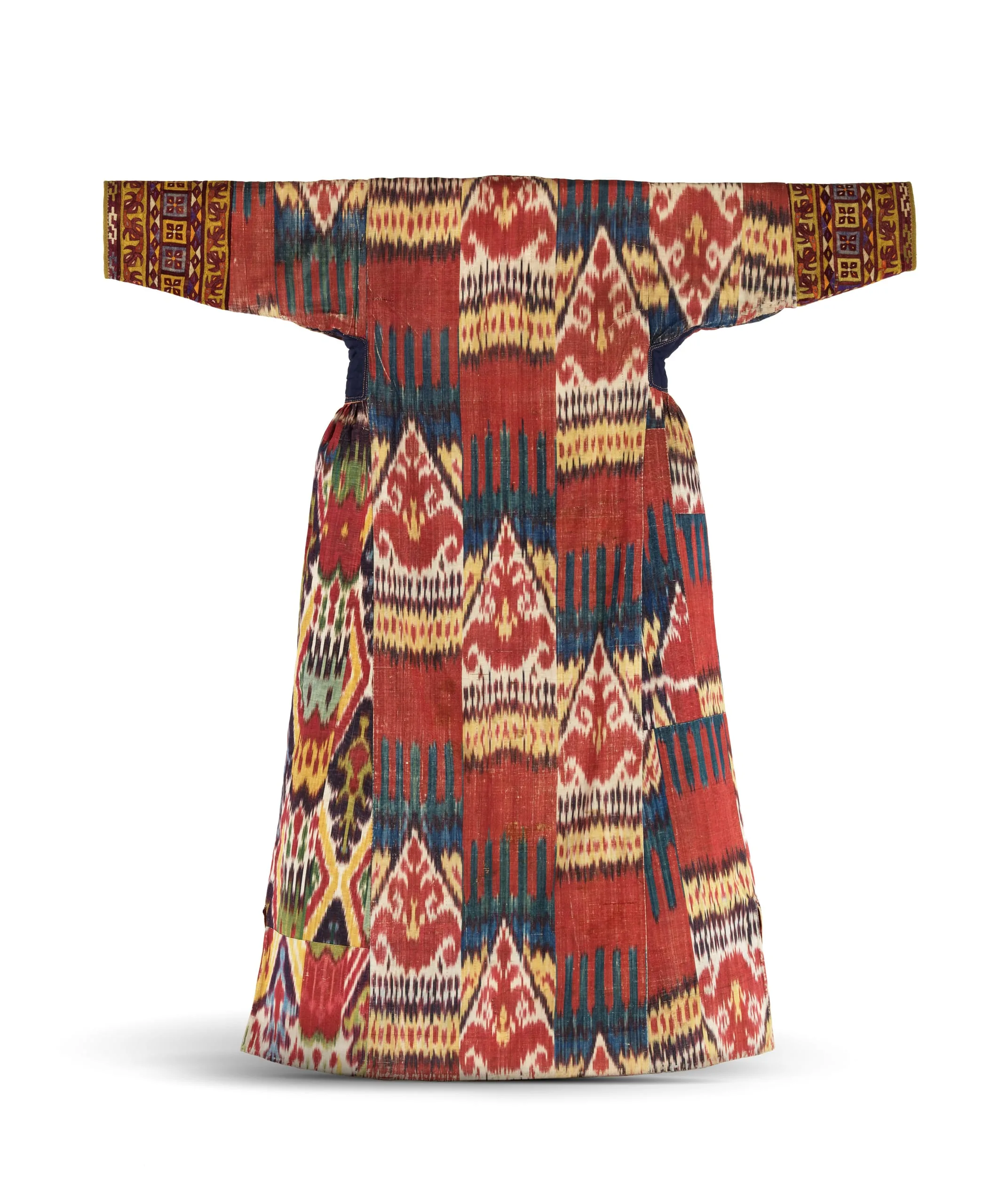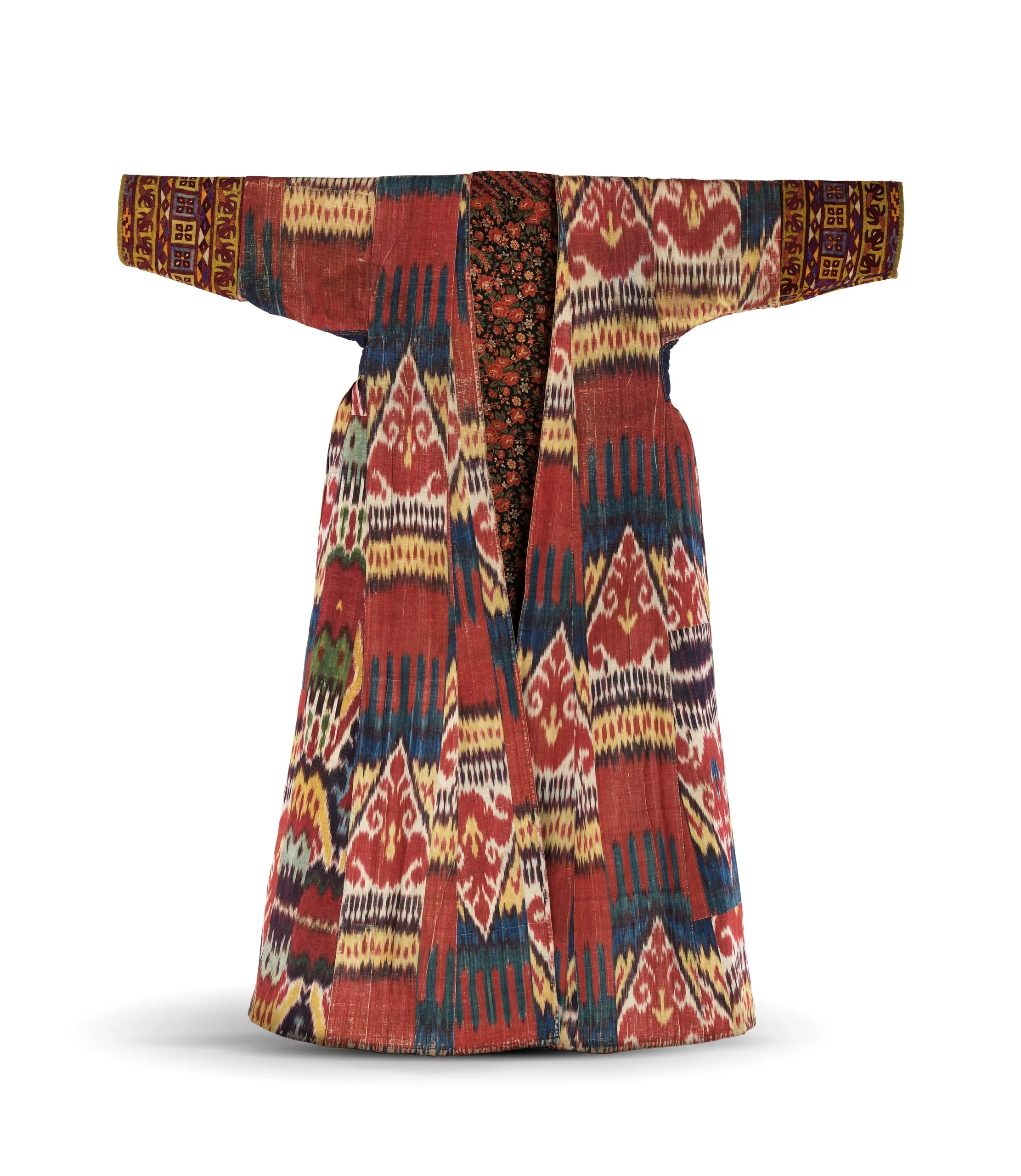 - Silk and cotton plain weave with tie-resist-dyed warp (ikat) (adras), silk double chain-stitch embroidery, and cotton twill; Lining: cotton plain weave, printed, and cotton plain weave