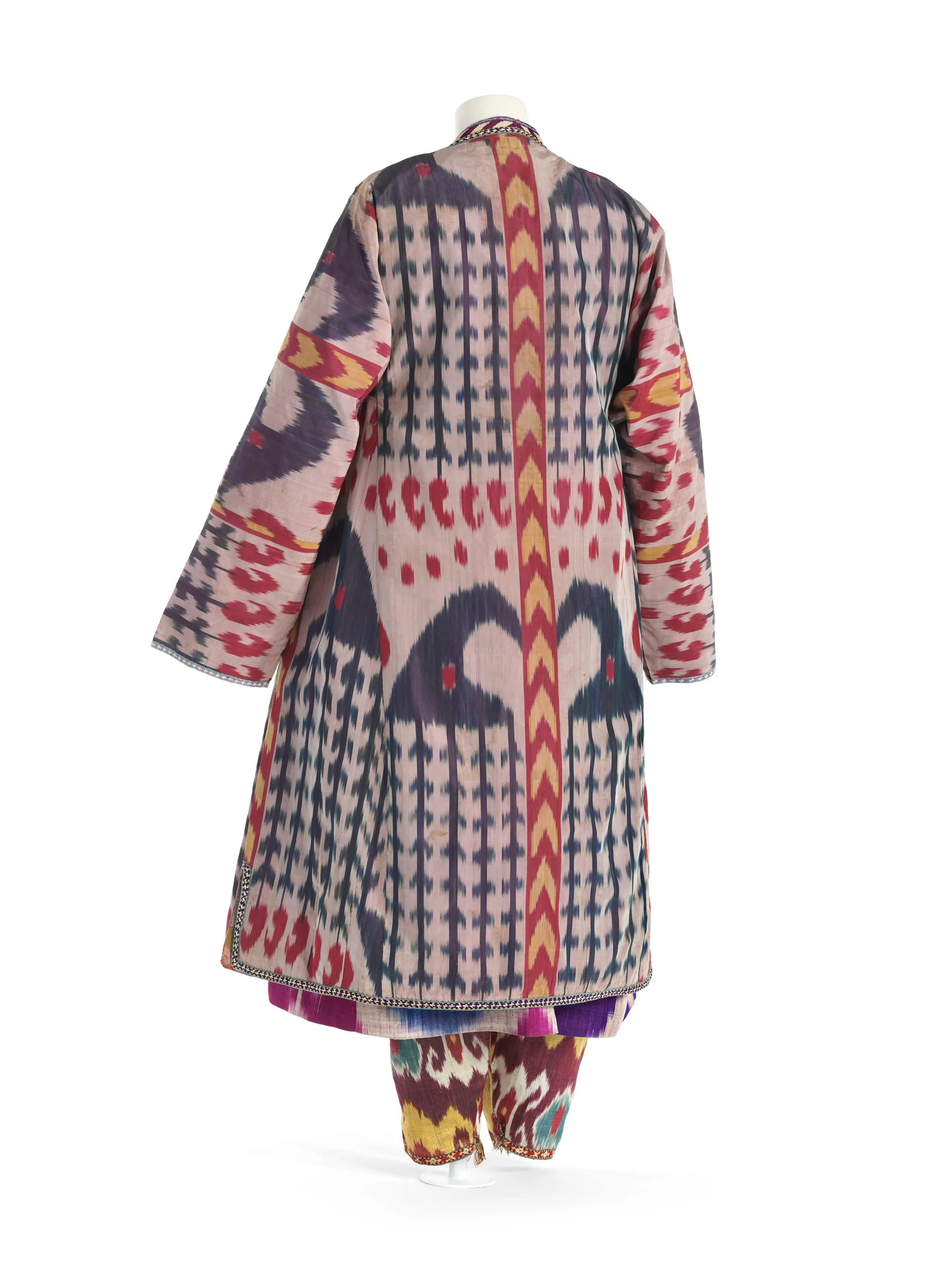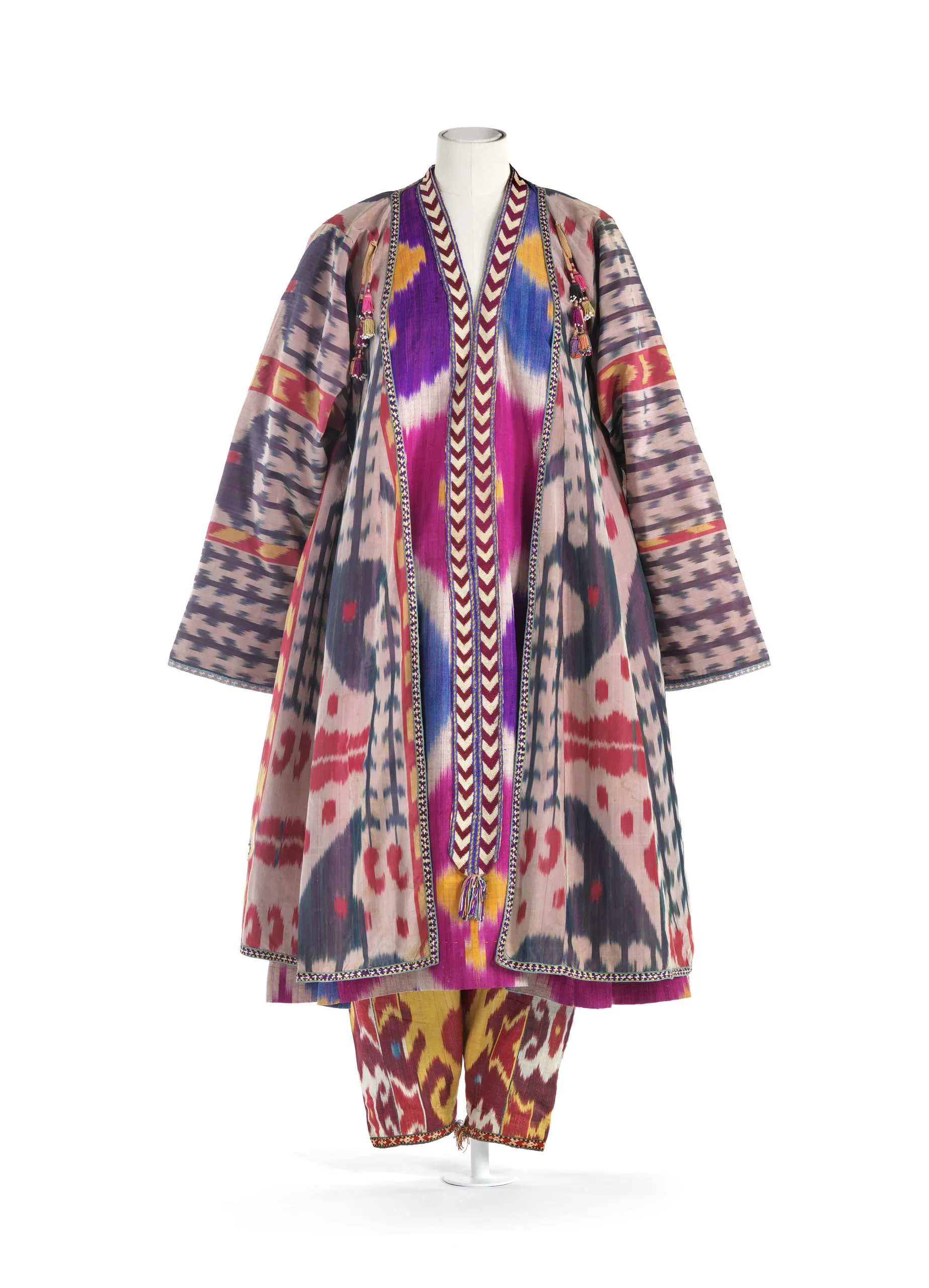 - Silk plain weave with tie-resist-dyed warp (ikat) (shahi), silk and cotton chain-stitch embroidered trim, cotton braid, and cotton and glass bead tassels; Lining: cotton plain weave, printed, silk and cotton plain weave with tie resist dyed warp (ikat) (adras), and cotton twill