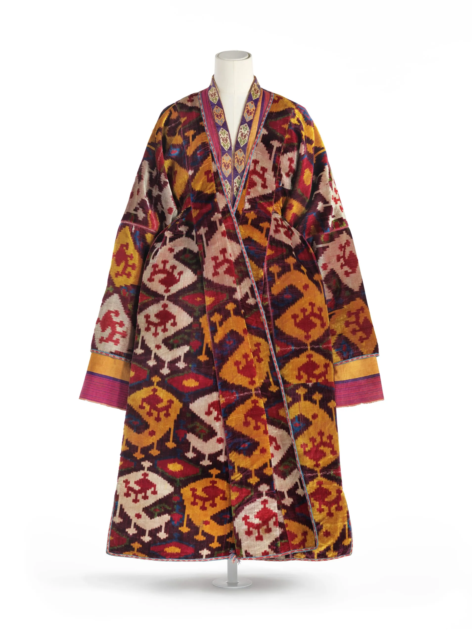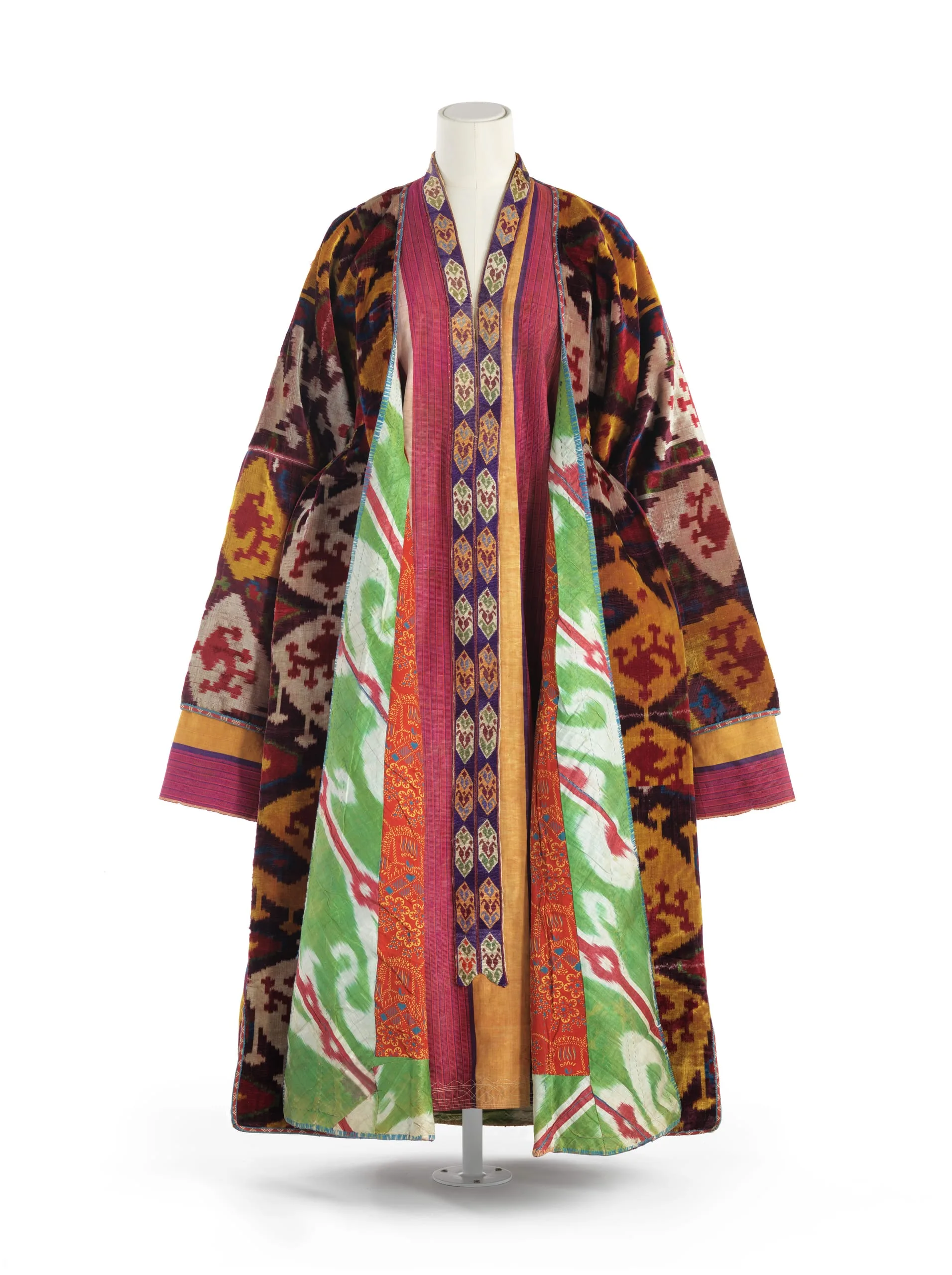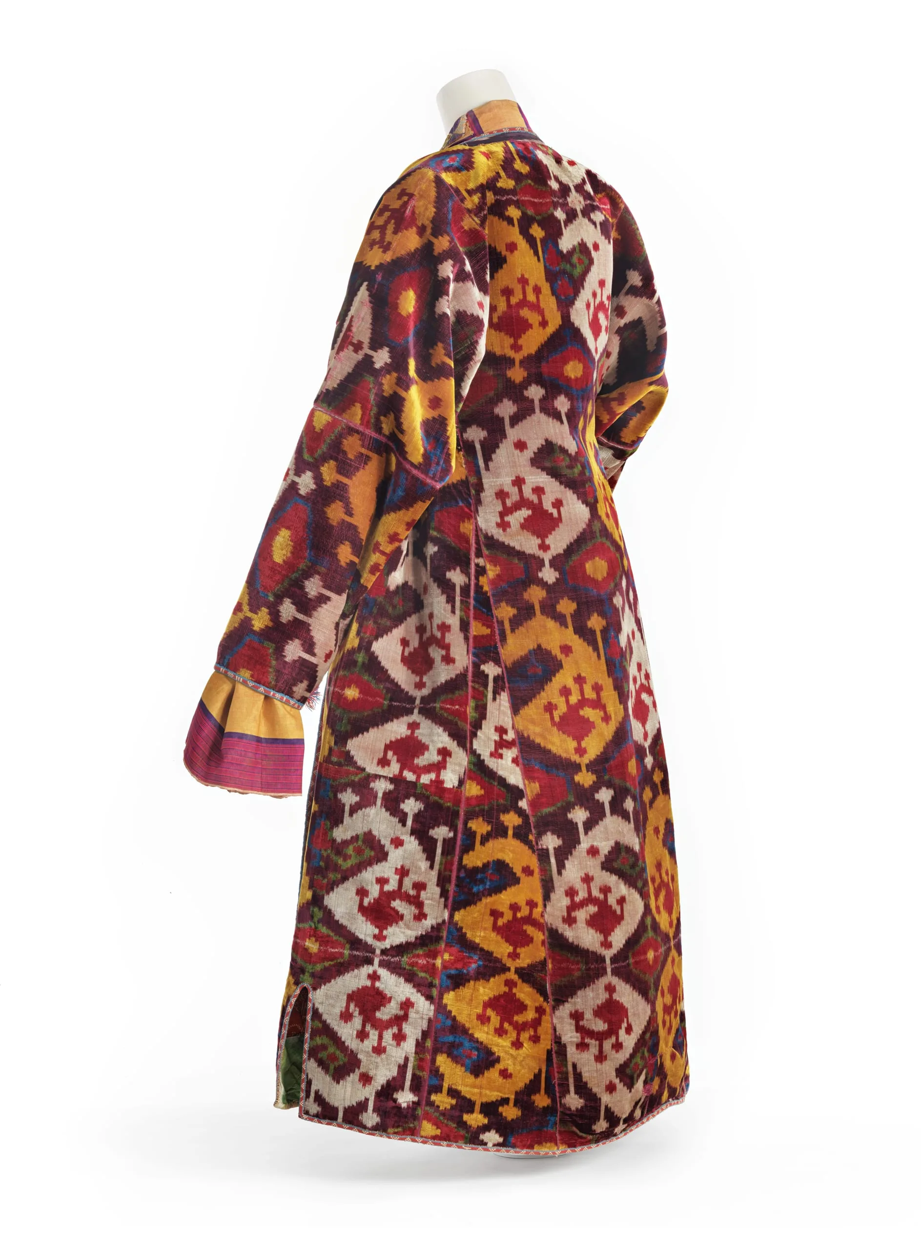- Silk velvet with supplementary tie-resist-dyed warp (ikat) (baghmal) and silk warp-twined loop manipulation; Lining: cotton plain weave, printed, and silk and cotton plain weave with tie-resist-dyed warp (ikat) (adras)