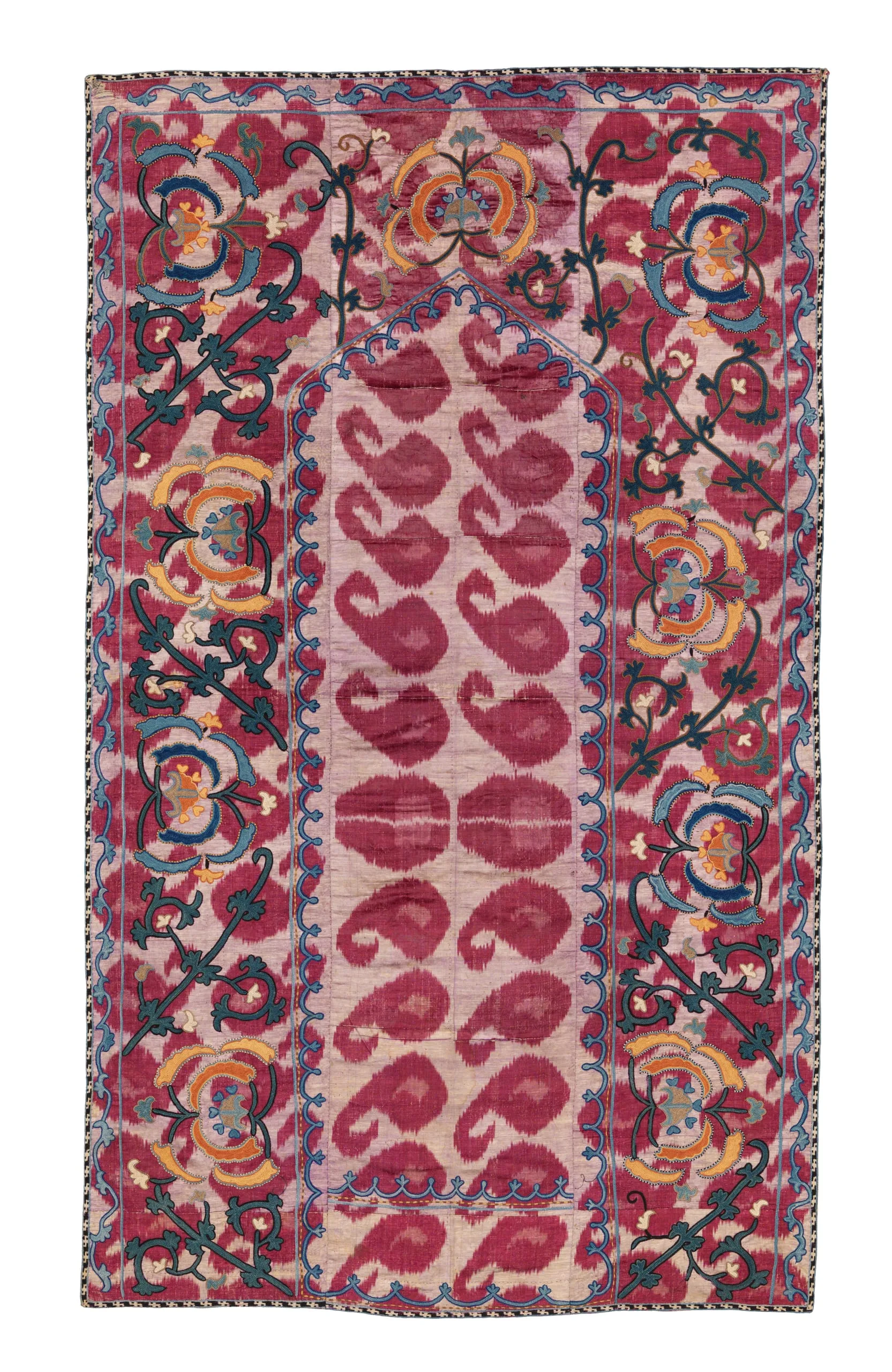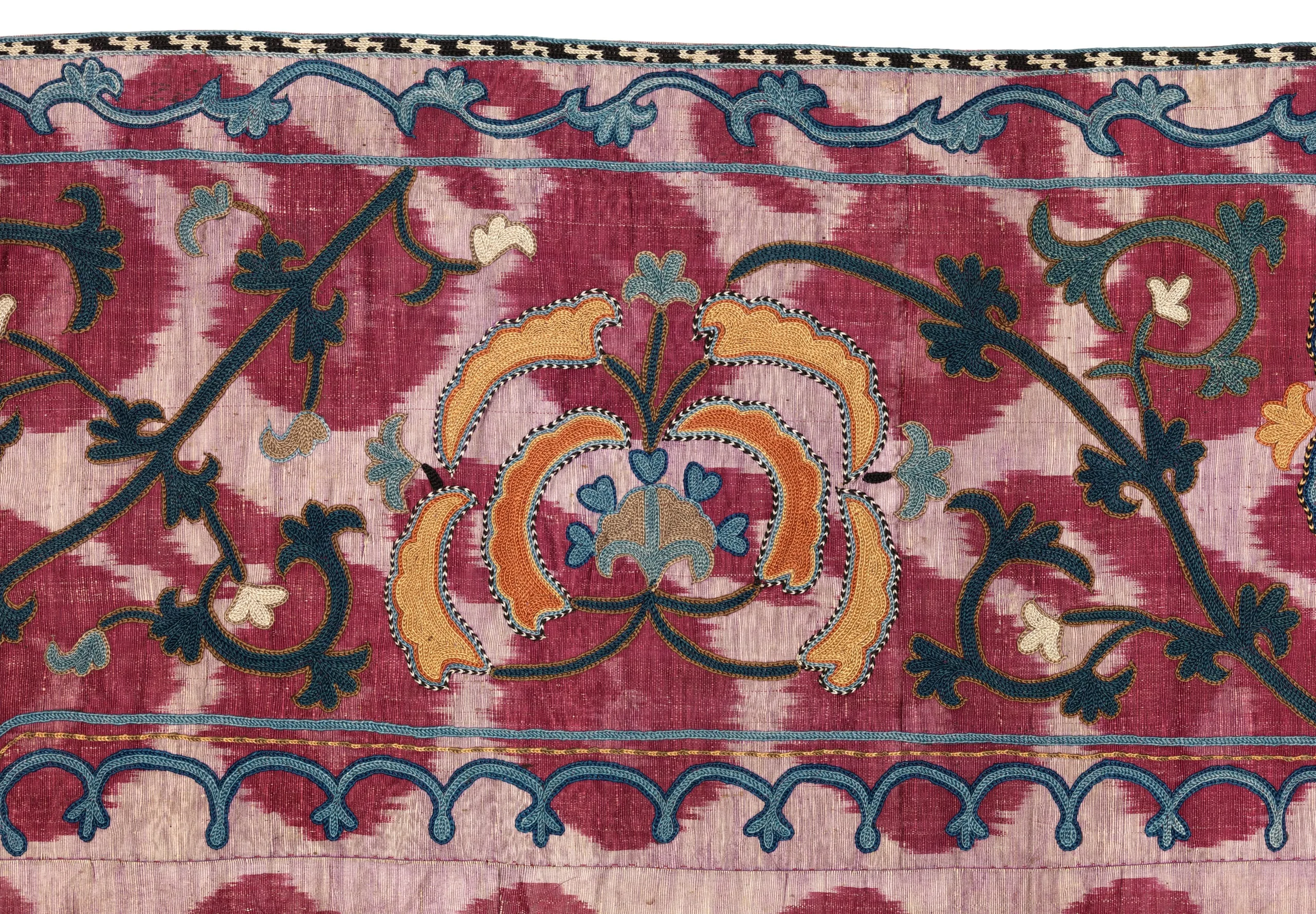 - Silk and cotton plain weave with tie-resist-dyed warp (ikat) (adras), glazed finish, and silk chain-stitch embroidery