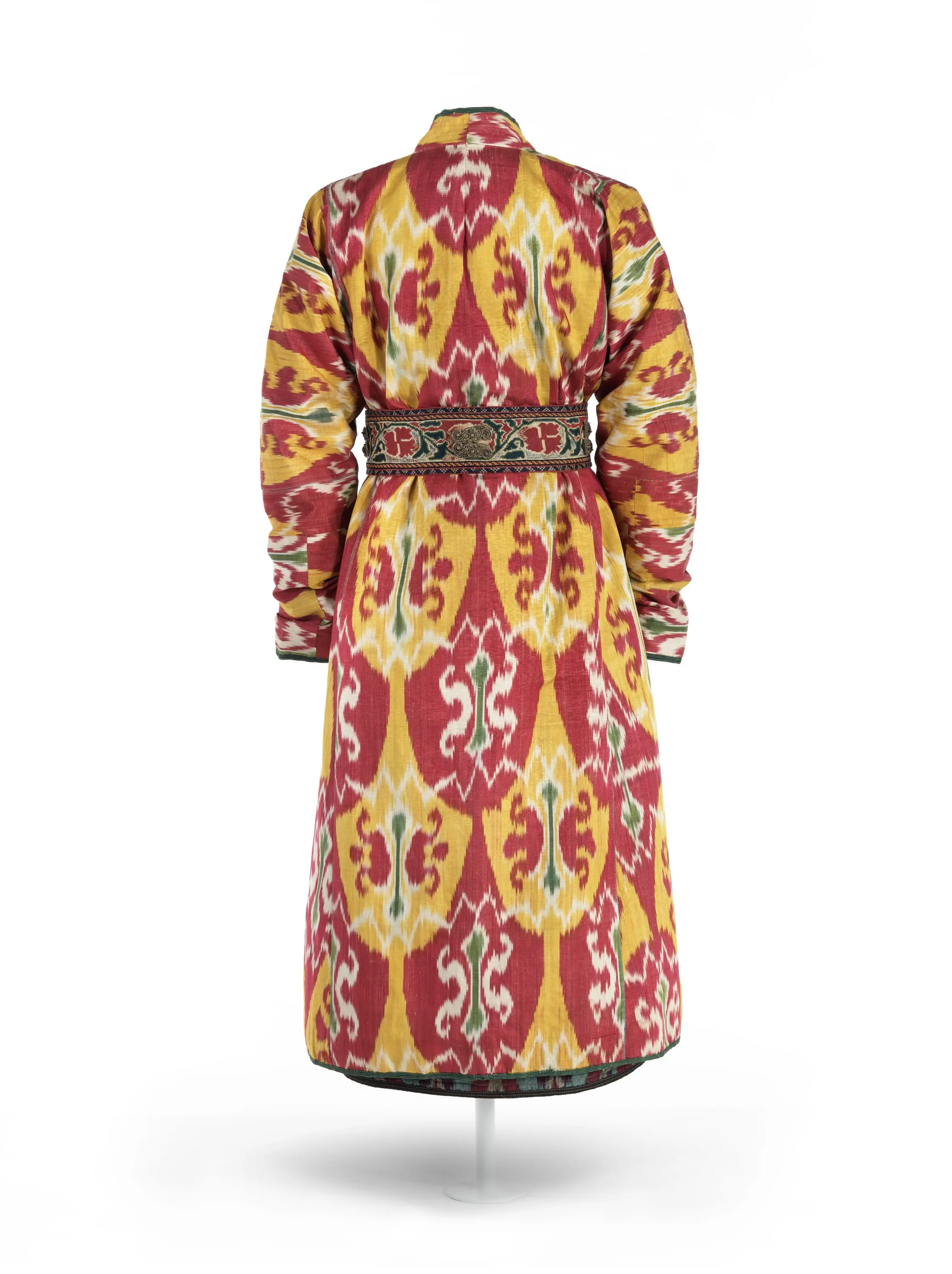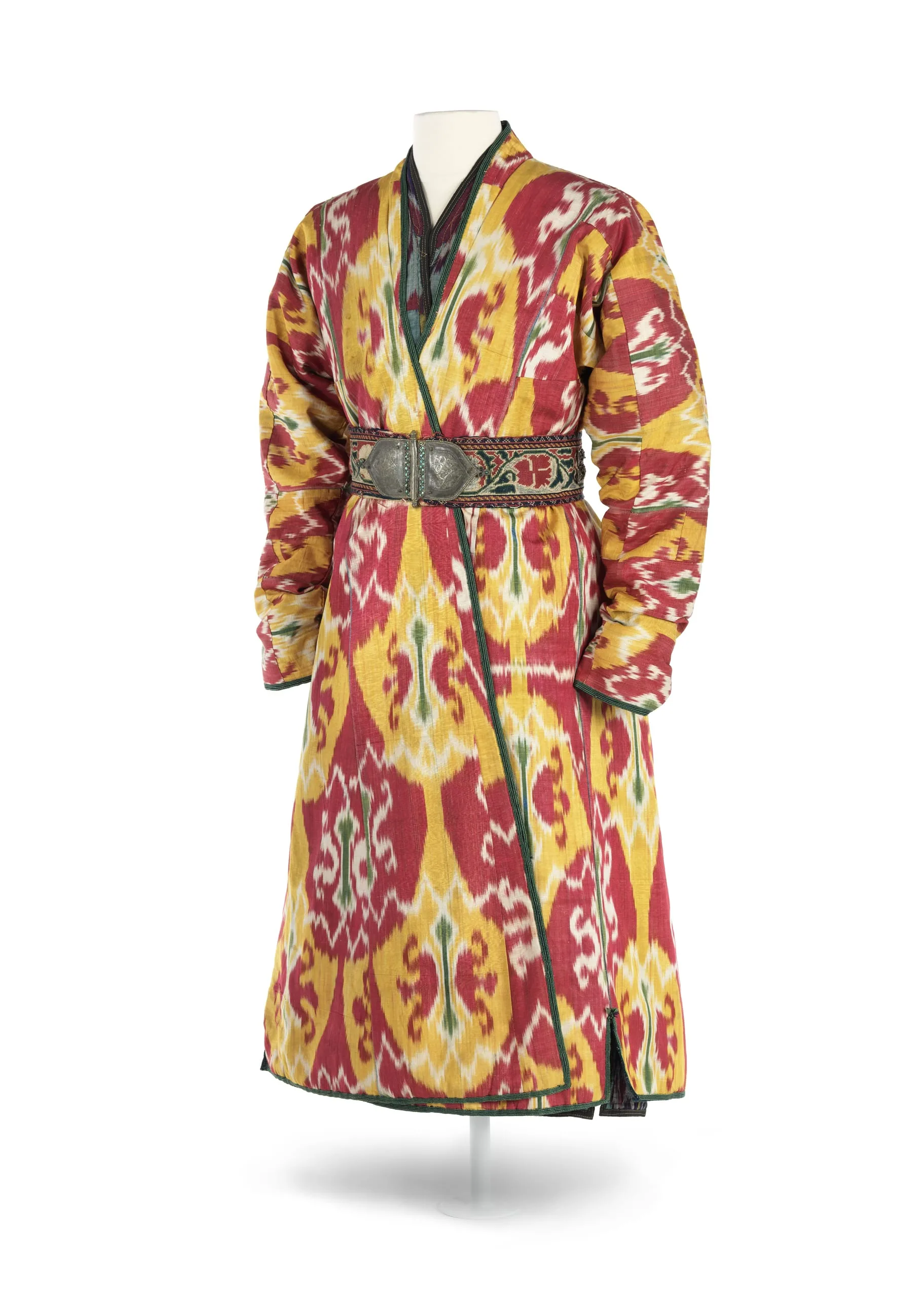 - Silk and cotton plain weave with tie-resist-dyed warp (ikat) (adras), moiré finish, and silk and cotton warp-twined loop manipulation; Lining: cotton plain weave, printed, and silk and cotton plain weave (alacha)