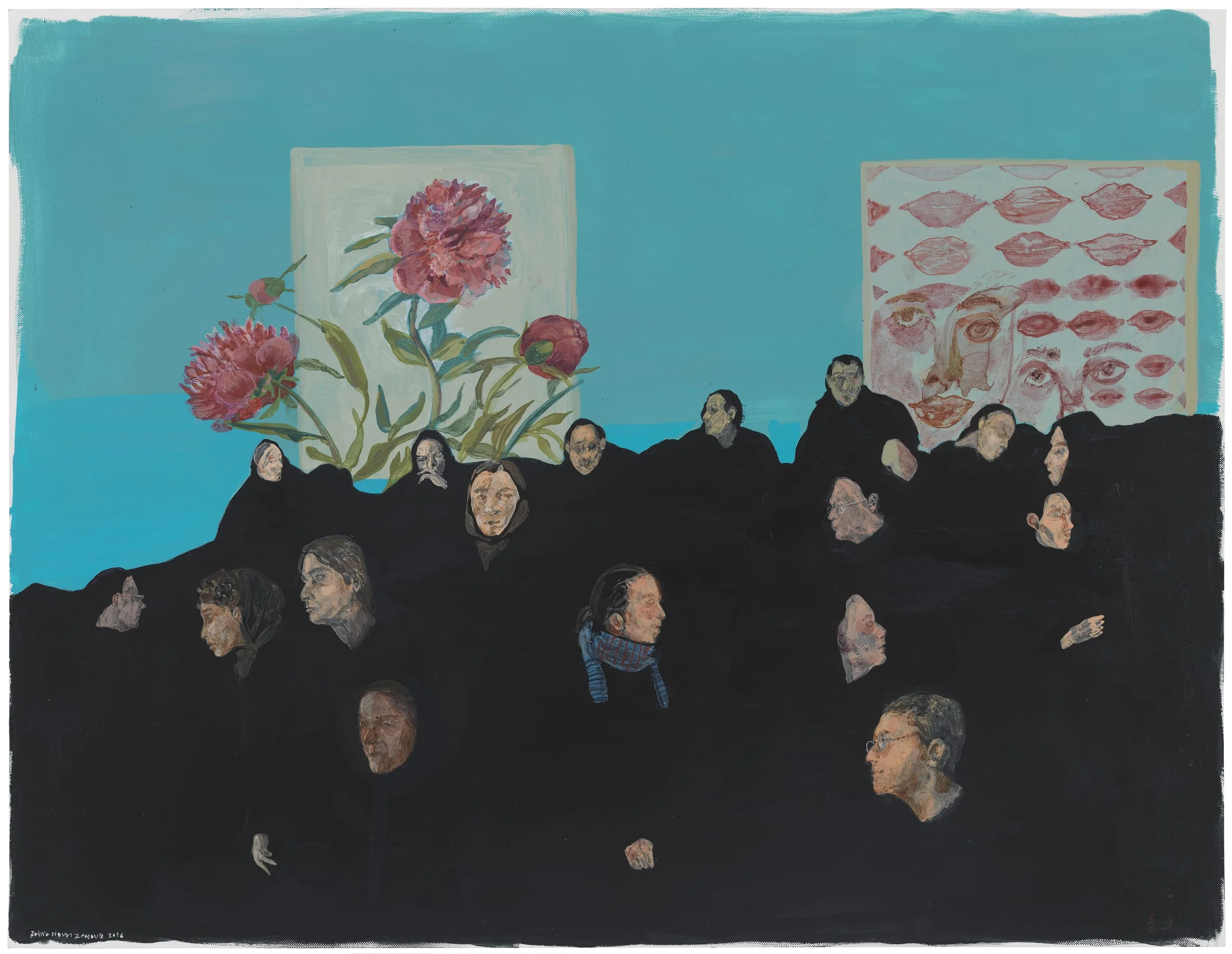 Horizontal painting of a dense crowd of black-clad figures with individual faces, set against turquoise with two painted panels showing peonies and repeated eyes and lips